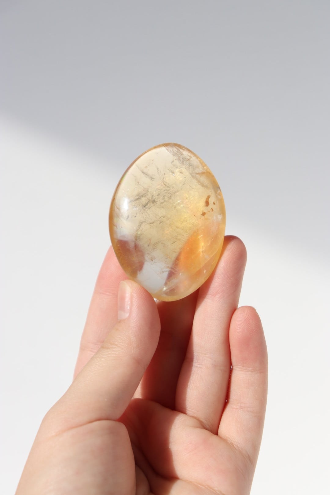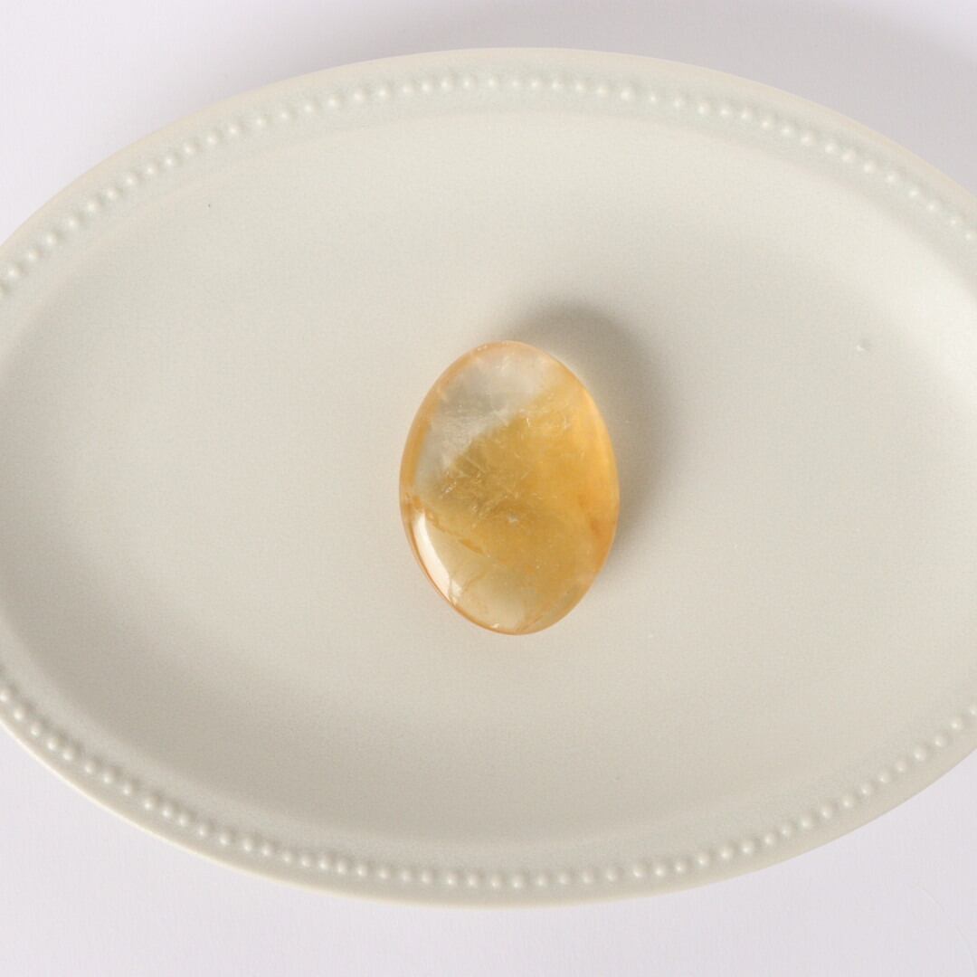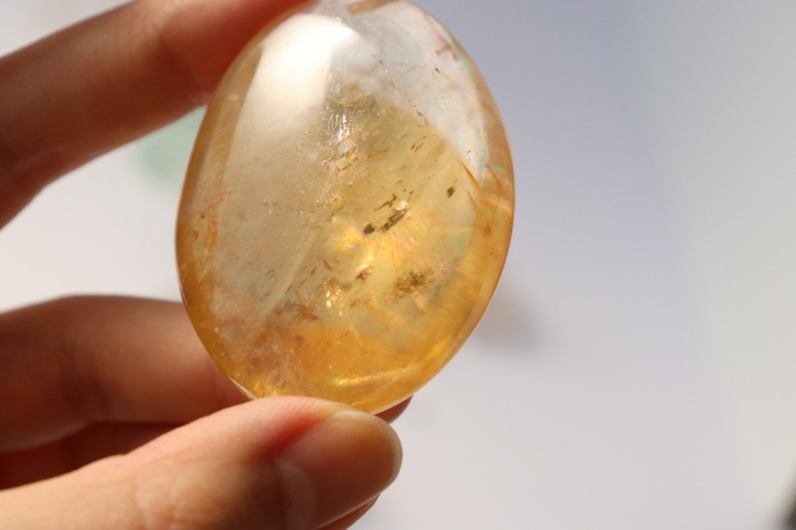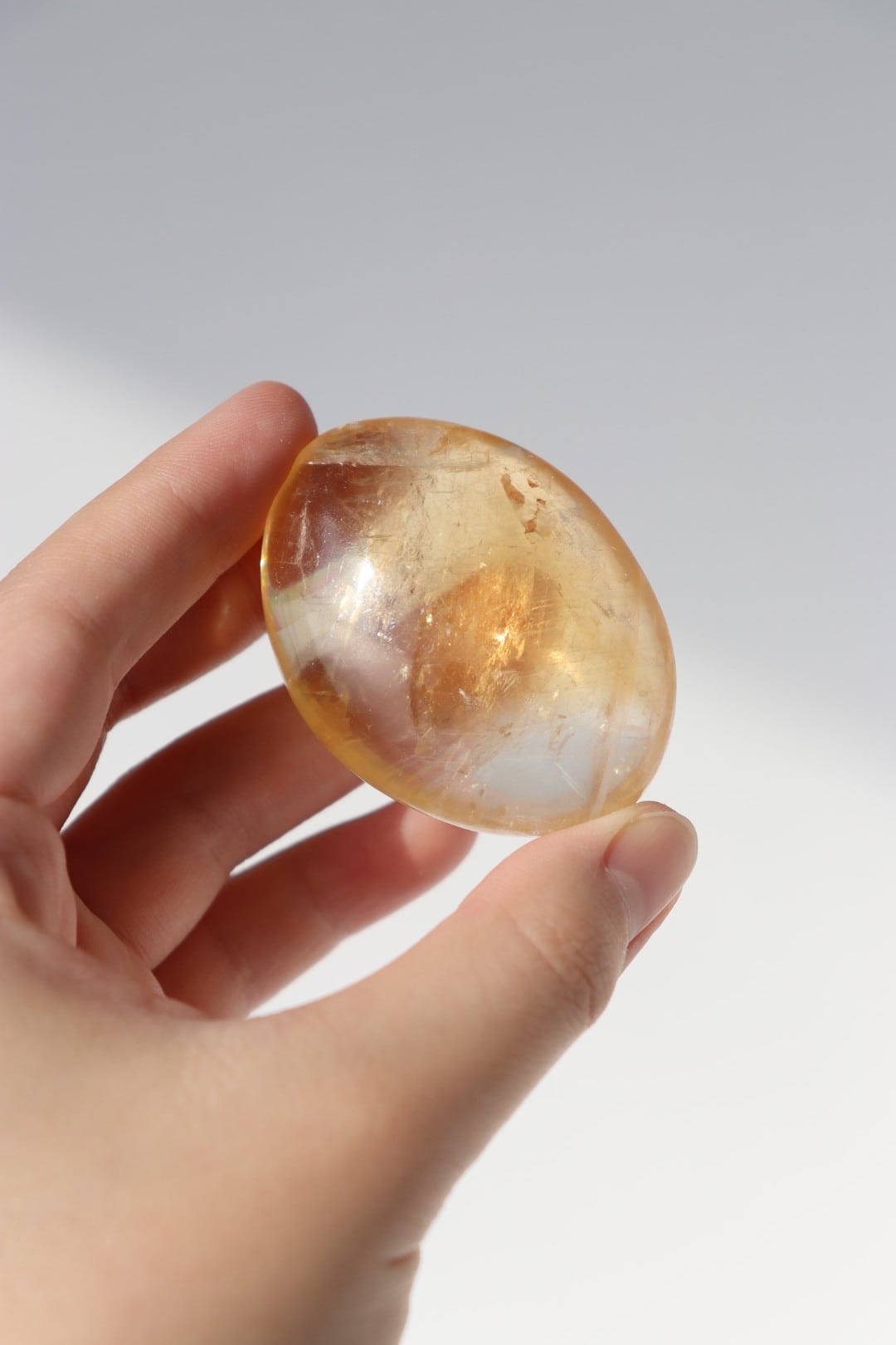 透き通るアンバーの結晶が美しい、ハニーカルサイトの握り石。