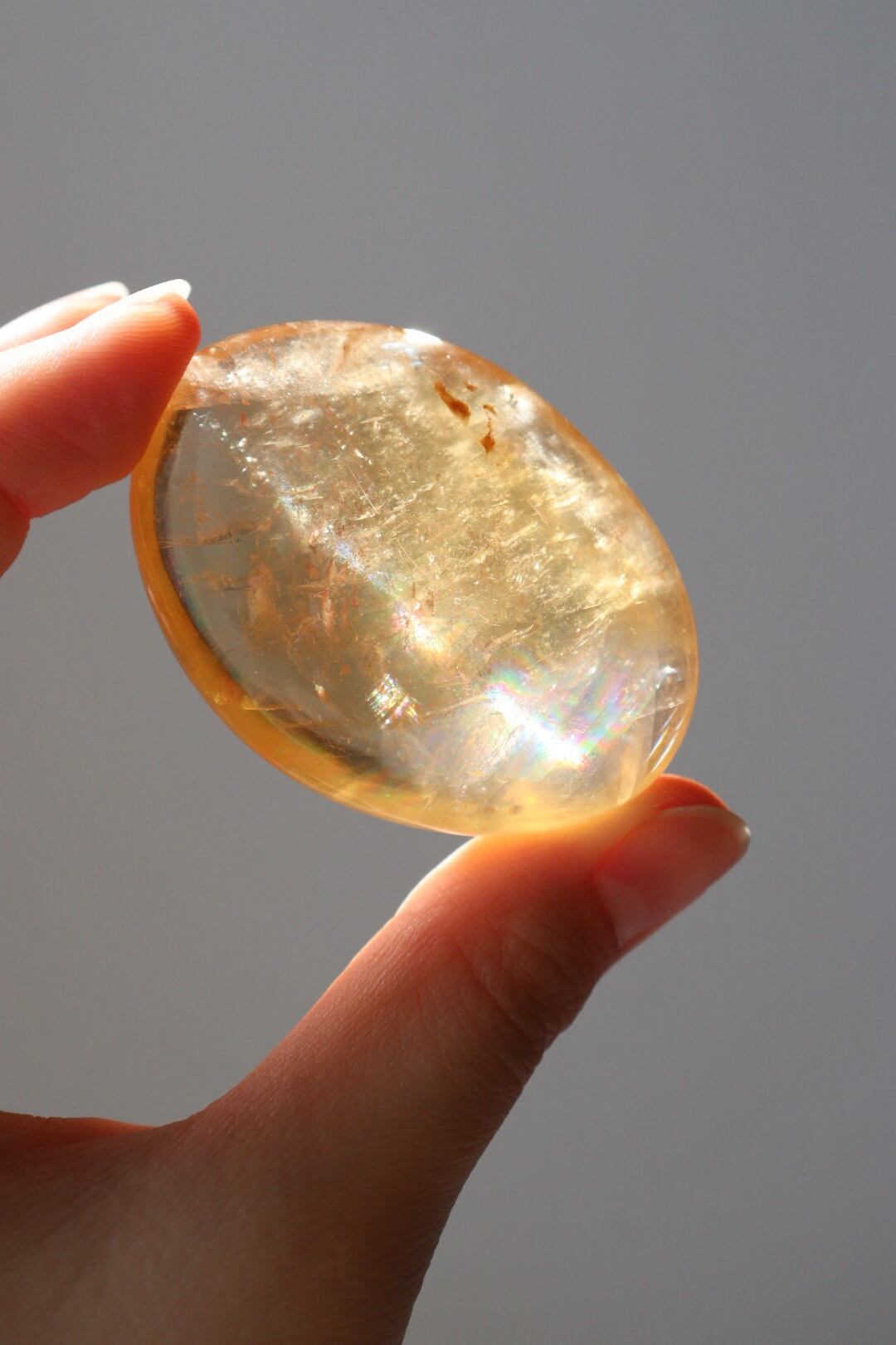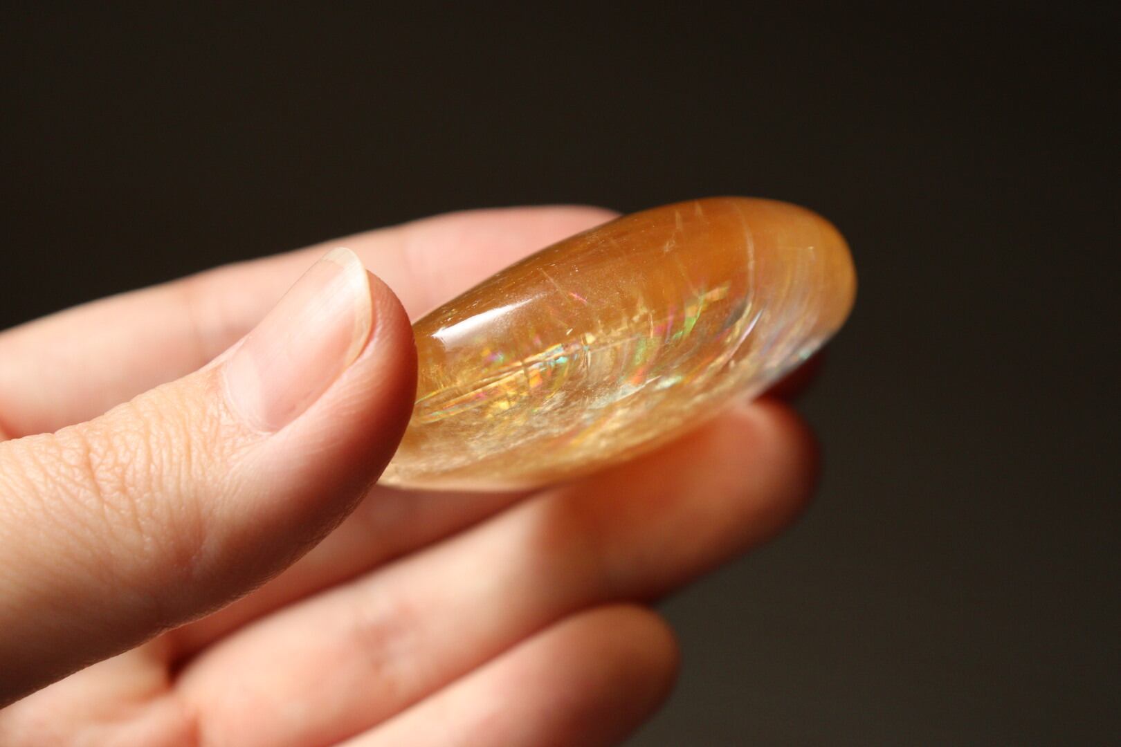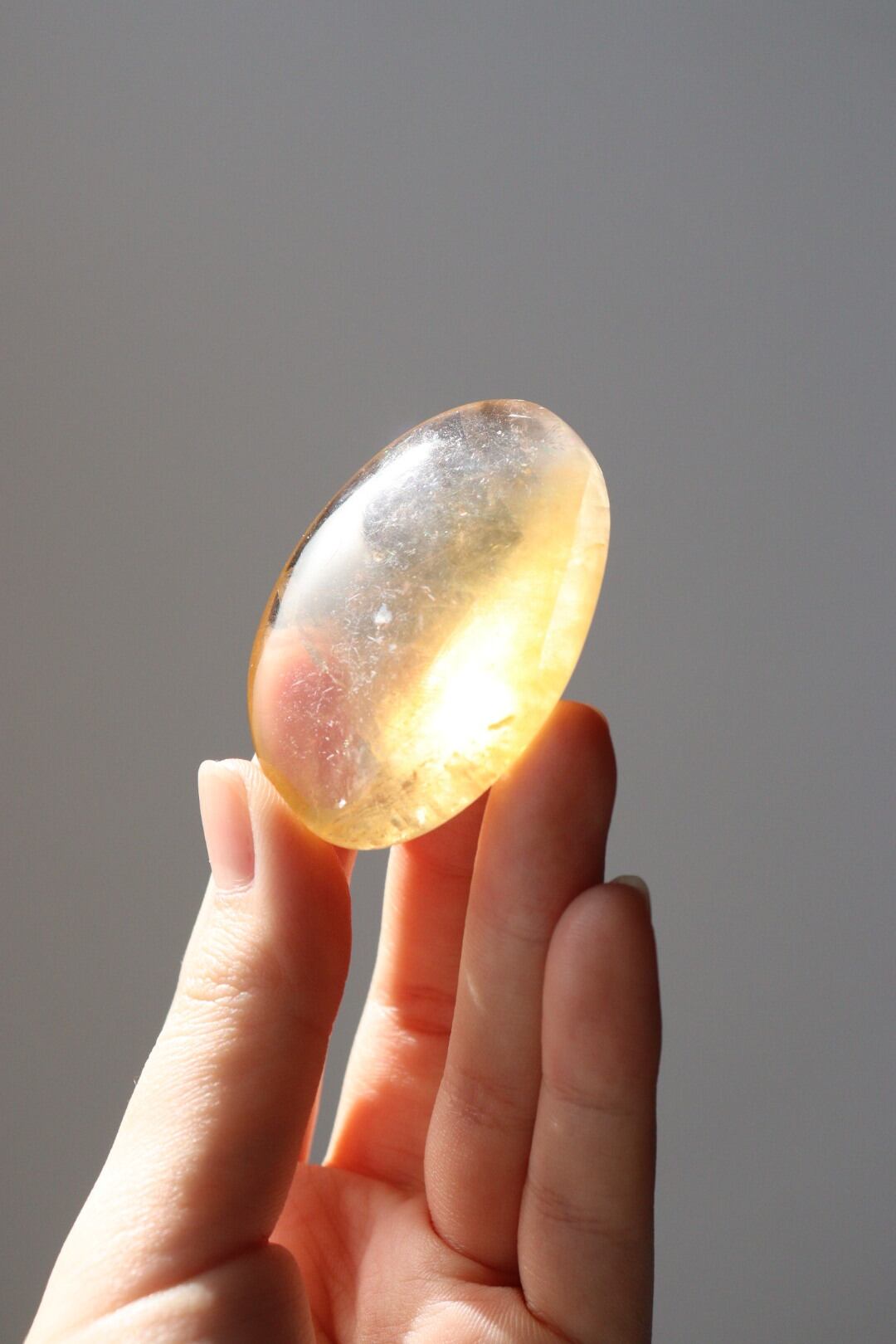 こちらは、まるで光そのものを結晶化させたようなハニーカルサイトの握り石。
