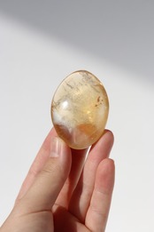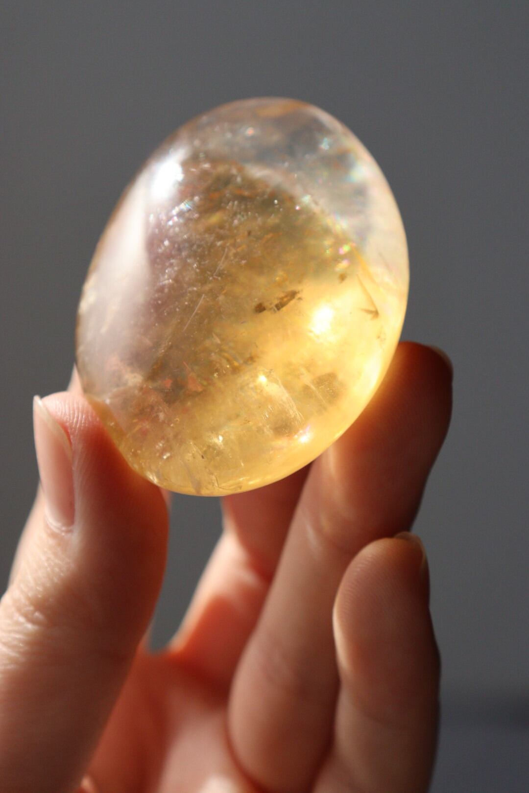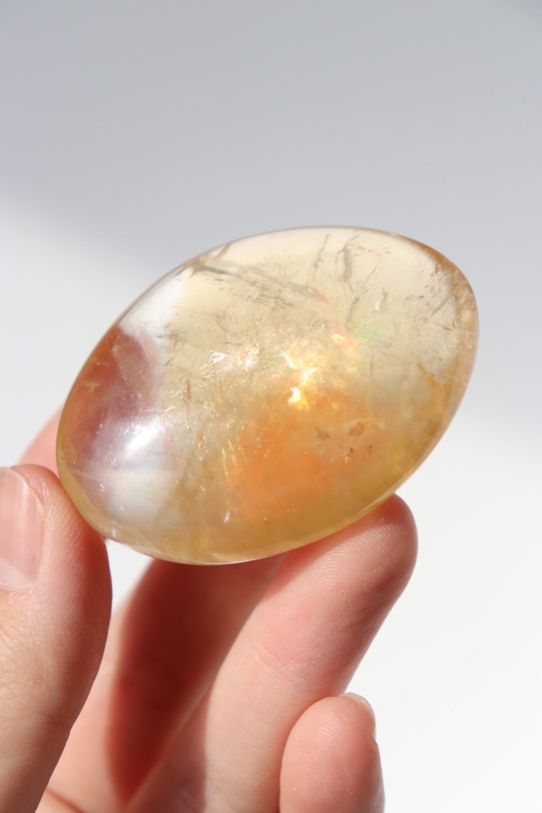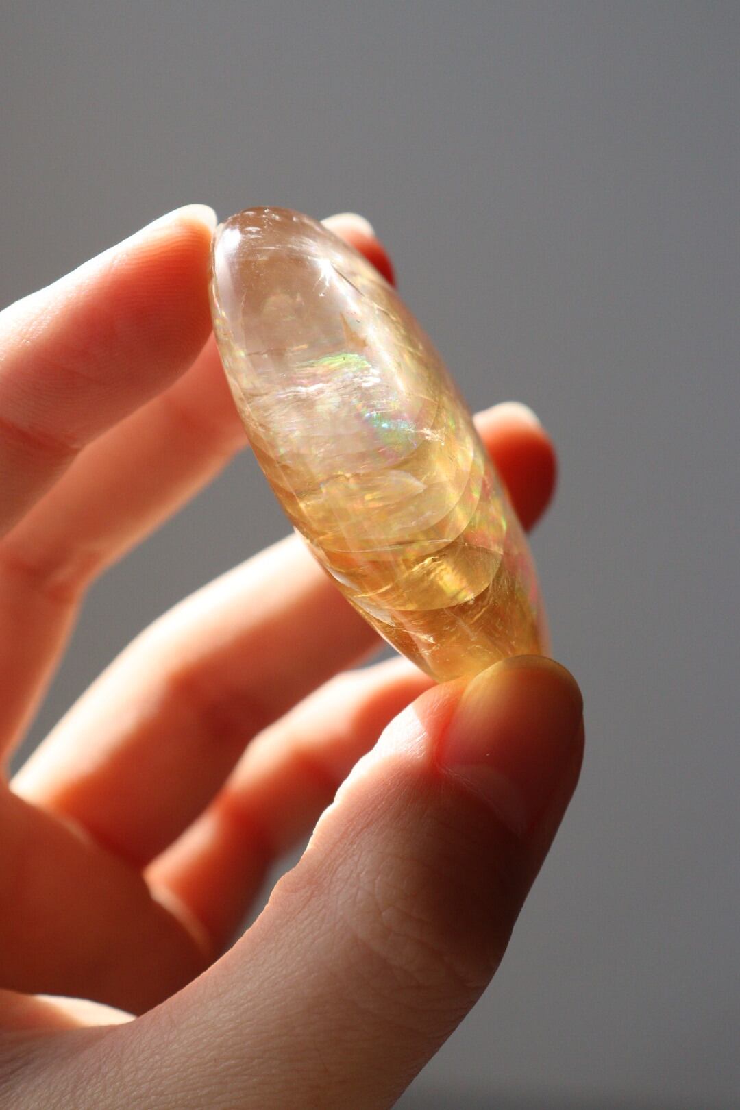 こちらは、まるで光そのものを結晶化させたようなハニーカルサイトの握り石。
