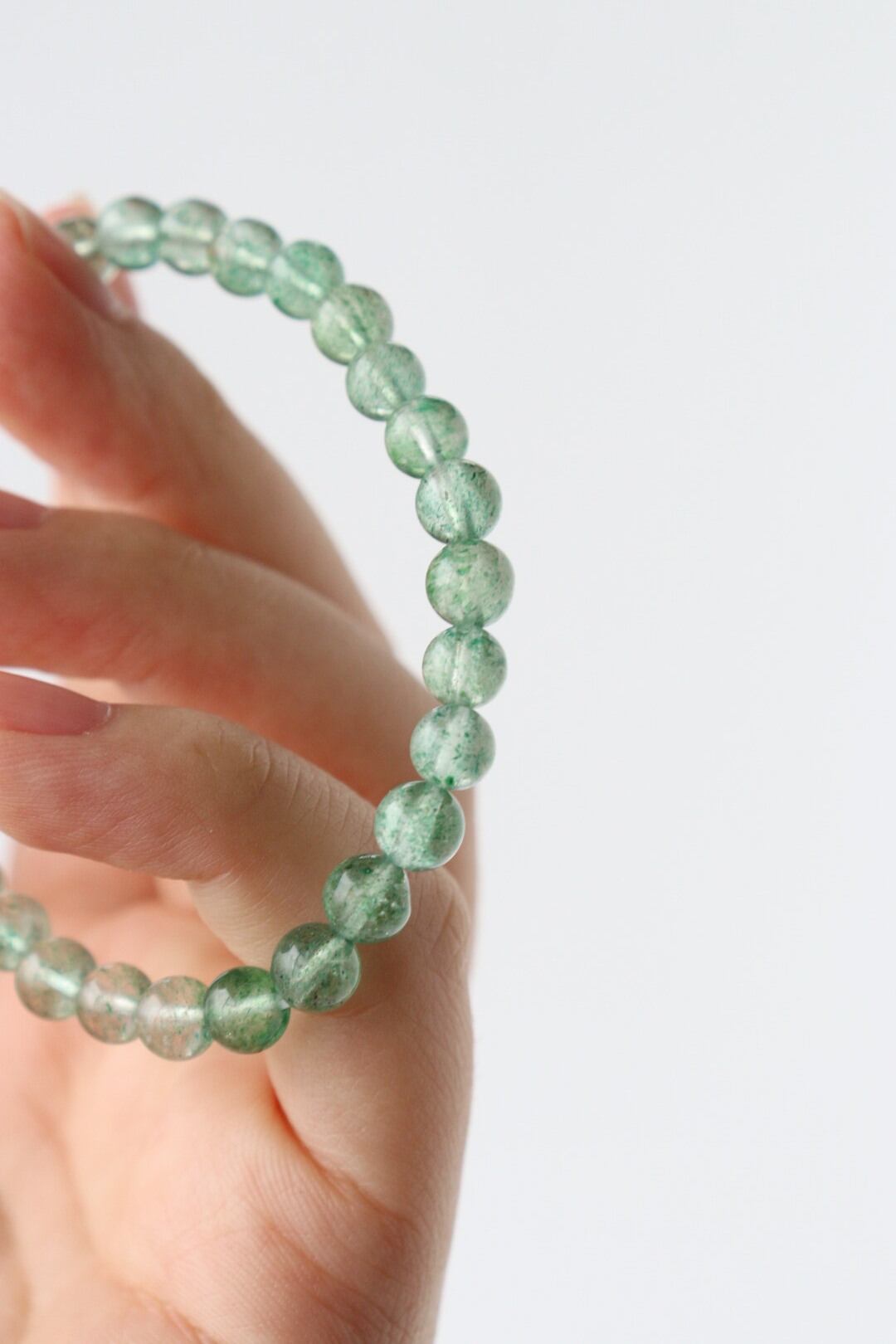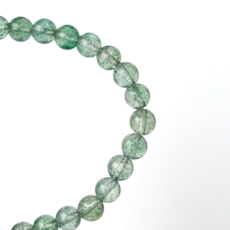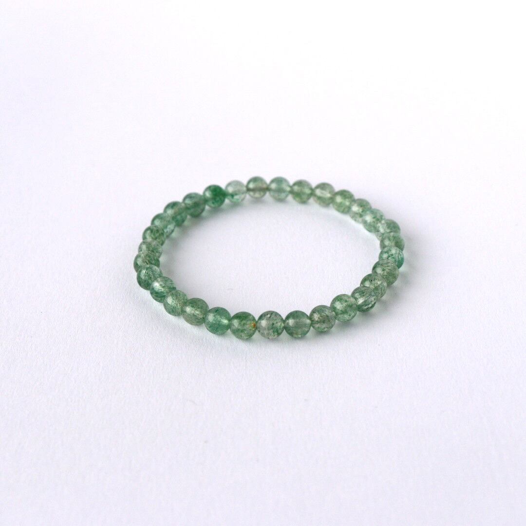 透明感のある水晶の中にグリーンの小さな粒がふわりと散りばめられた、グリーンストロインクォーツのブレスレット。