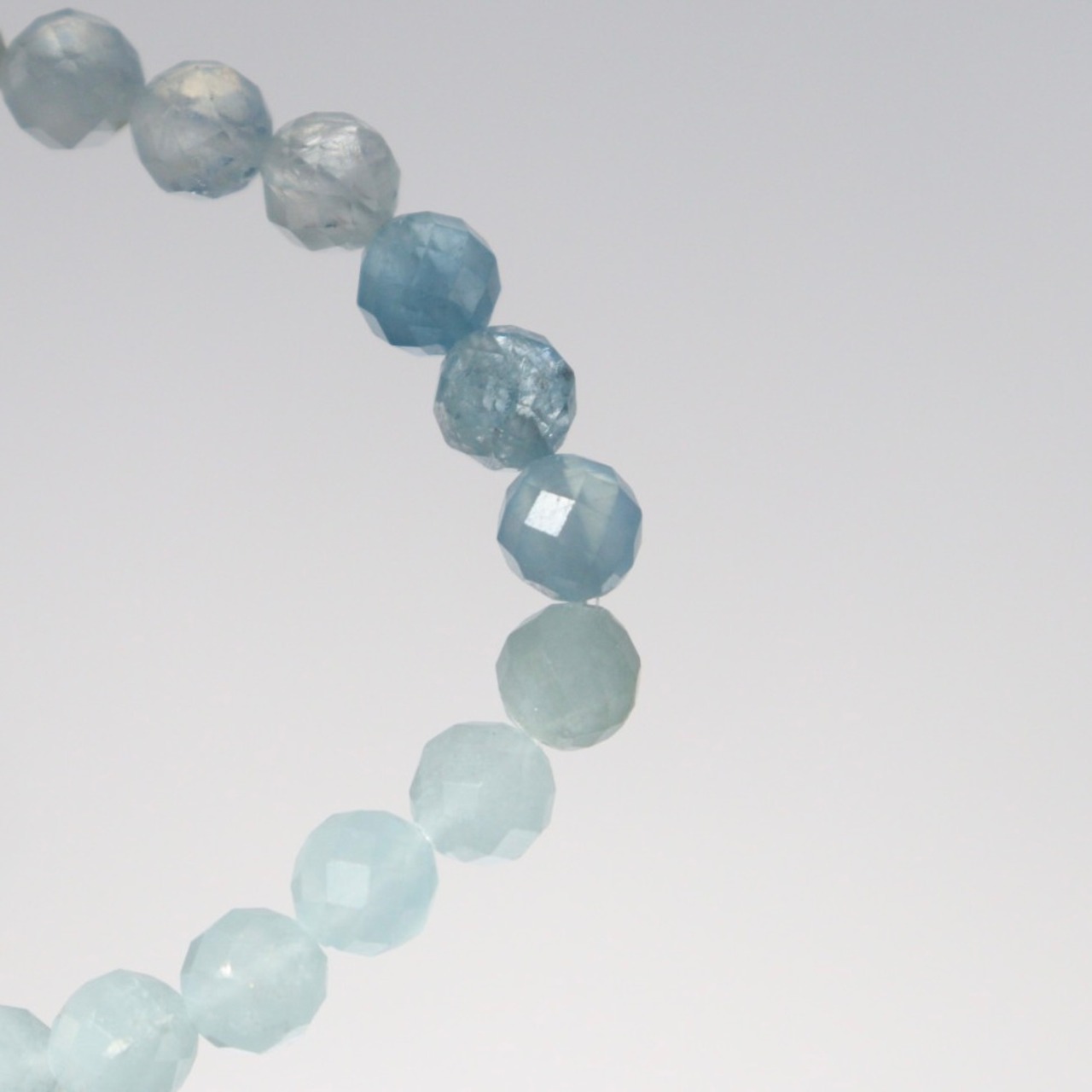 透明感のある粒から白色を帯びたやさしいブルーまで、豊かな表情を見せてくれるアクアマリンのブレスレット。