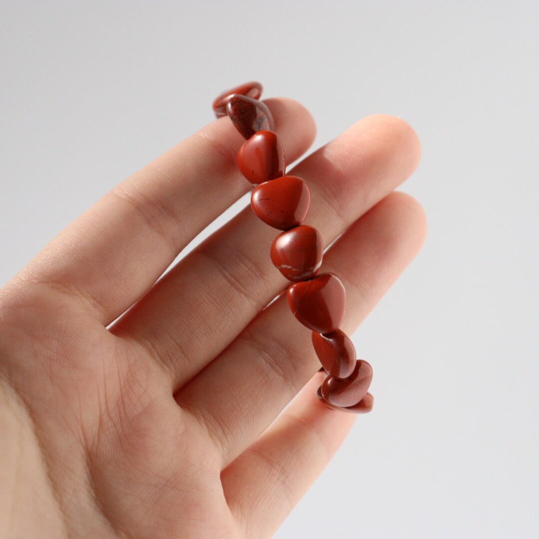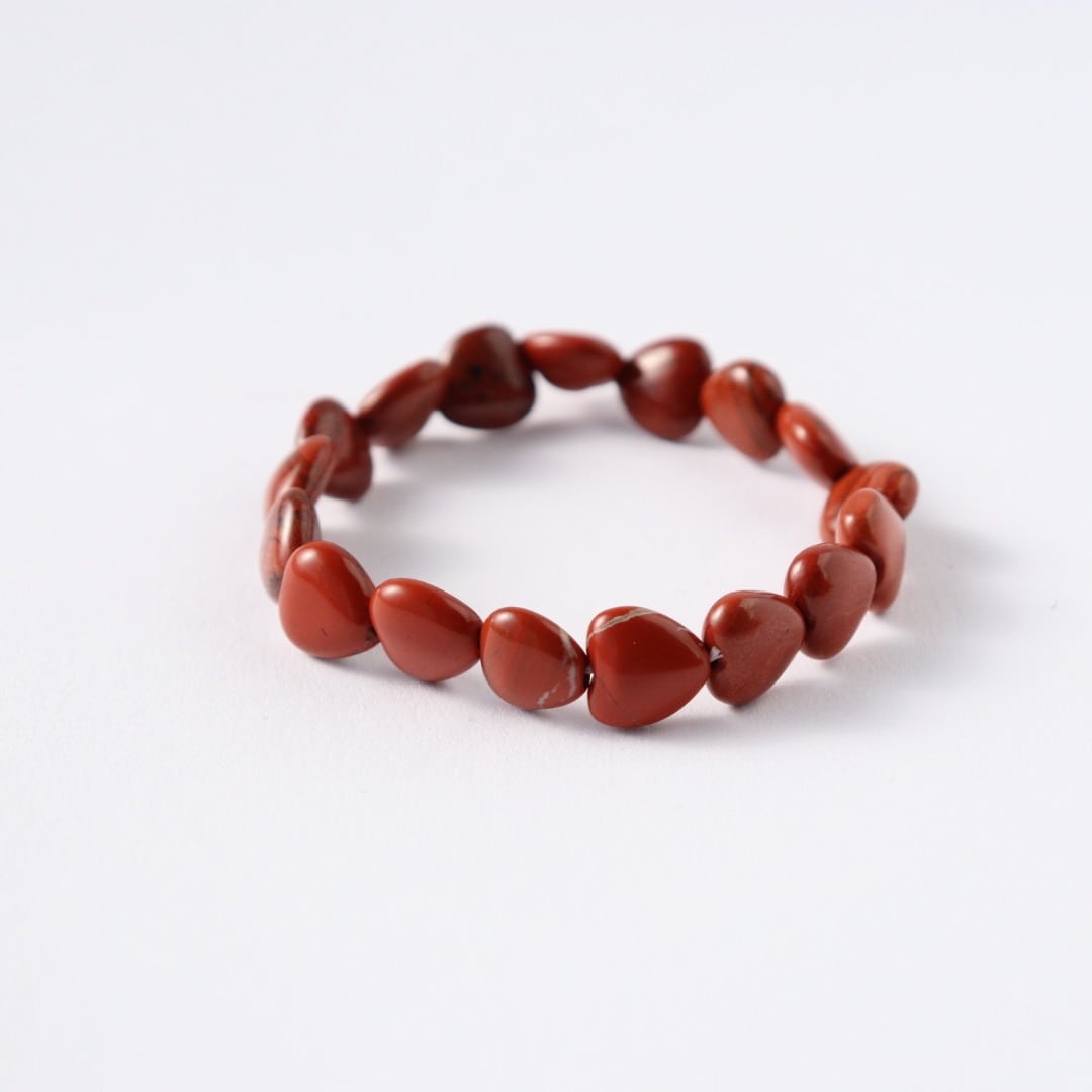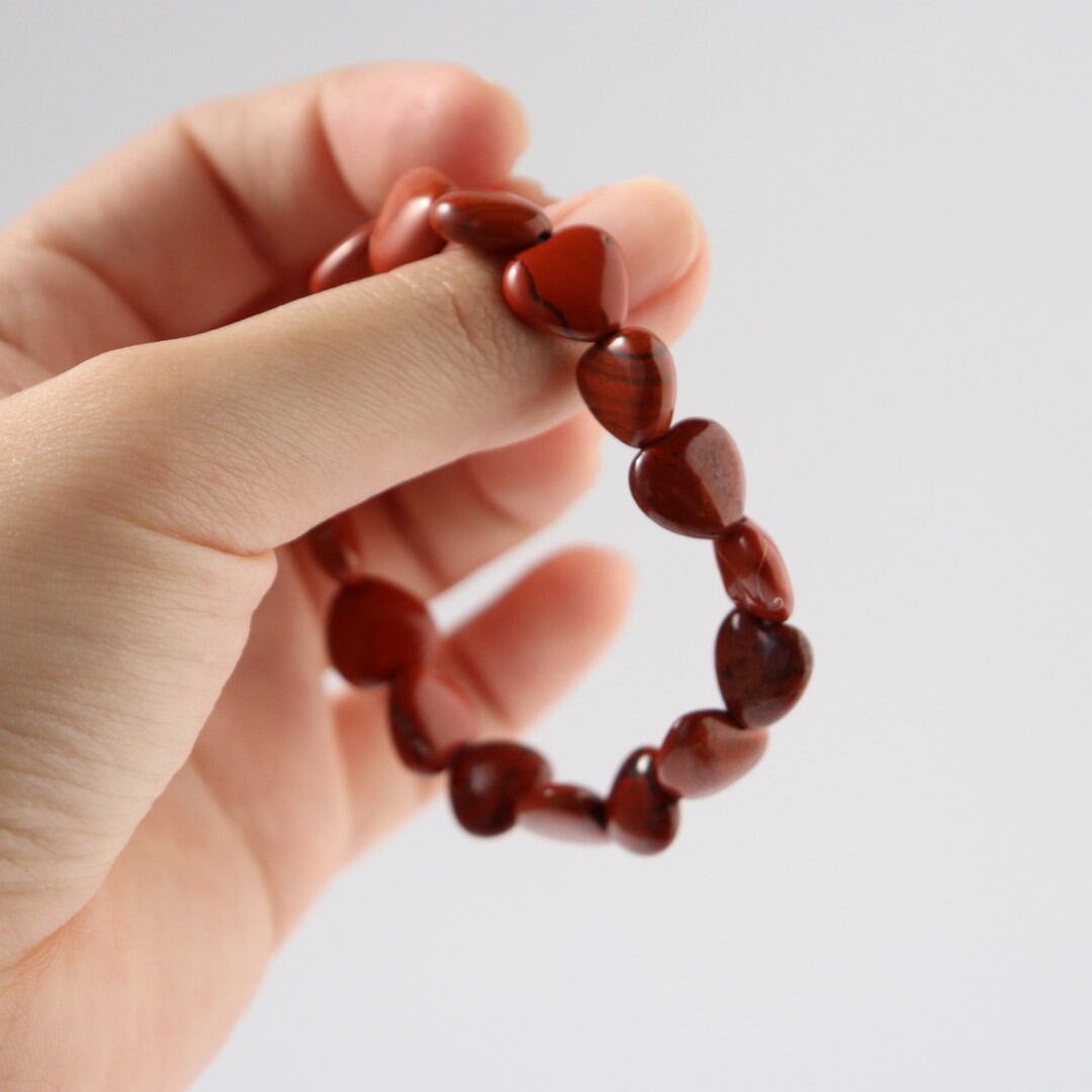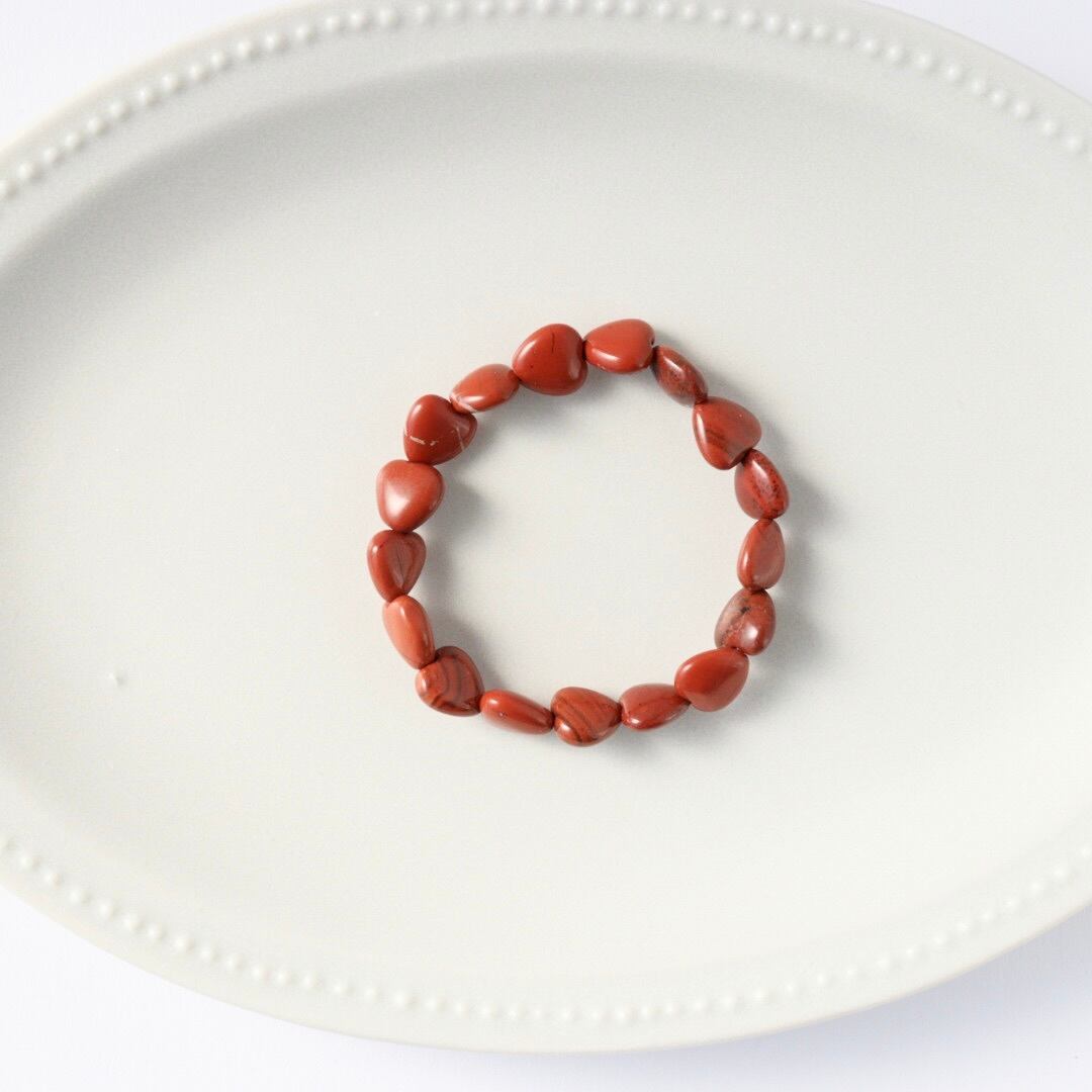 深みのある赤とマットな質感に大地のような落ち着きが宿る、レッドジャスパーのハートブレスレット。滑らかなハートの形が手元を優しく彩ります。