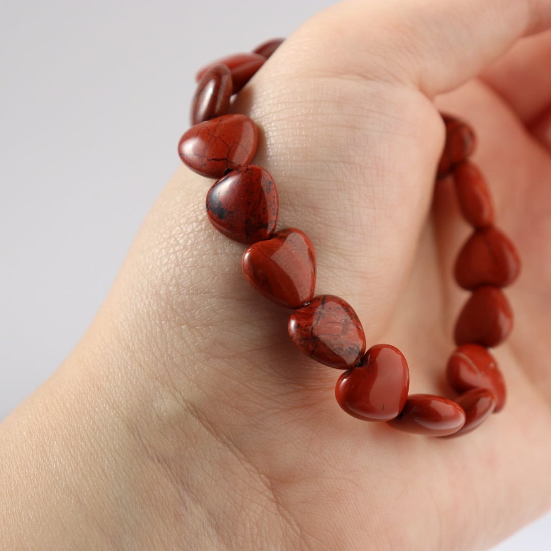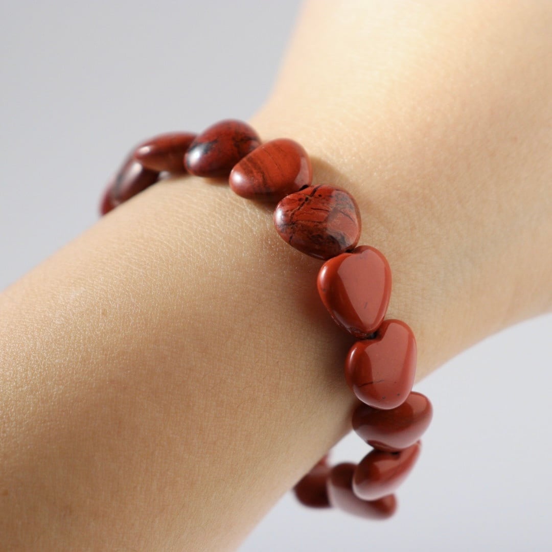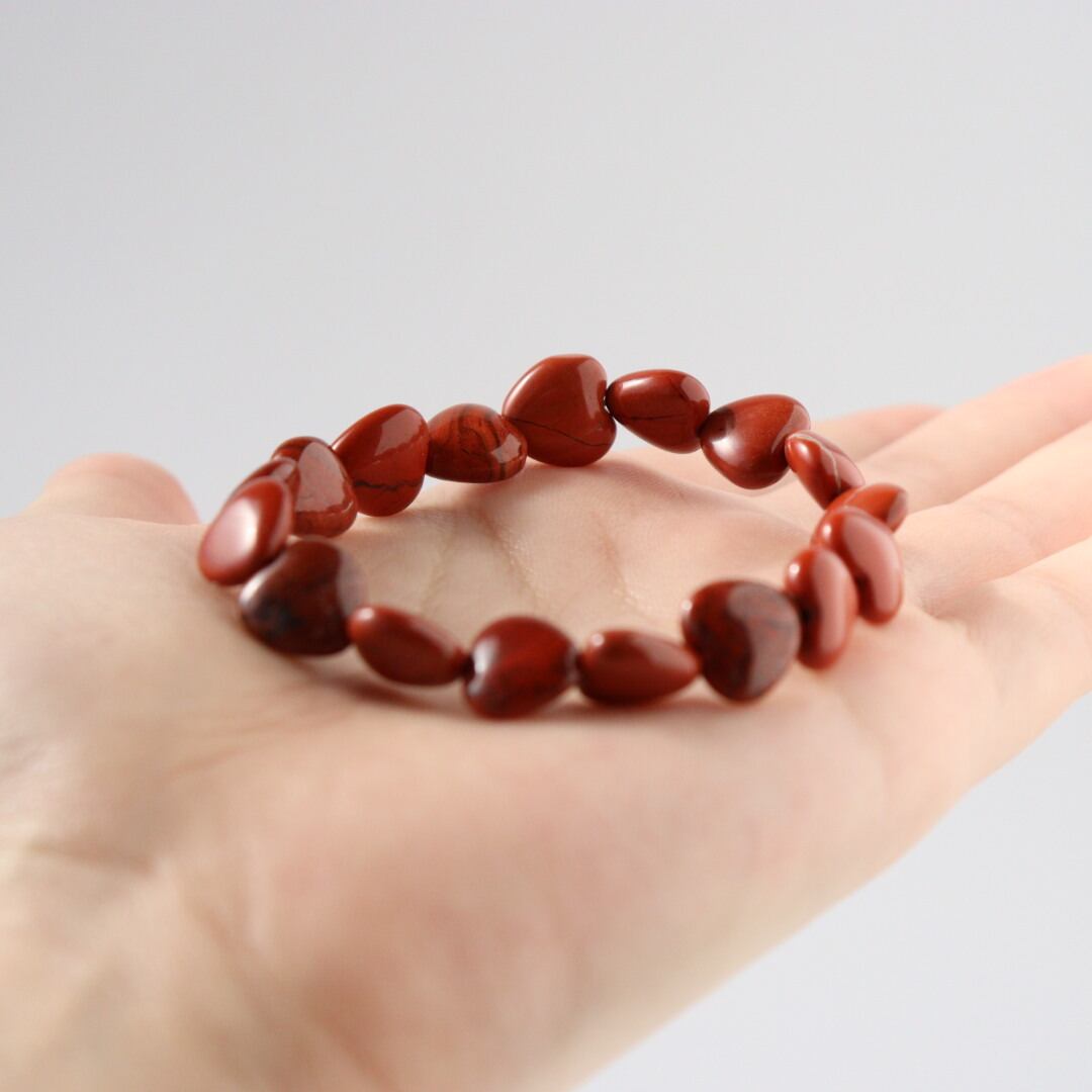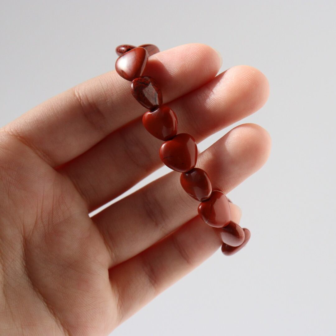深みのある赤とマットな質感に大地のような落ち着きが宿る、レッドジャスパーのハートブレスレット。滑らかなハートの形が手元を優しく彩ります。