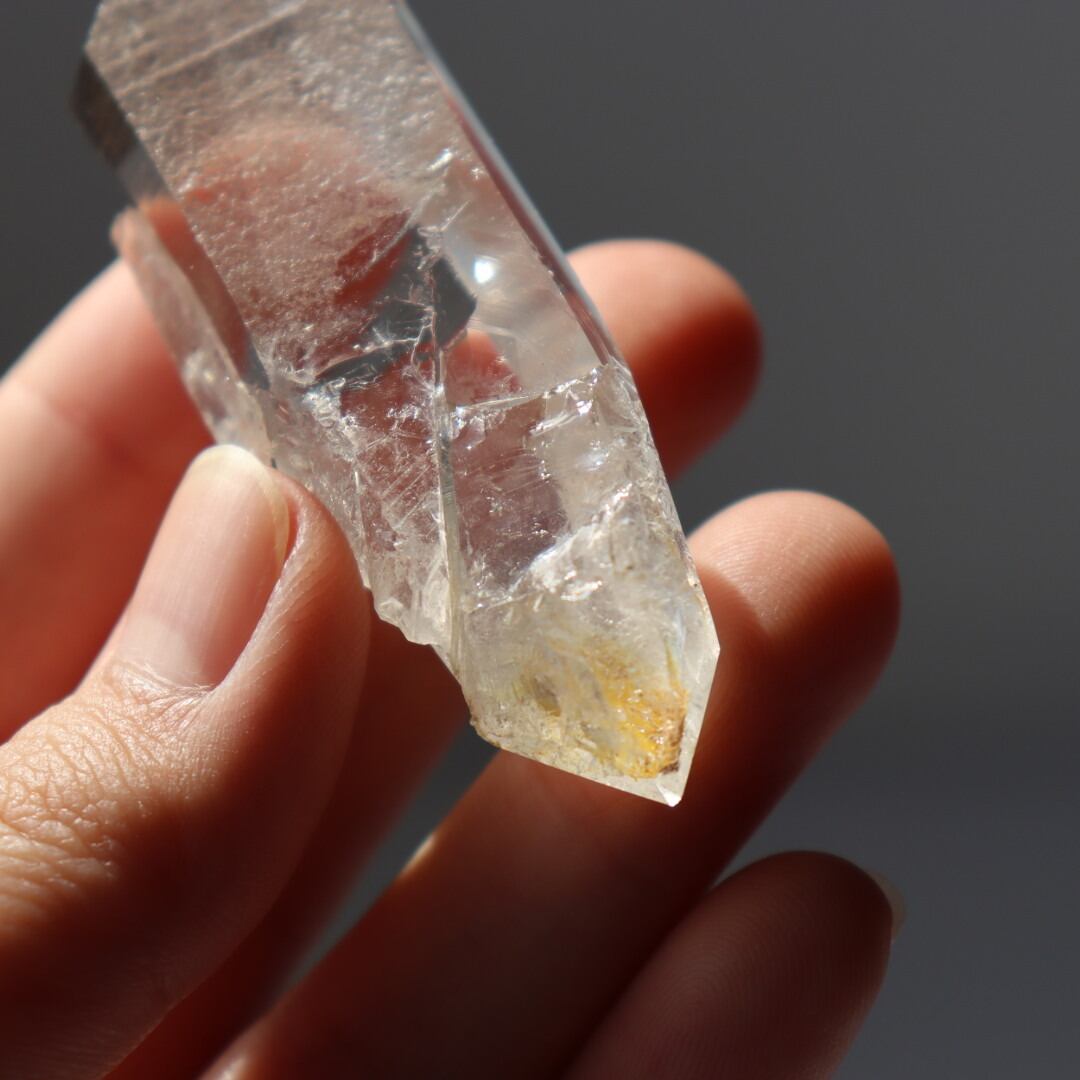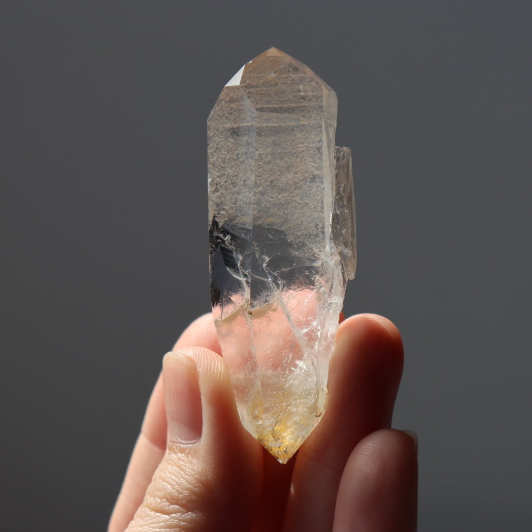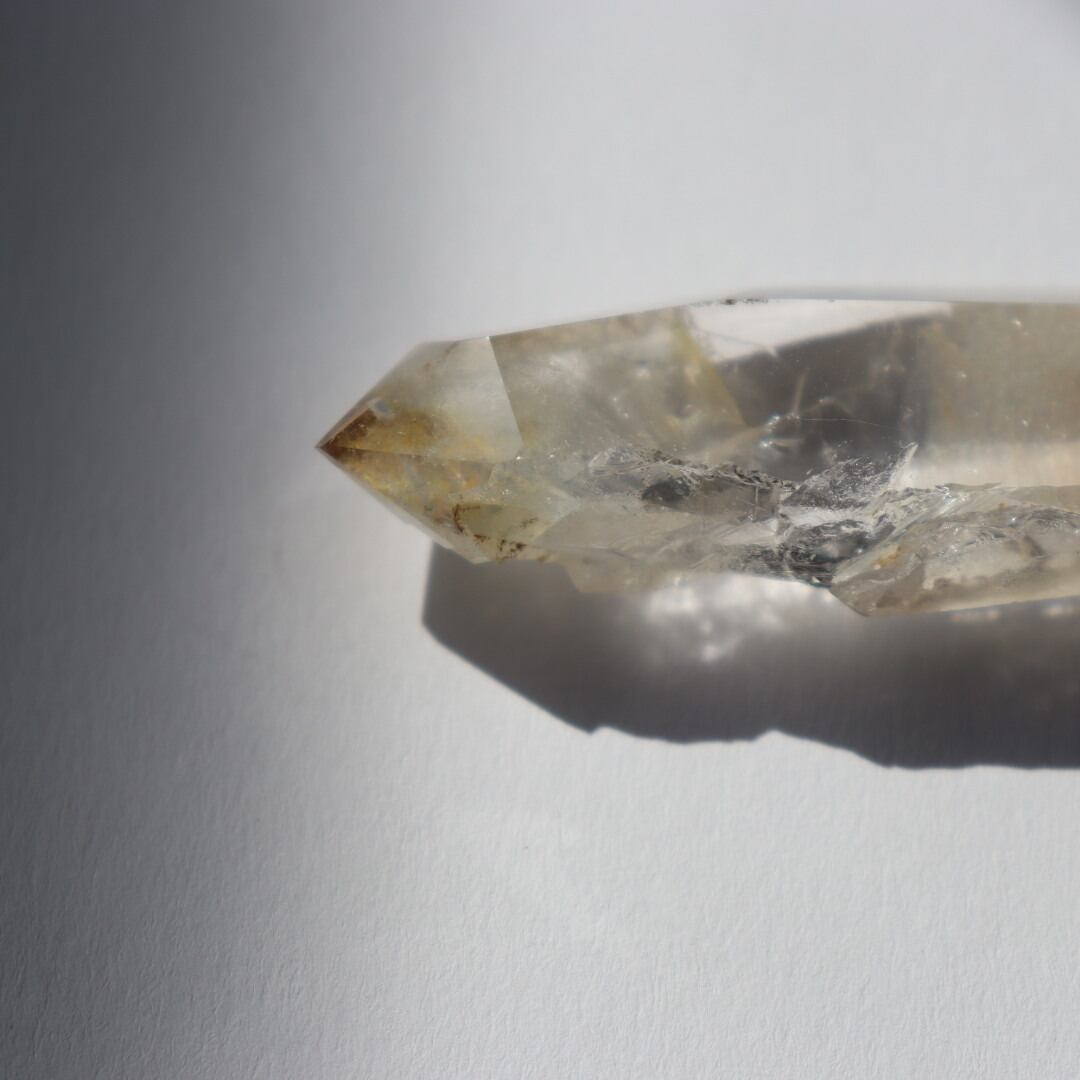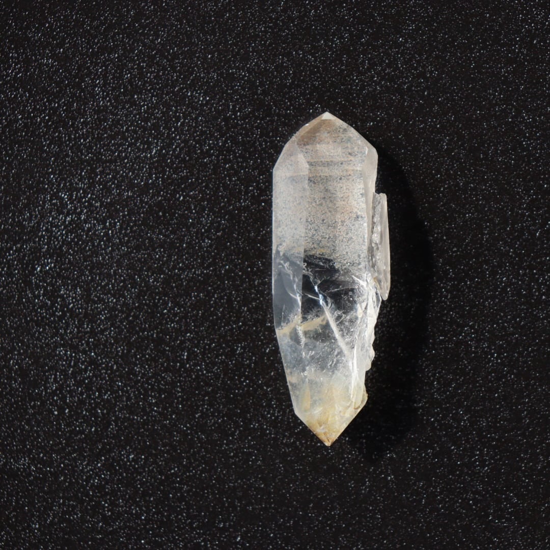 こちらはほんのりイエローに発色した不思議な魅力のダブルポイント。正面は磨かれ、驚くほどクリアな結晶の奥行きを堪能できます。