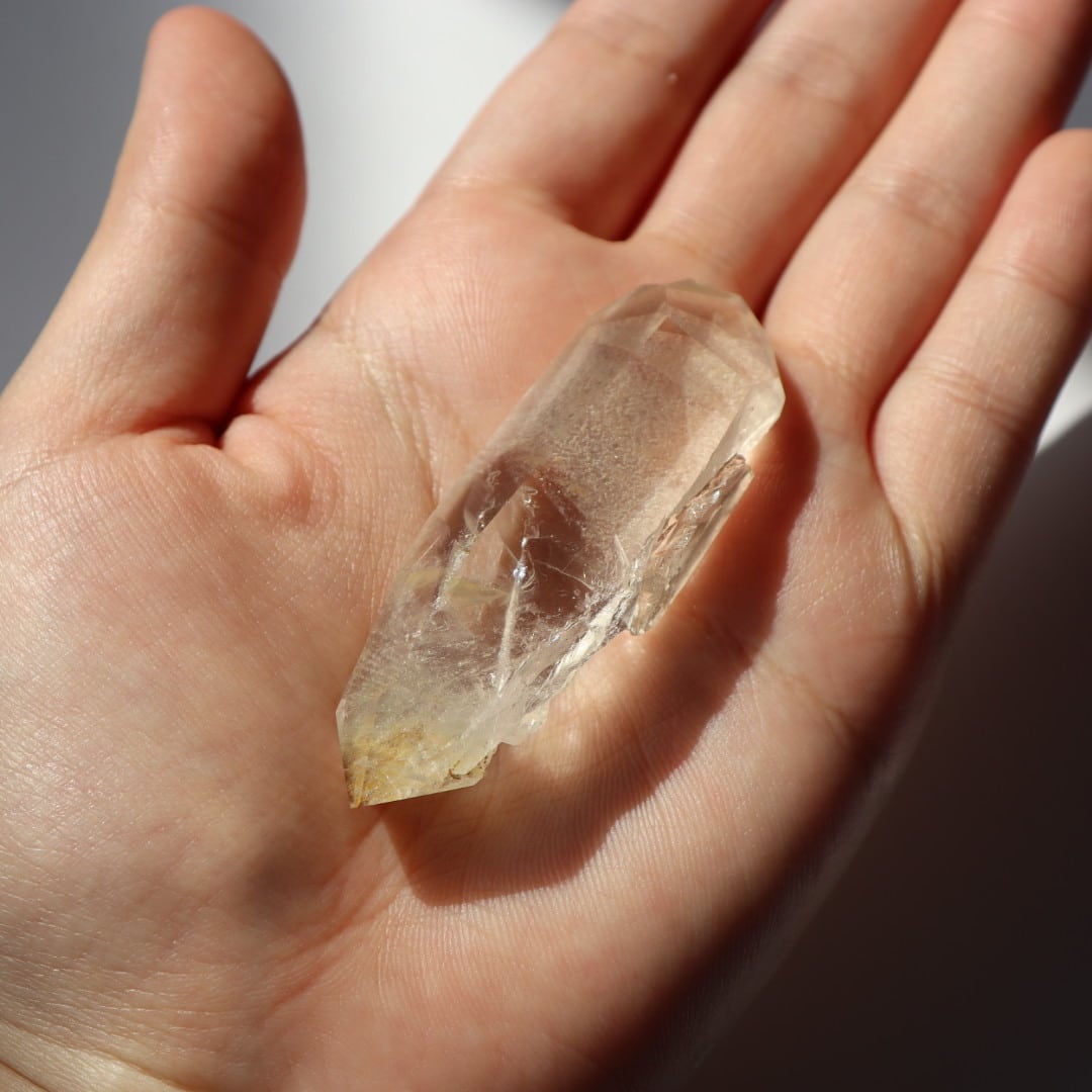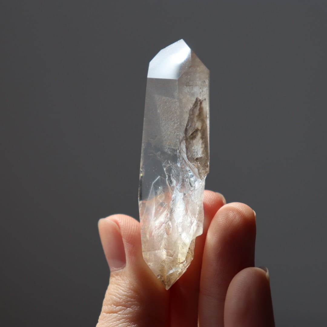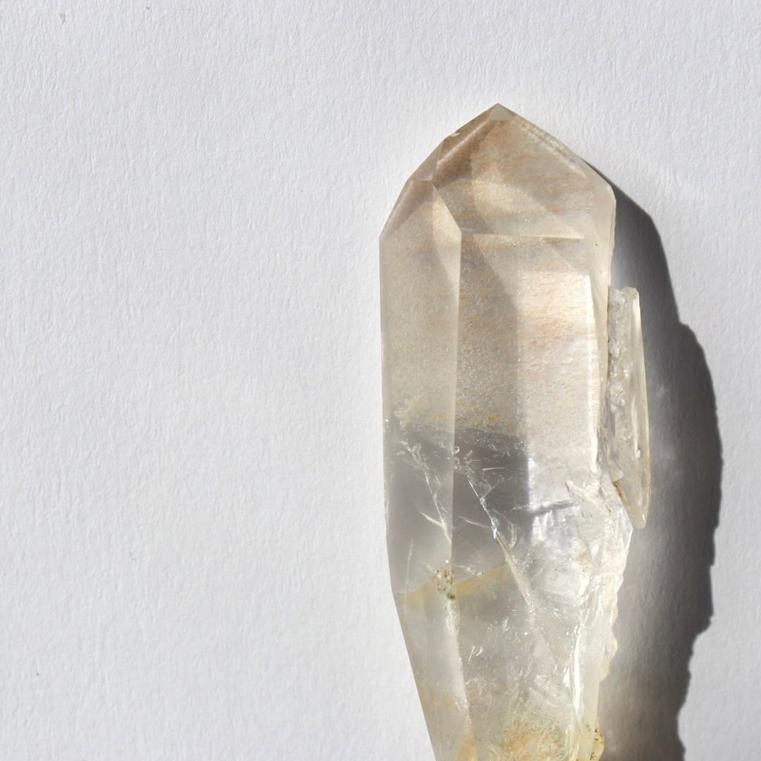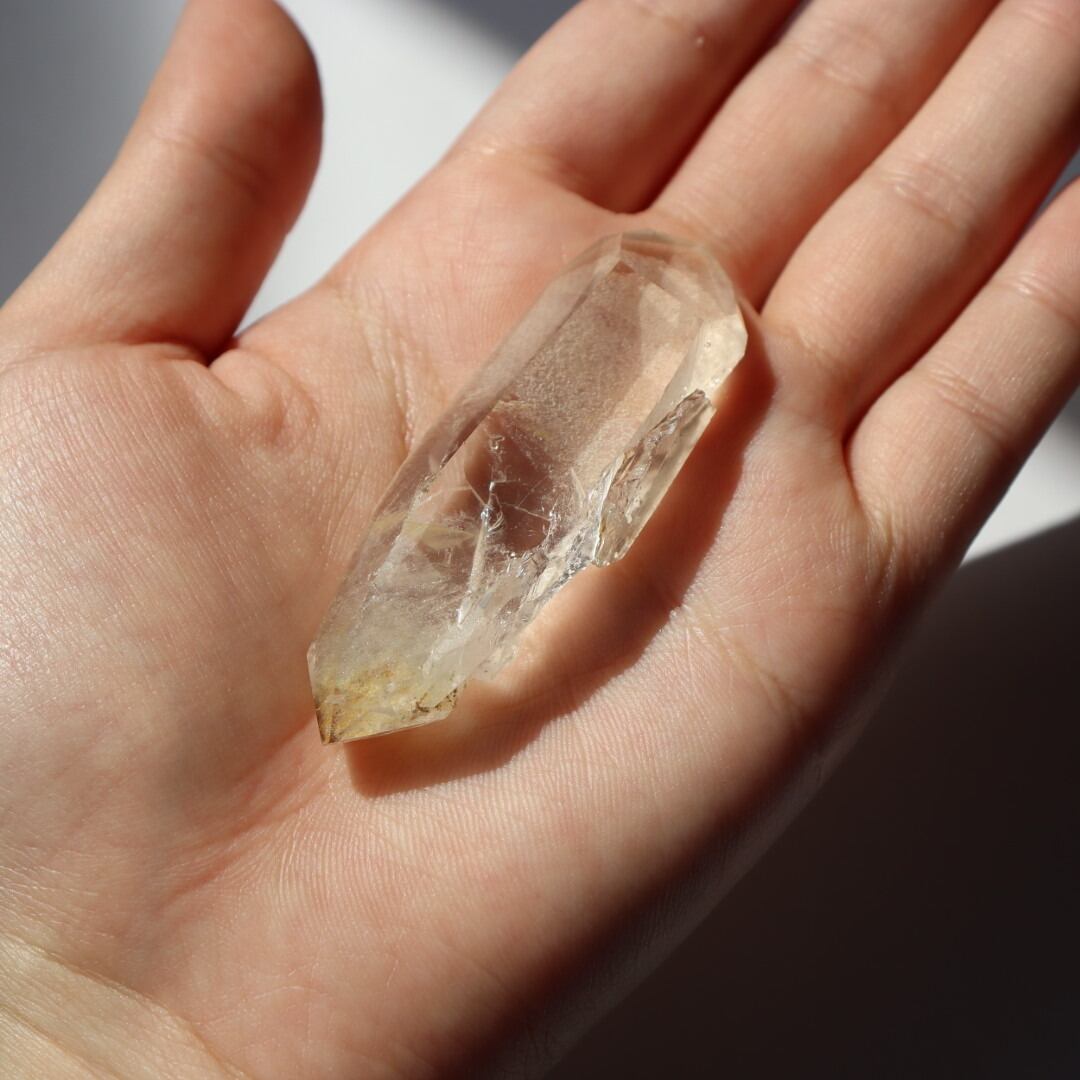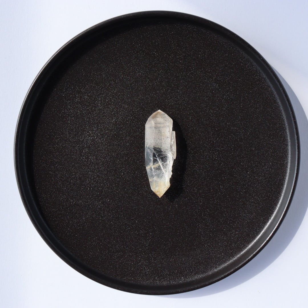 こちらはほんのりイエローに発色した不思議な魅力のダブルポイント。正面は磨かれ、驚くほどクリアな結晶の奥行きを堪能できます。