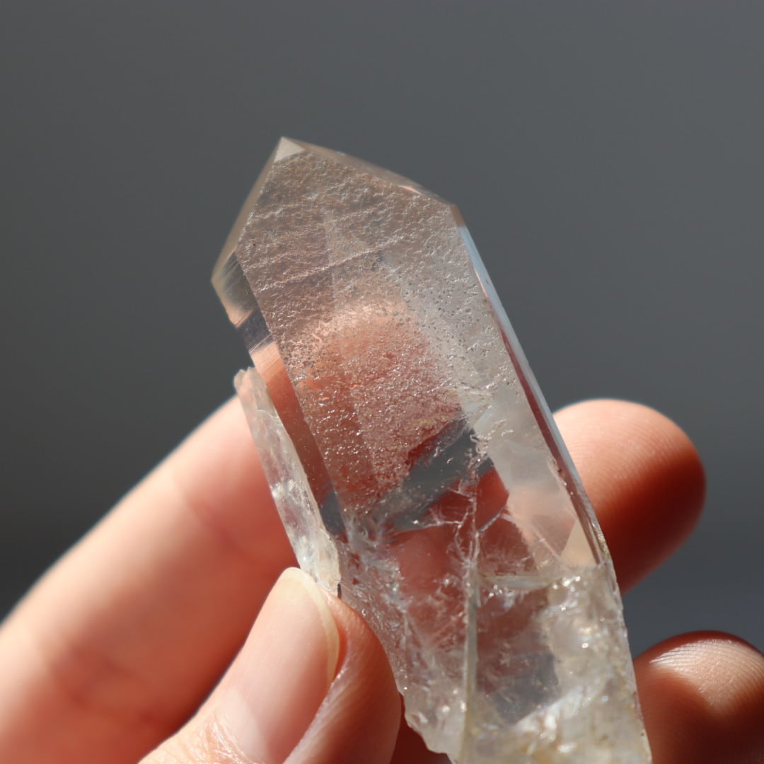 ポイント形状を保ちながらファセット面などを丁寧に研磨したセミポリッシュ仕上げで、結晶内にはガーデンクォーツとしての風景が広がります。
