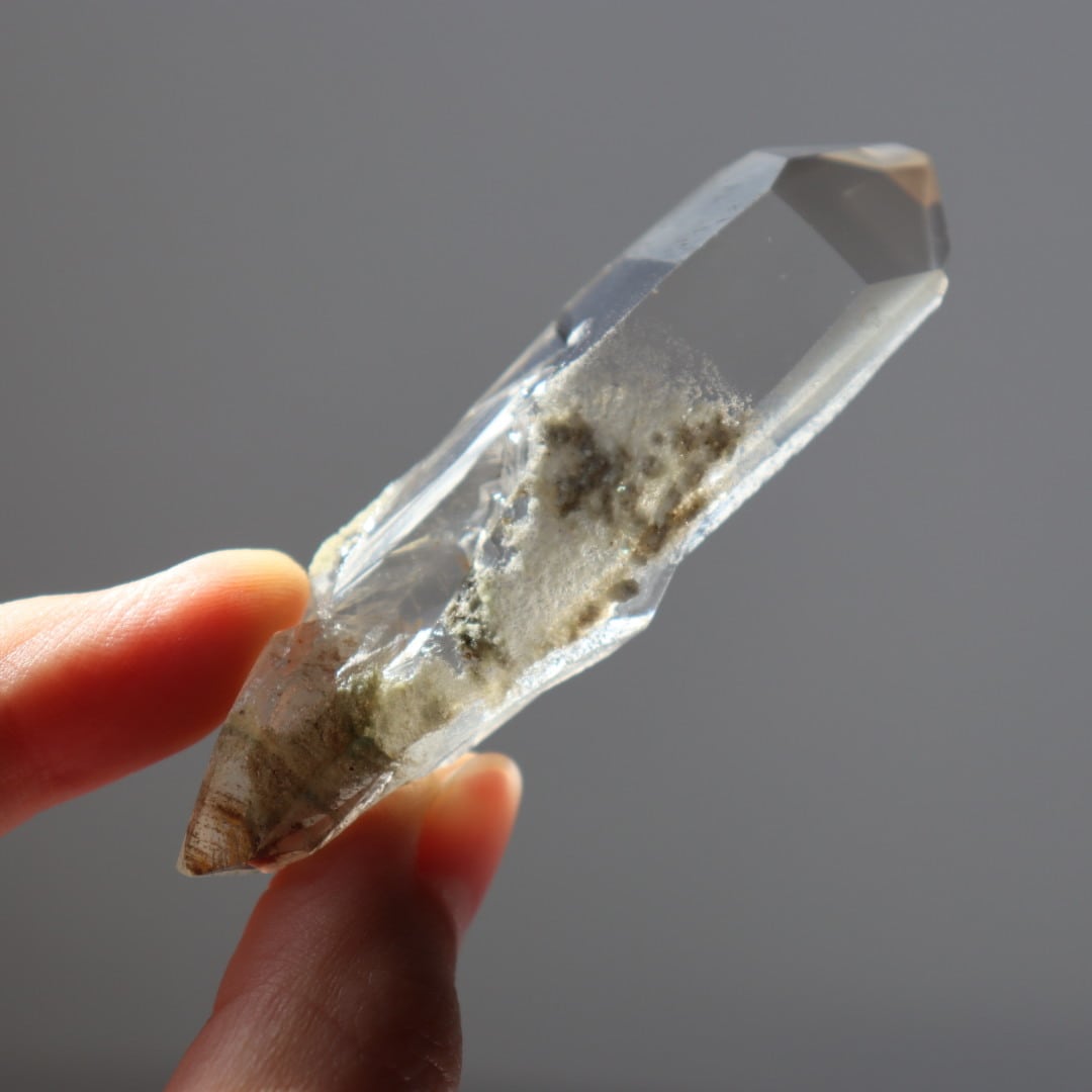 非常に透明度の高い結晶に、クローライト(緑泥石)が内包されたクリアクォーツです。
