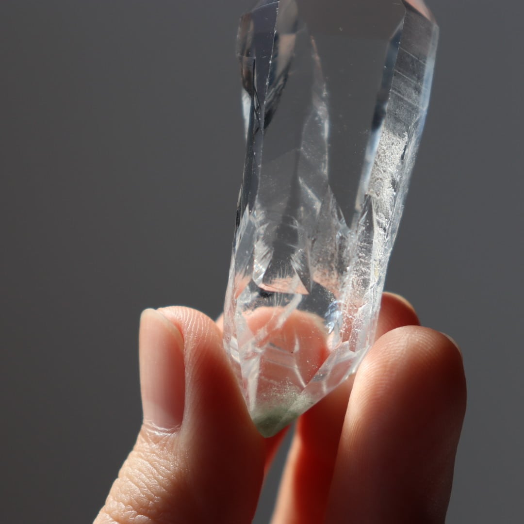 非常に透明度の高い結晶に、クローライト(緑泥石)が内包されたクリアクォーツです。