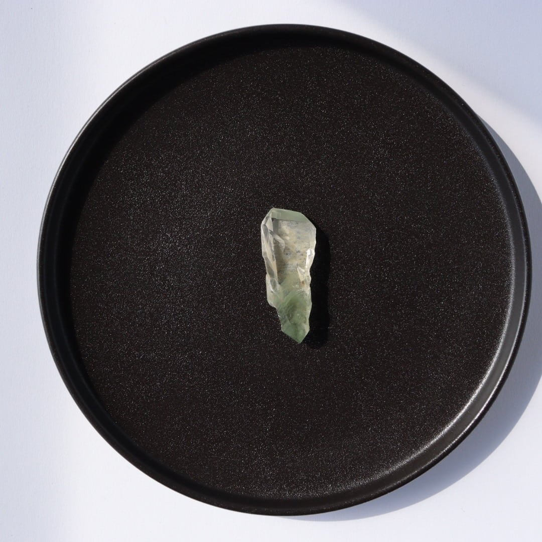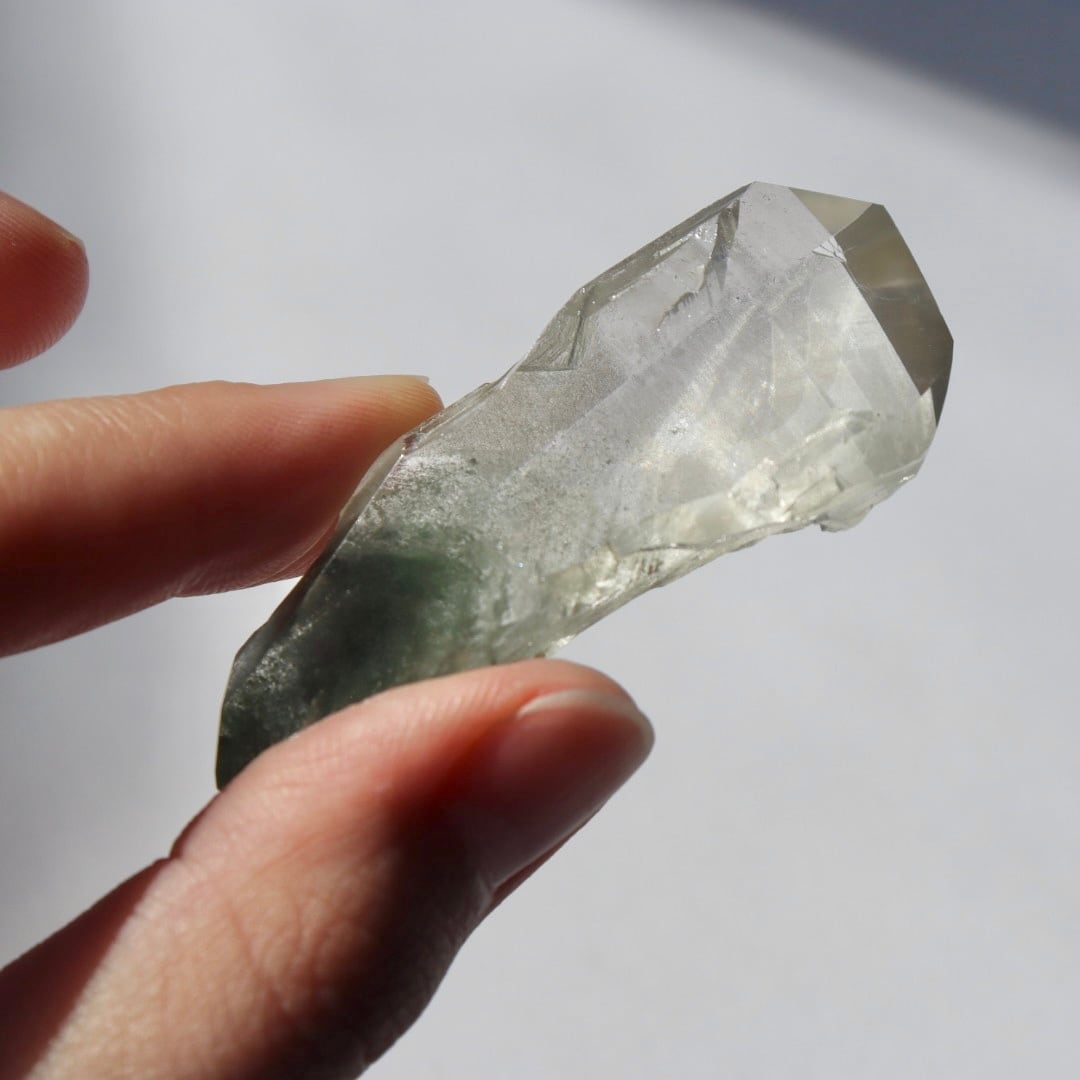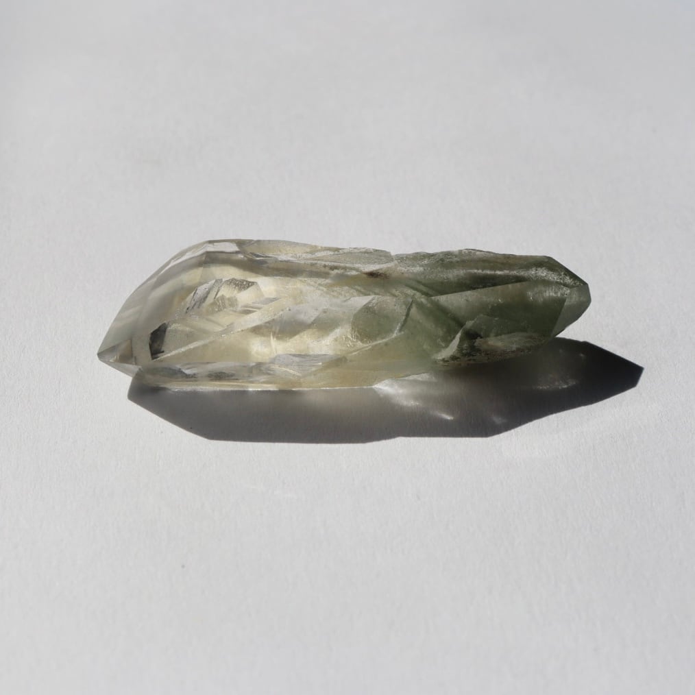 こちらは珍しいフラットなフォルムに仕上げられたダブルポイント。原石の形を活かしたセミポリッシュで、トップが尖らず、内側の面が平らに近い独特の姿が印象的です。磨かれた正面からはクローライトのグリーンファントムを美しく鑑賞できます。