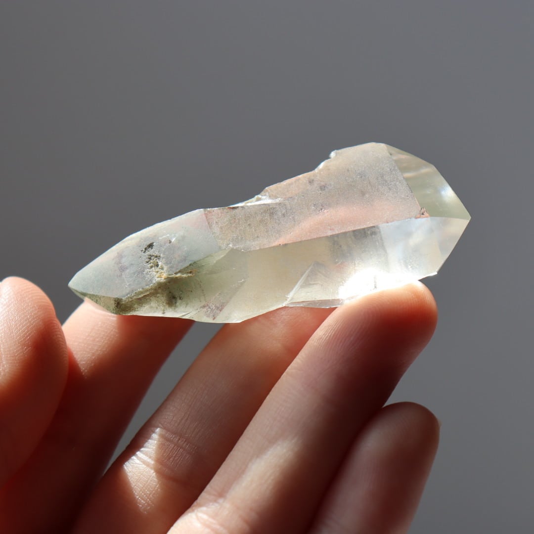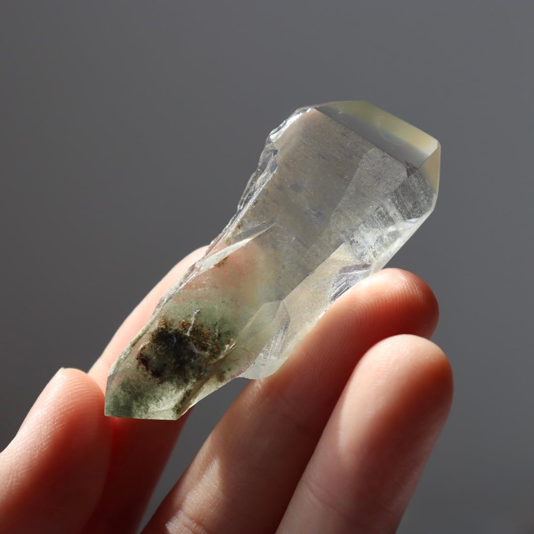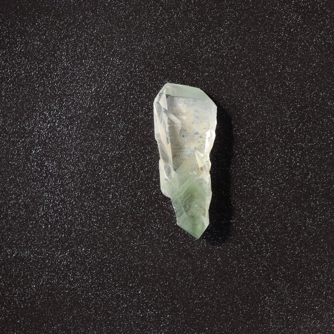 ファントムとは、水晶が一度成長を止め、再び成長する過程で内部に山型の層が現れる神秘的な成長痕のこと。側面には原石由来の剥離面も残り、どこか秘密の鍵のような存在感を放つ一石です。