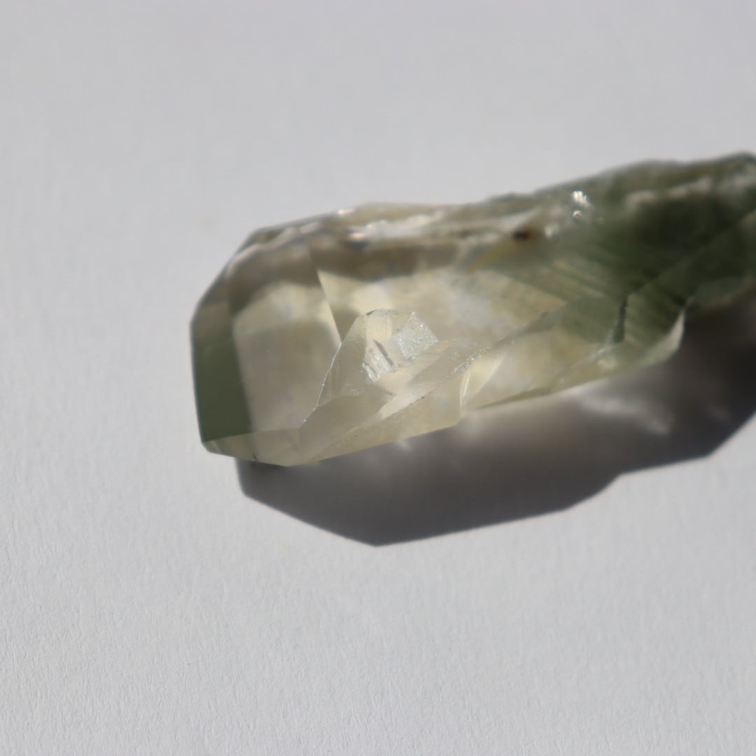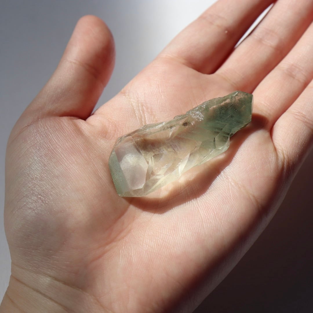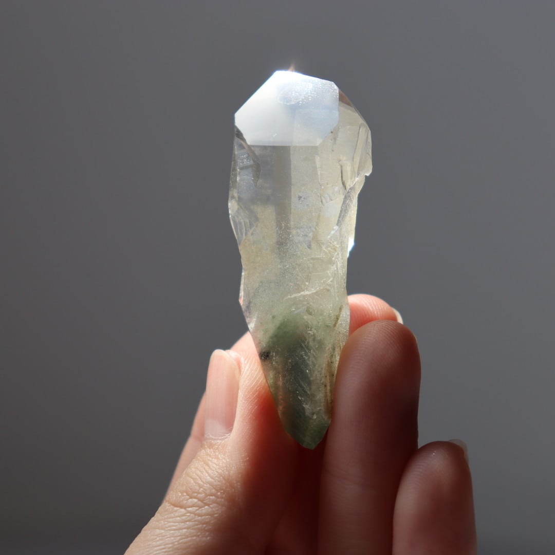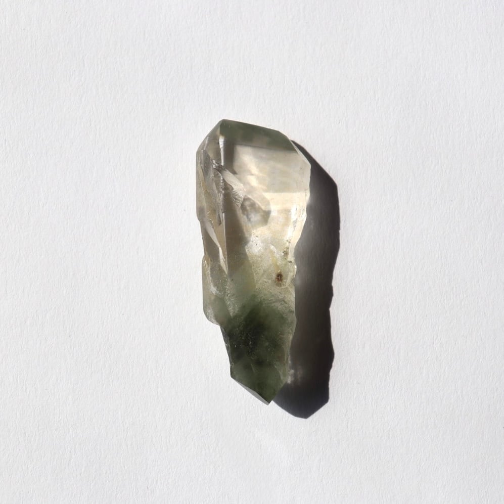 ファントムとは、水晶が一度成長を止め、再び成長する過程で内部に山型の層が現れる神秘的な成長痕のこと。側面には原石由来の剥離面も残り、どこか秘密の鍵のような存在感を放つ一石です。