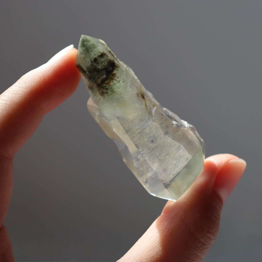 ブラジル・ミナスジェライス州コリント産のクロライトインクォーツ原石ポイント。