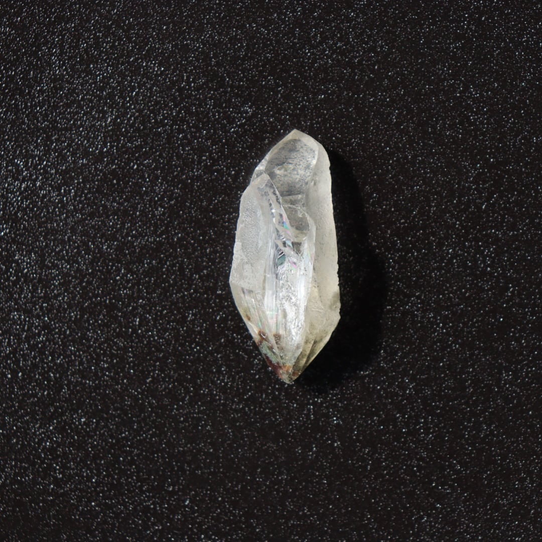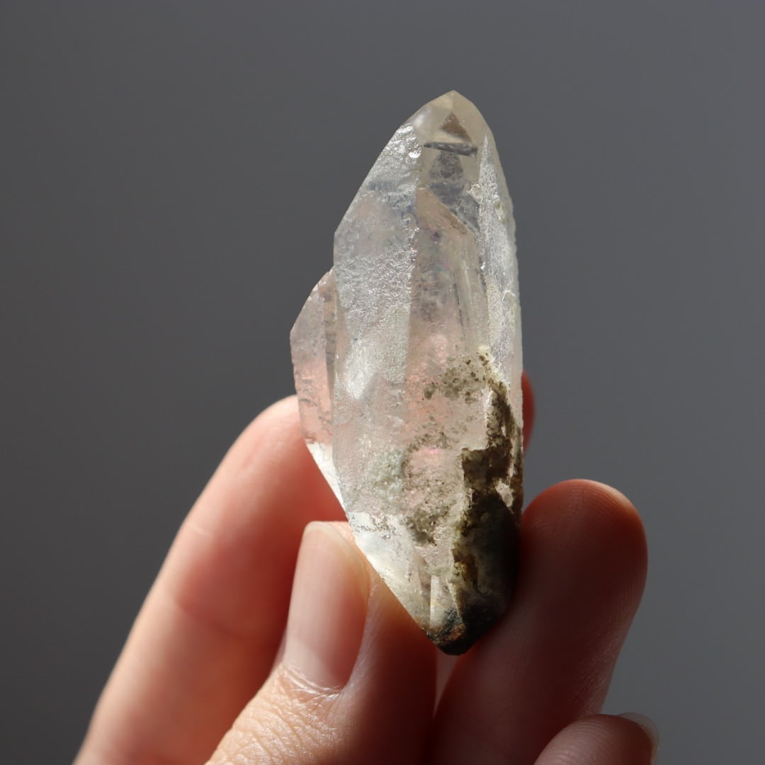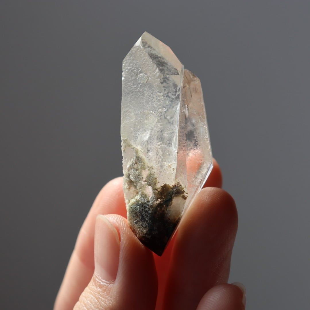 こちらは小さな二つの結晶が寄り添うように成長した、大変珍しいツインのダブルポイント。きゅっと重なり合う姿が愛らしく、研磨された面からは透明度の高い内部をクリアに覗き込めます。