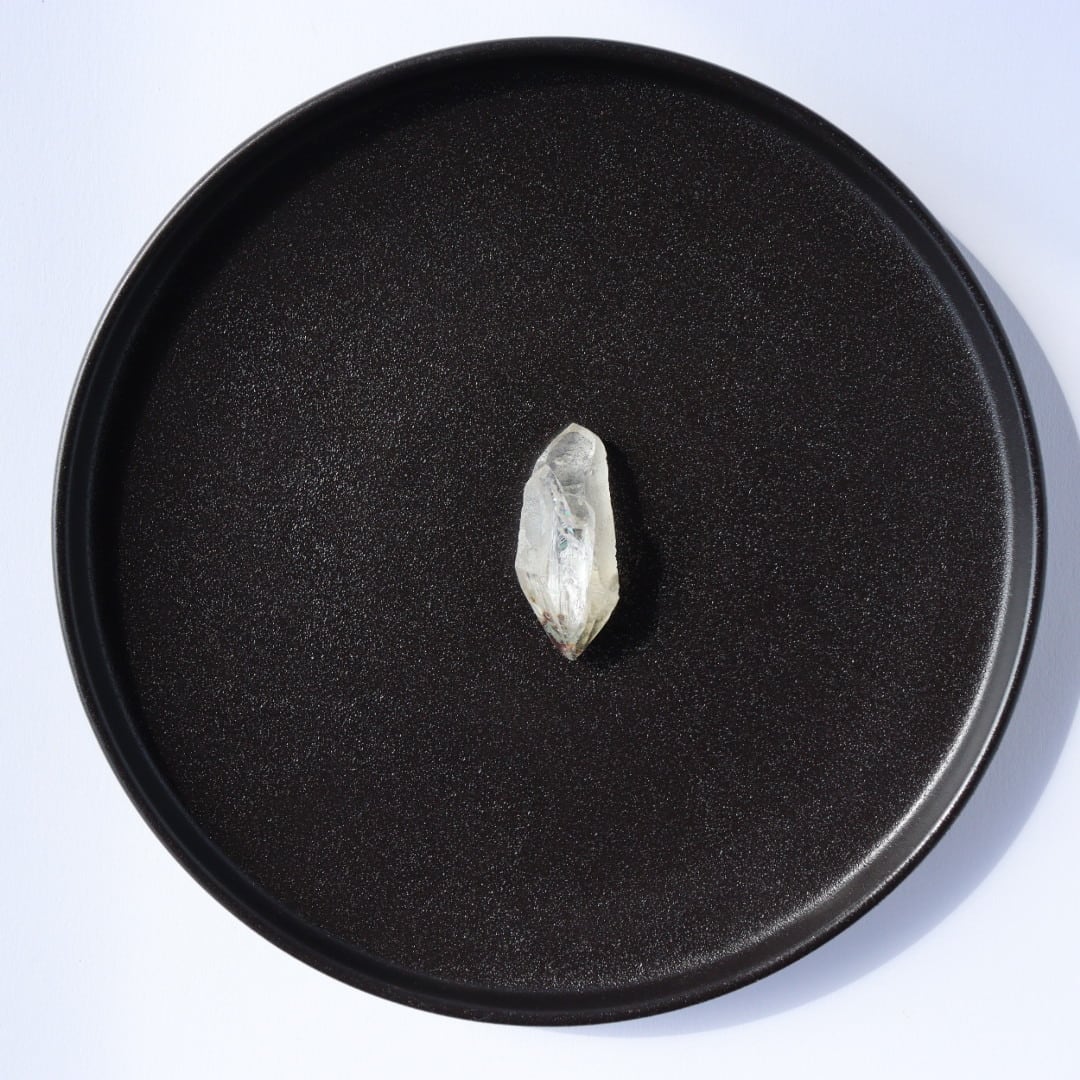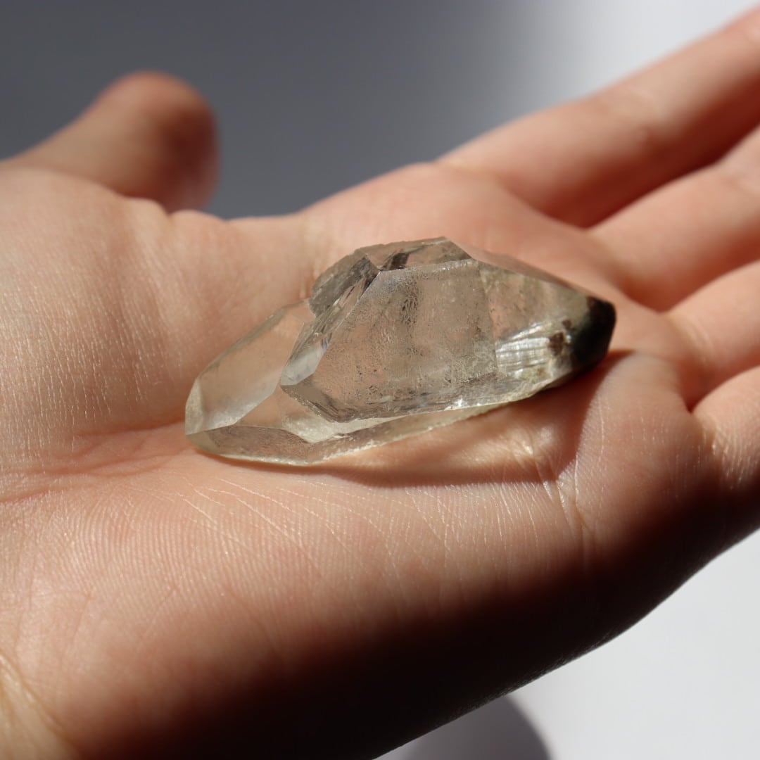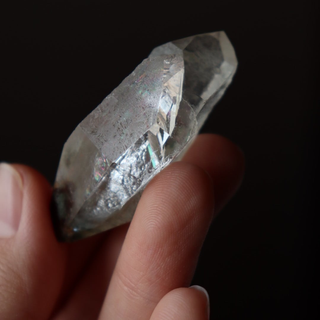 こちらは小さな二つの結晶が寄り添うように成長した、大変珍しいツインのダブルポイント。きゅっと重なり合う姿が愛らしく、研磨された面からは透明度の高い内部をクリアに覗き込めます。