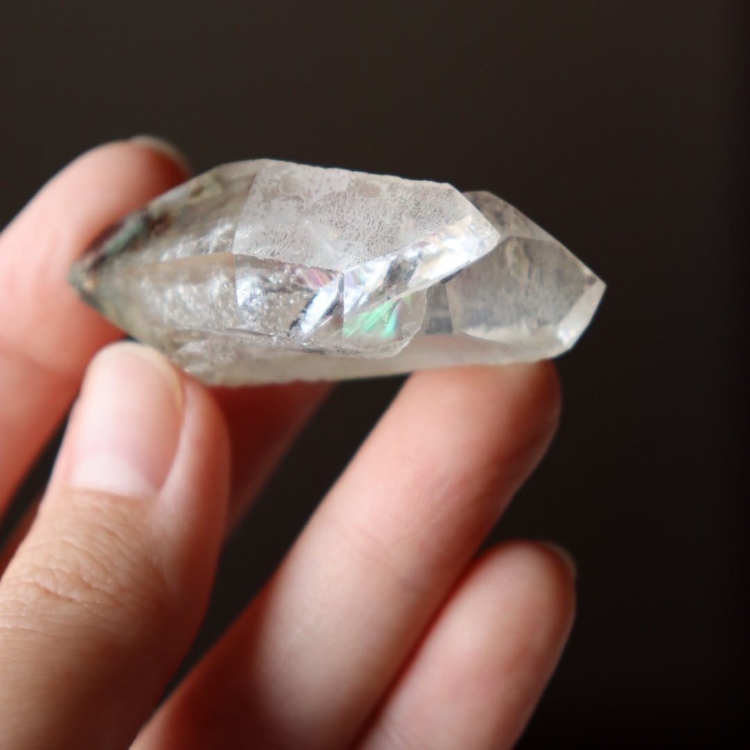 ホワイトとグリーンのクローライトが織りなす景色は、ガーデンクオーツとしての魅力も豊か。さらに二つの結晶の接地面いっぱいに大きな虹が現れる、極めて珍しく美しい現象を宿しています。ツインは調和や統合を象徴する特別な存在としても知られています。