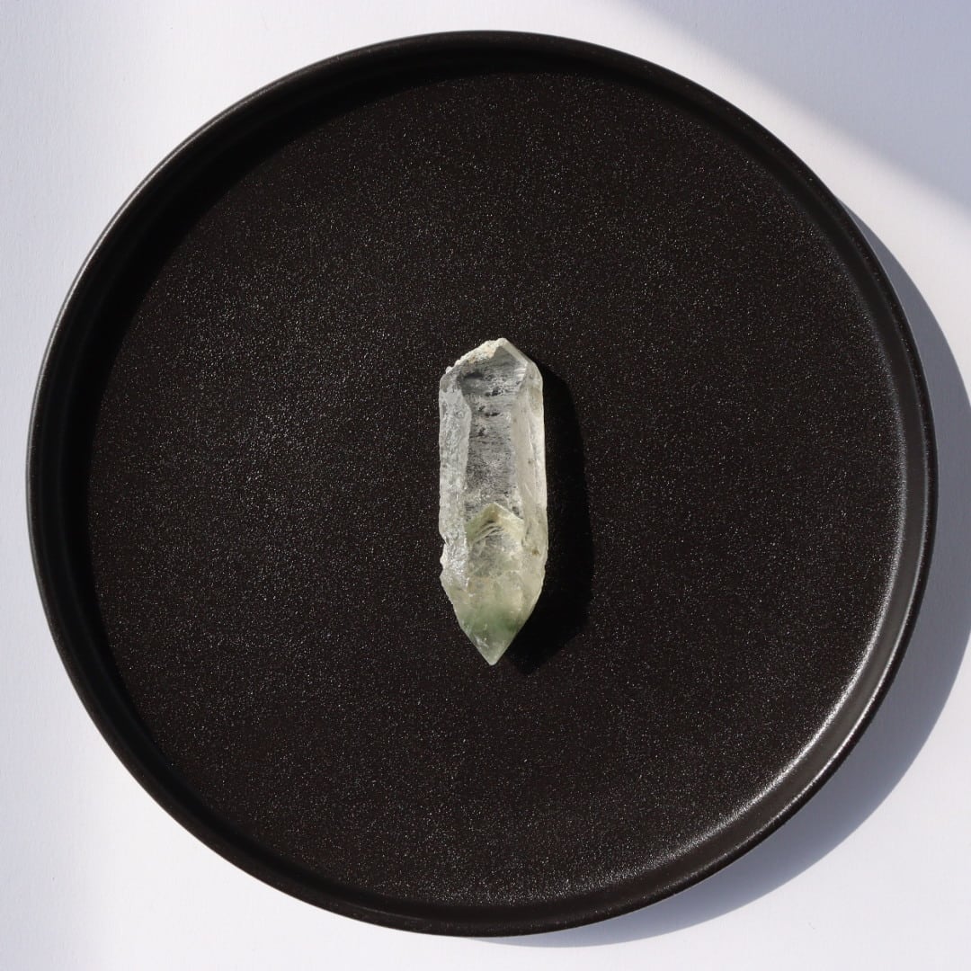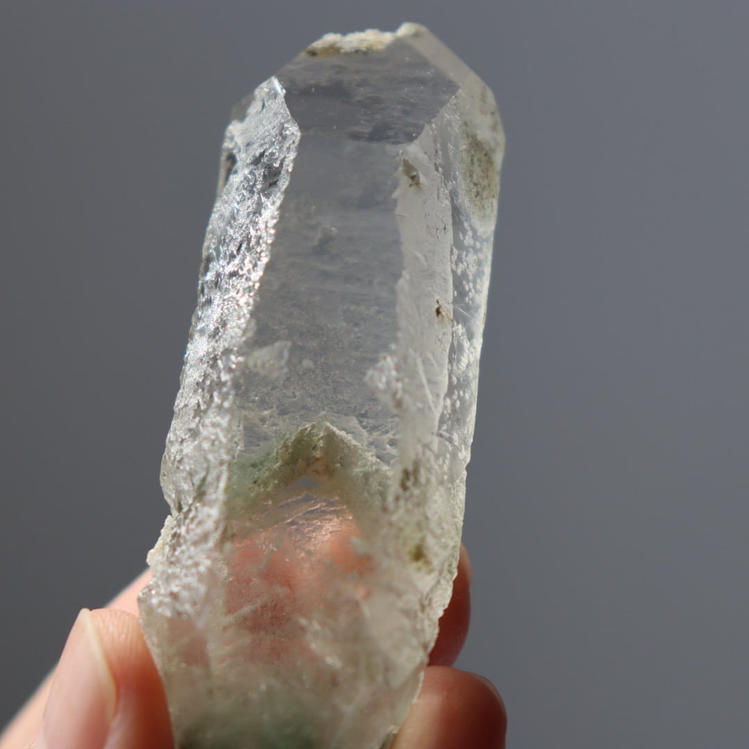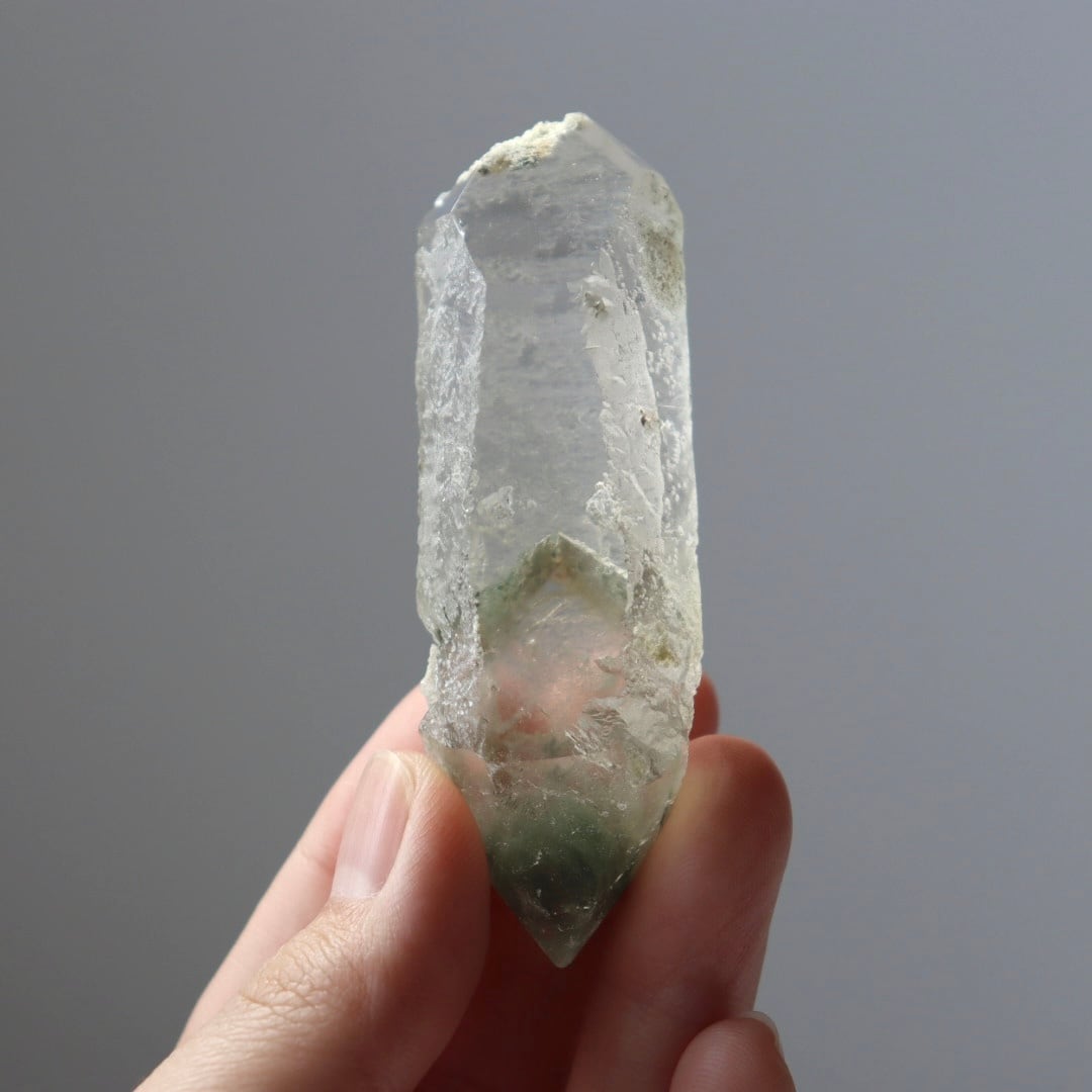 非常に透明度の高い結晶に、クローライト(緑泥石)が内包されたクリアクォーツです。