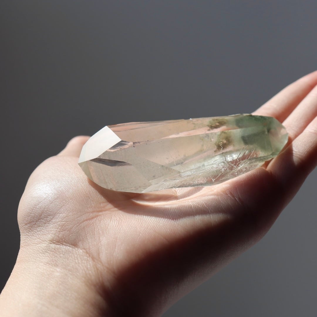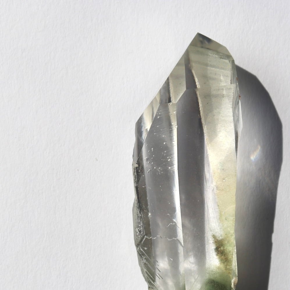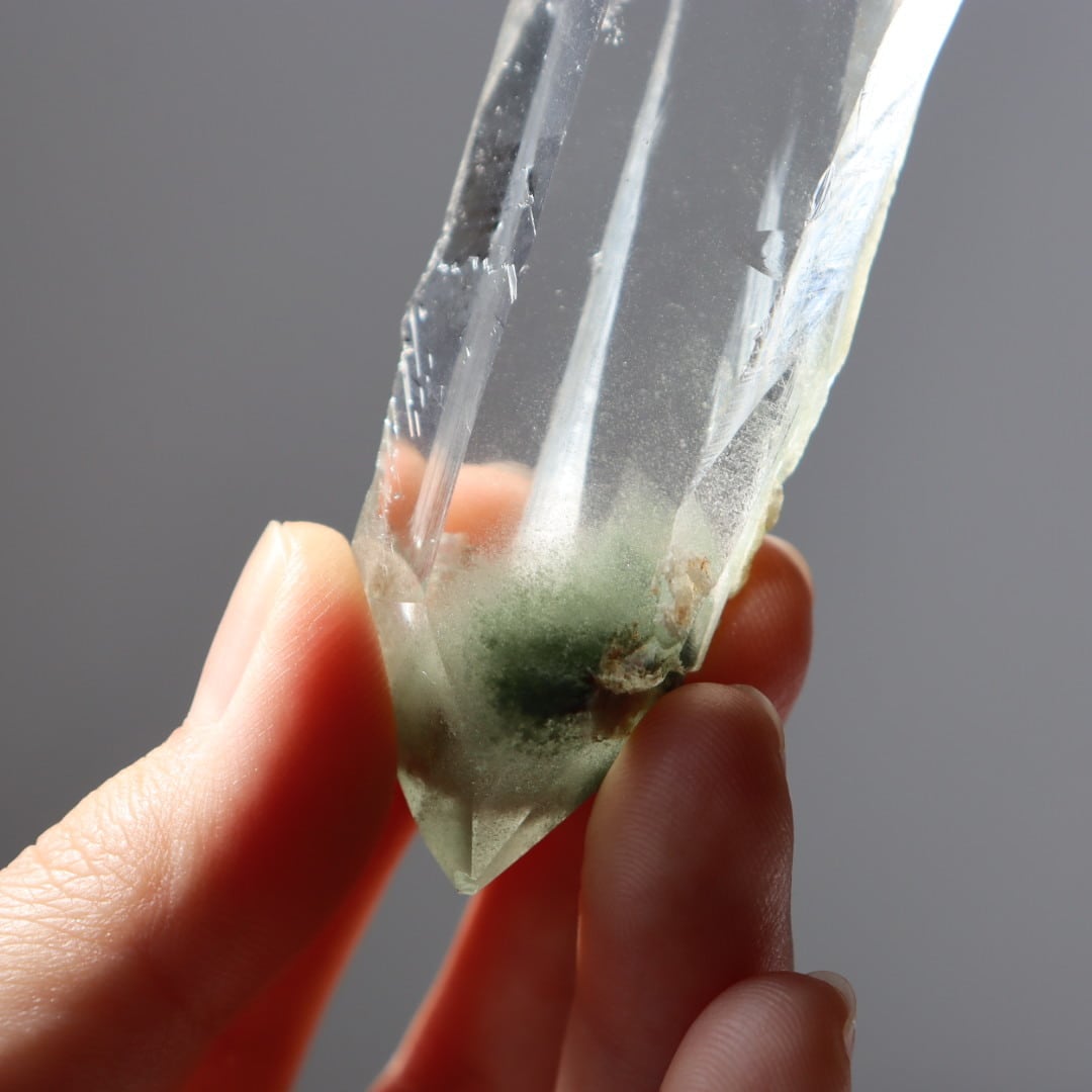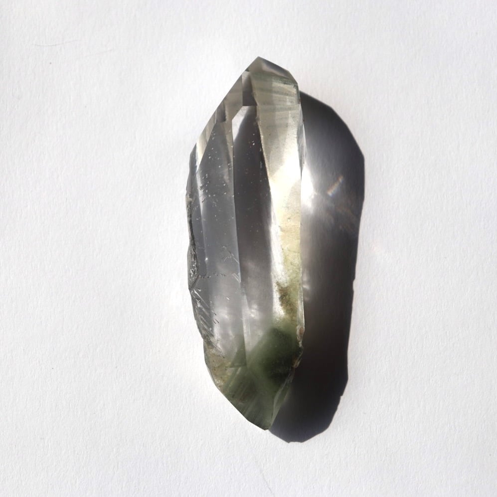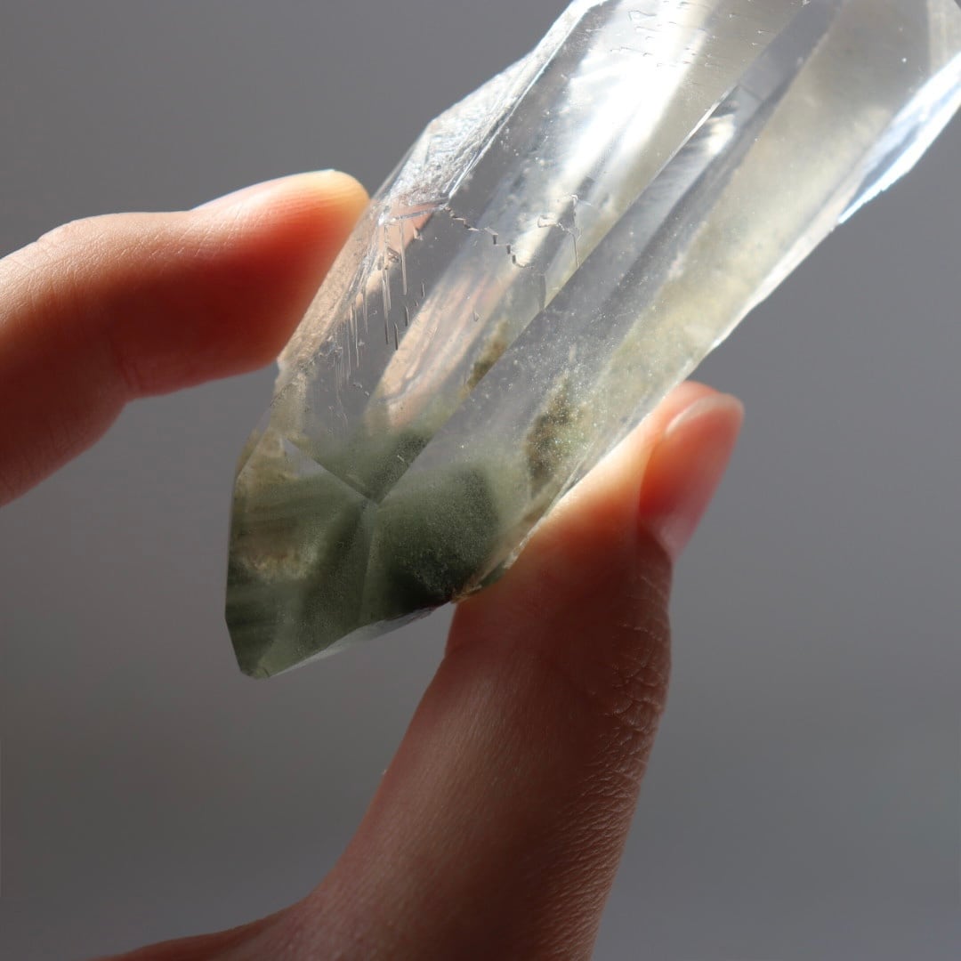 こちらは、分厚く密度の高い結晶が上下ともに両剣となったダブルポイント。反対側までしっかりと覗けるほどの透明感の中に浮かぶ、クローライトのグリーンファントム。