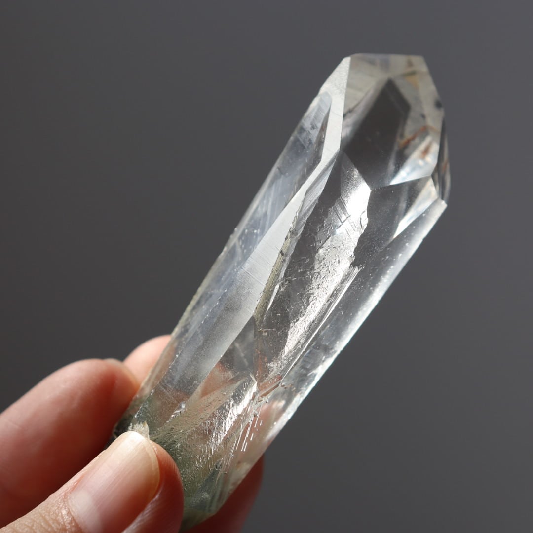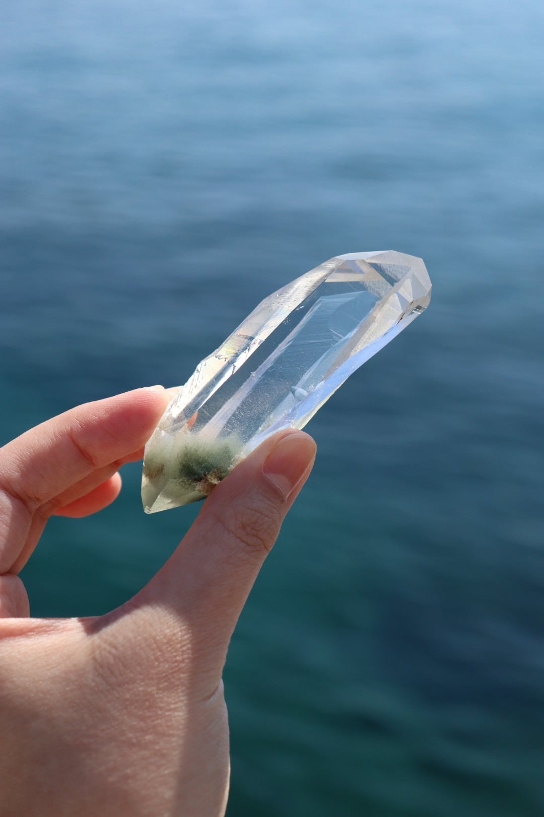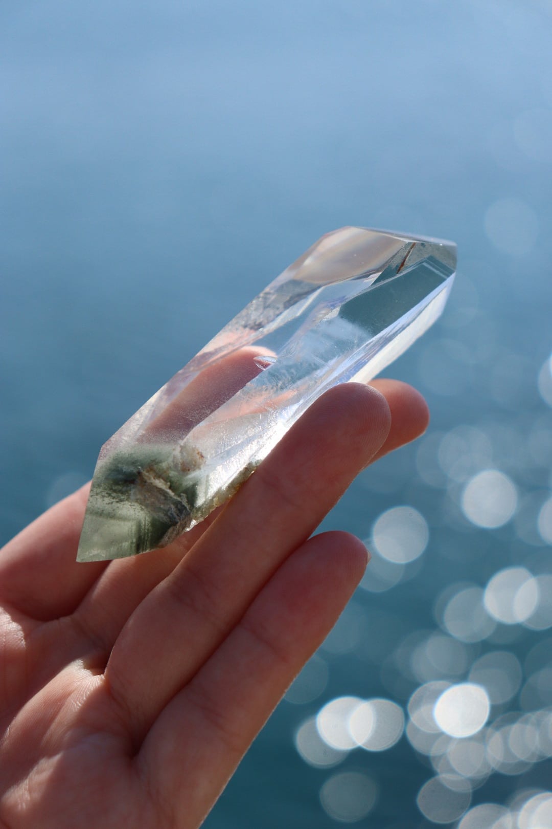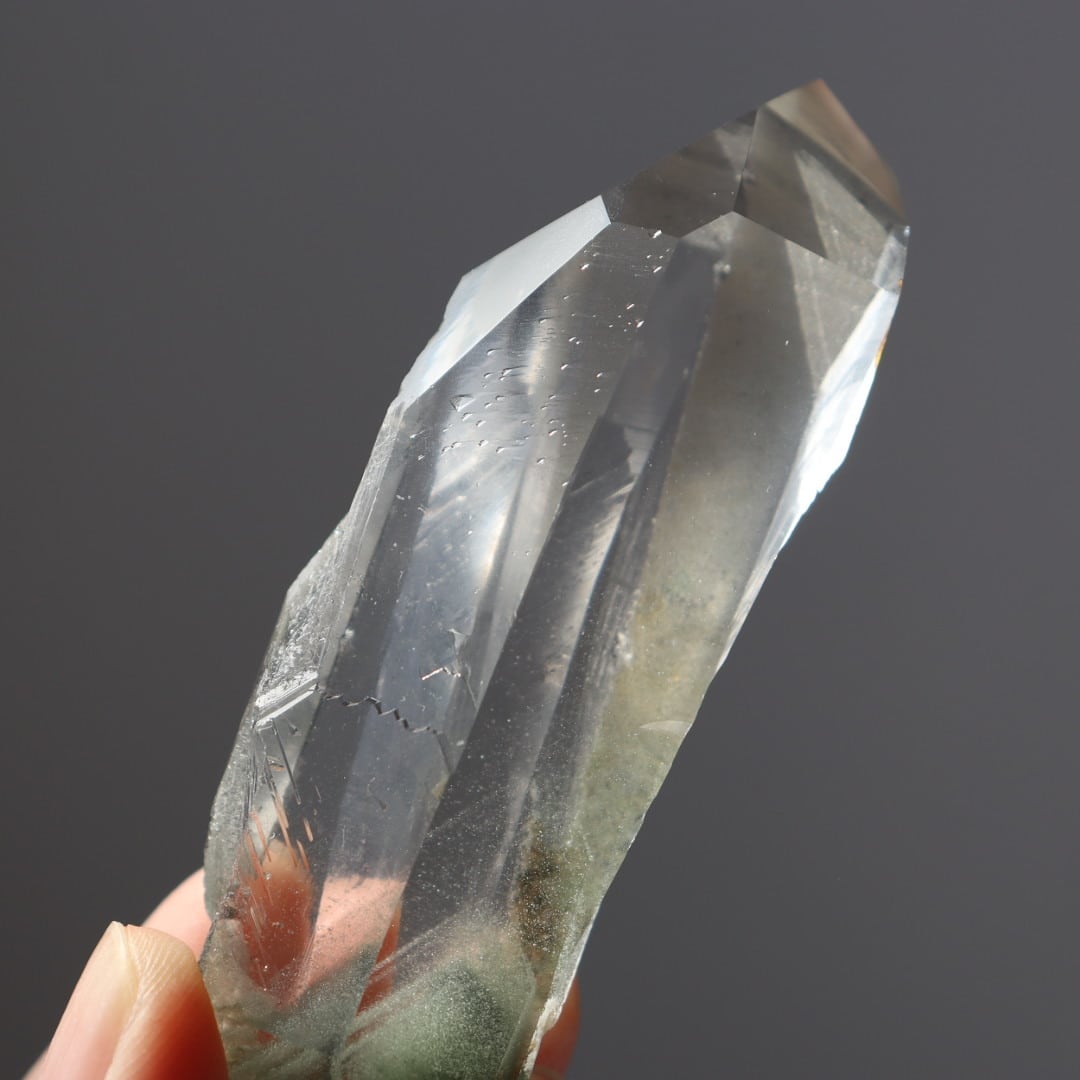 こちらは、分厚く密度の高い結晶が上下ともに両剣となったダブルポイント。反対側までしっかりと覗けるほどの透明感の中に浮かぶ、クローライトのグリーンファントム。