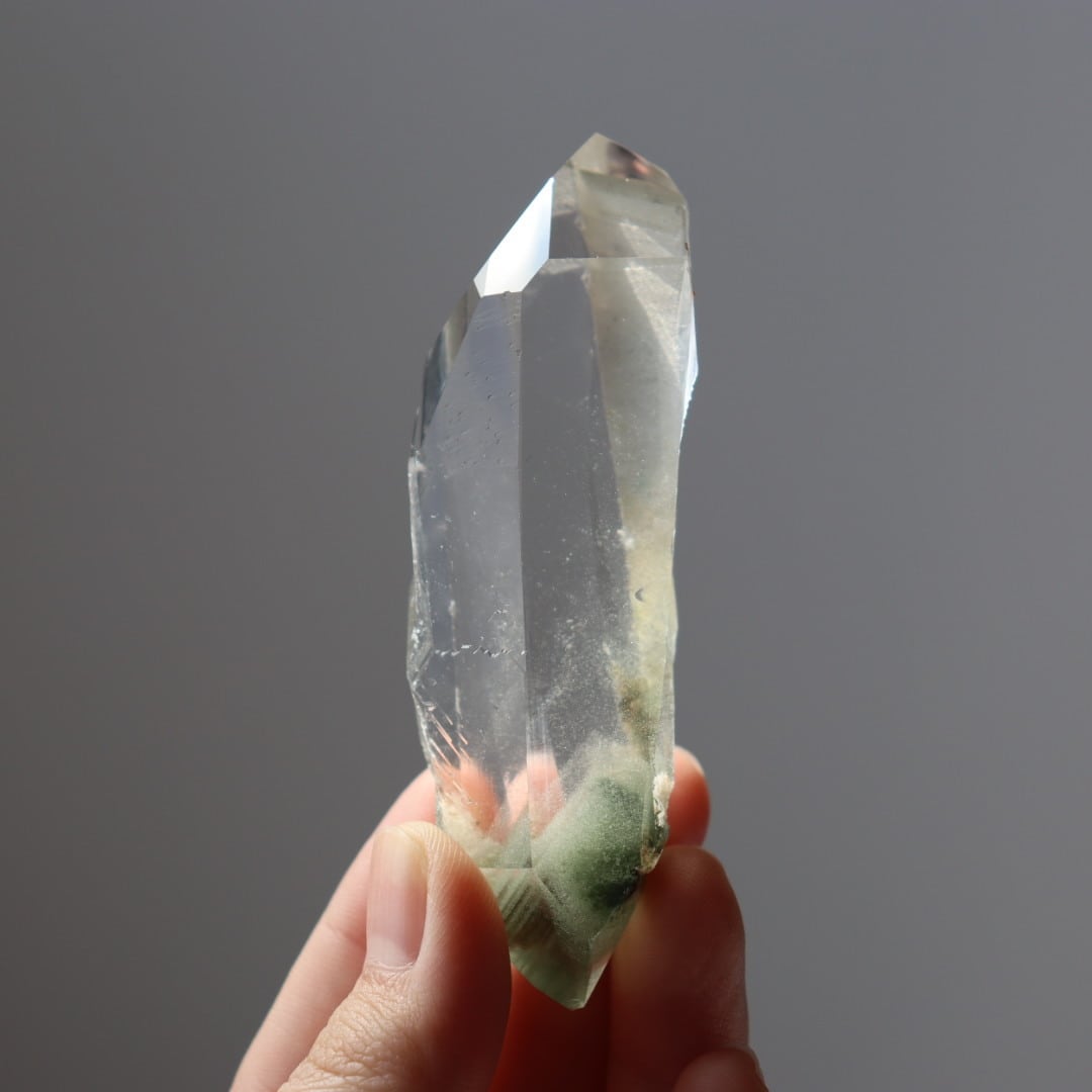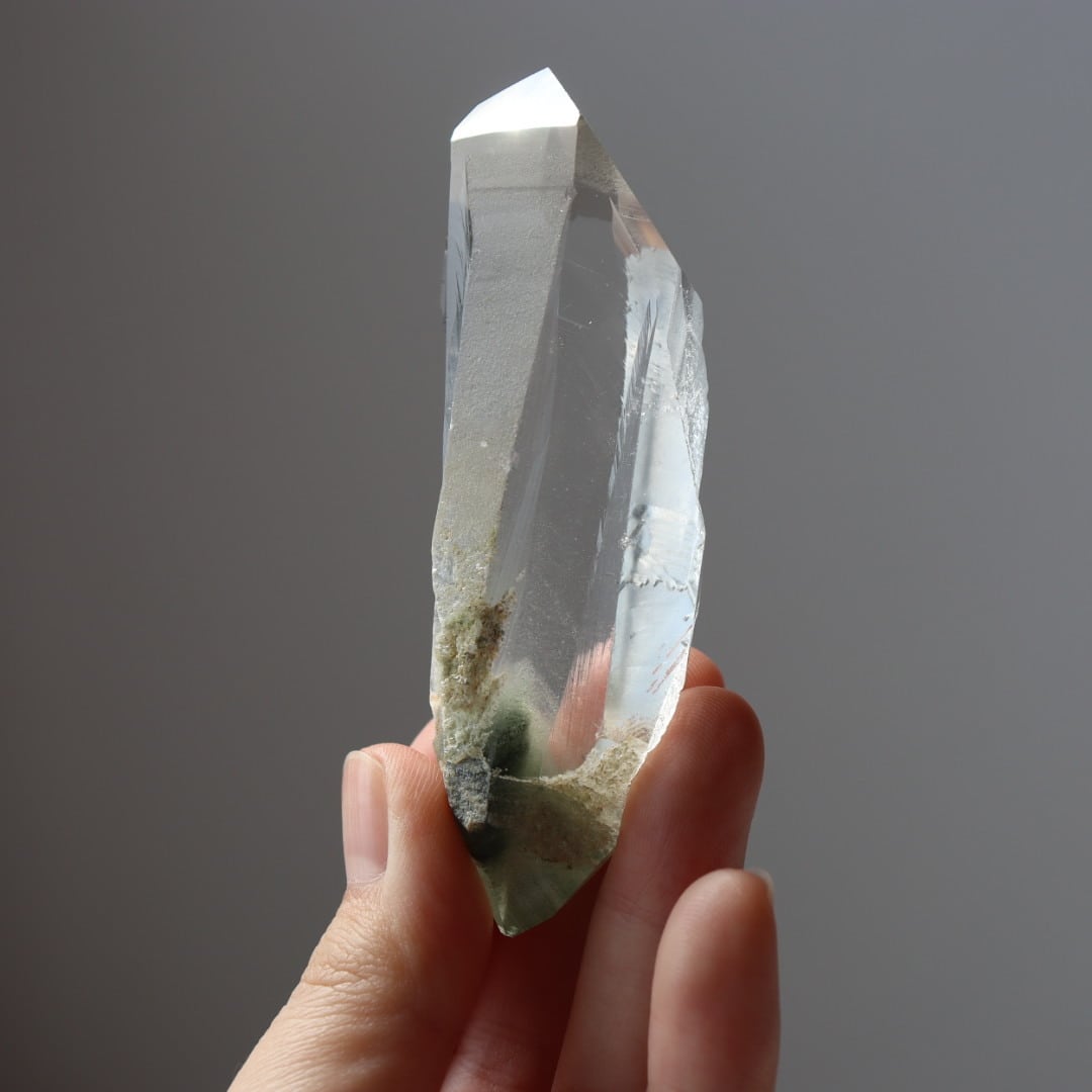 非常に透明度の高い結晶に、クローライト(緑泥石)が内包されたクリアクォーツです。