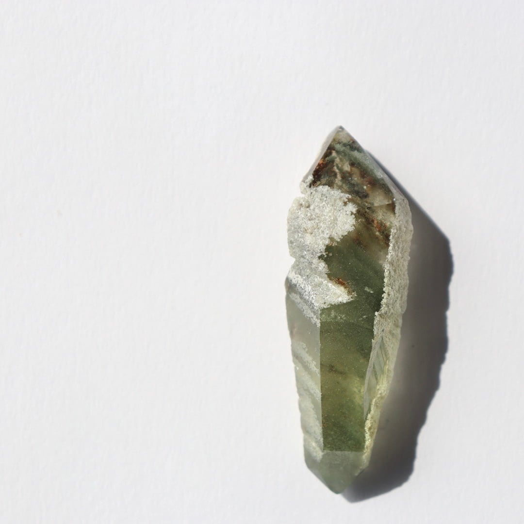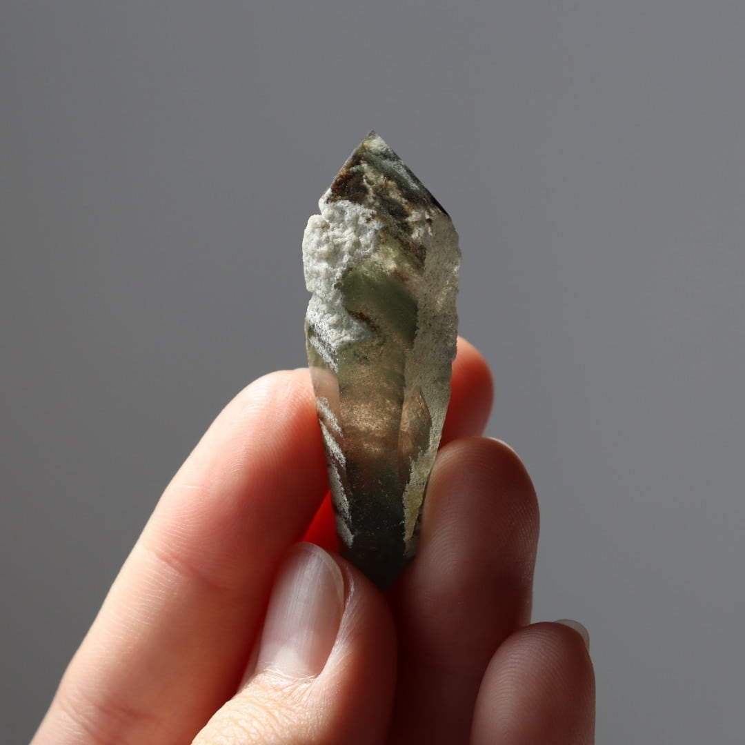 こちらはホワイトの鉱物をまとい、深いグリーン、クローライトを内包した小さなダブルポイント。