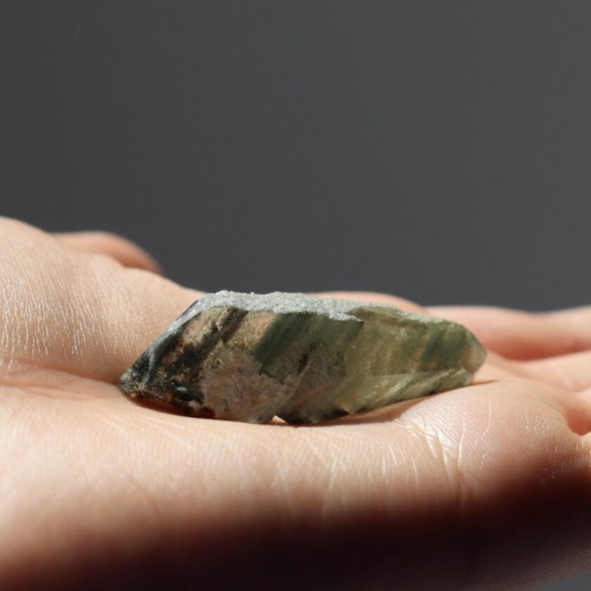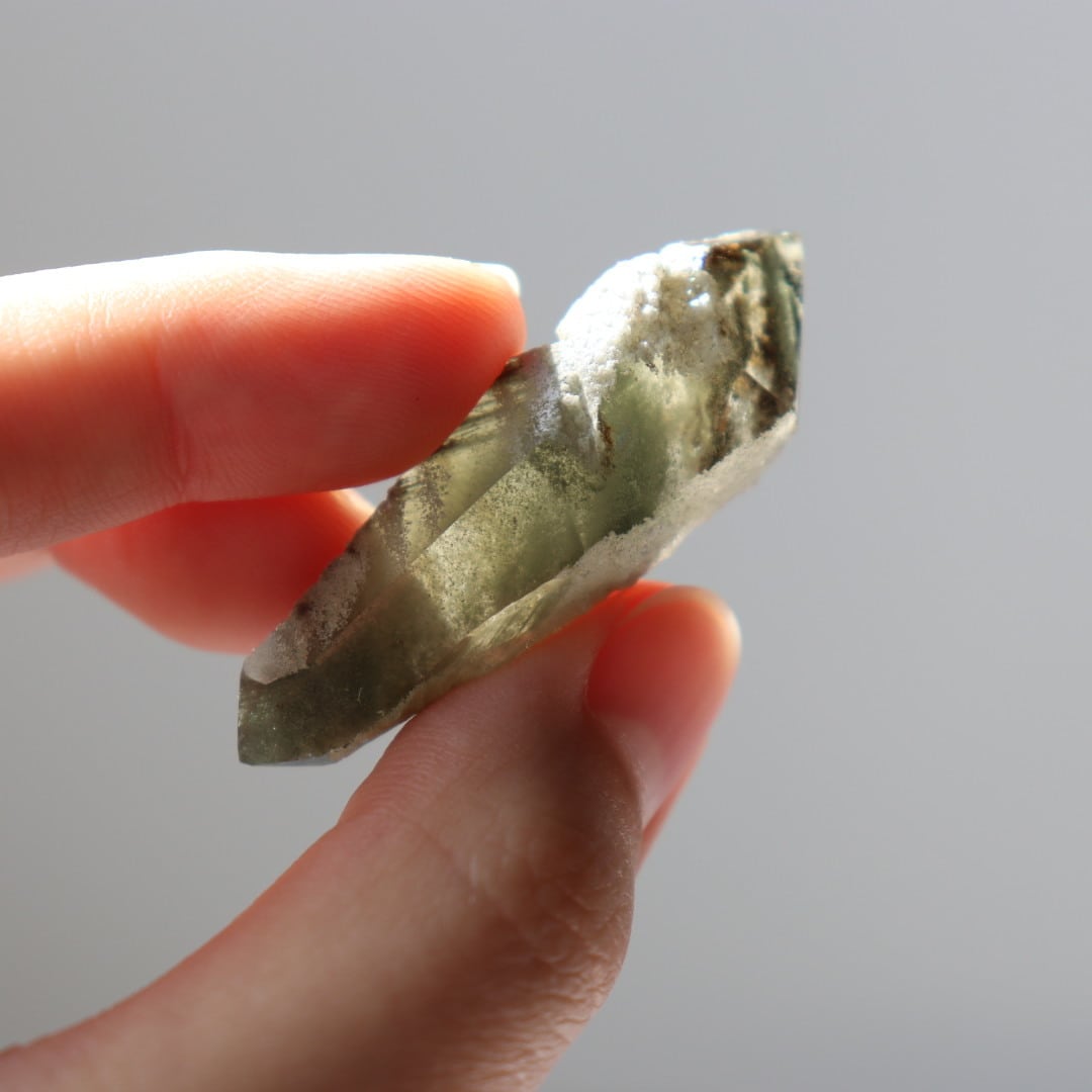 ブラジル・ミナスジェライス州コリント産のクロライトインクォーツ原石ポイント。