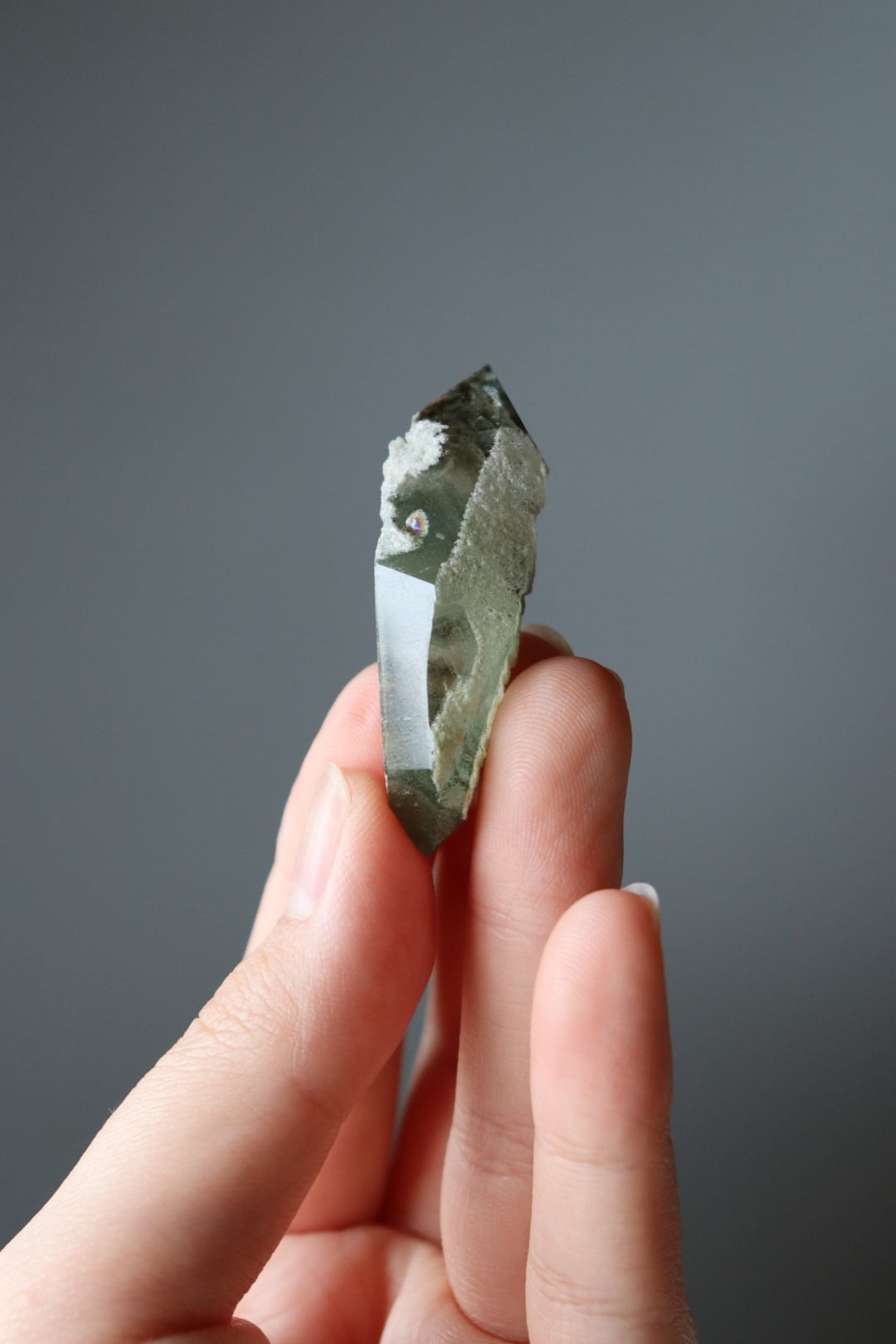 一見不透明に見えますが、中の結晶は驚くほどにクリアで、幾重にも重なるファントム(山状インクルージョン)をのぞくことができます。中央に小さな虹が入っているのもポイント。