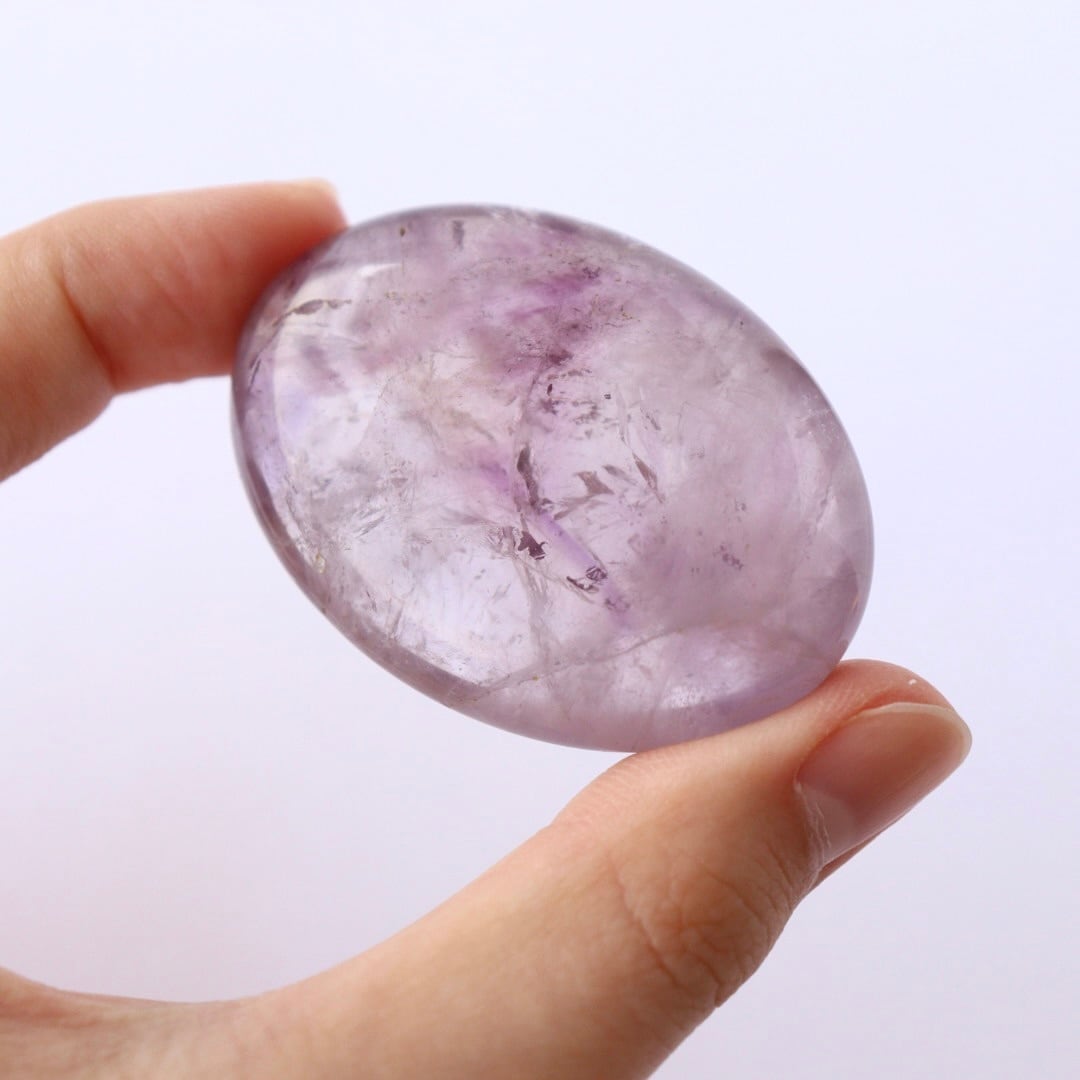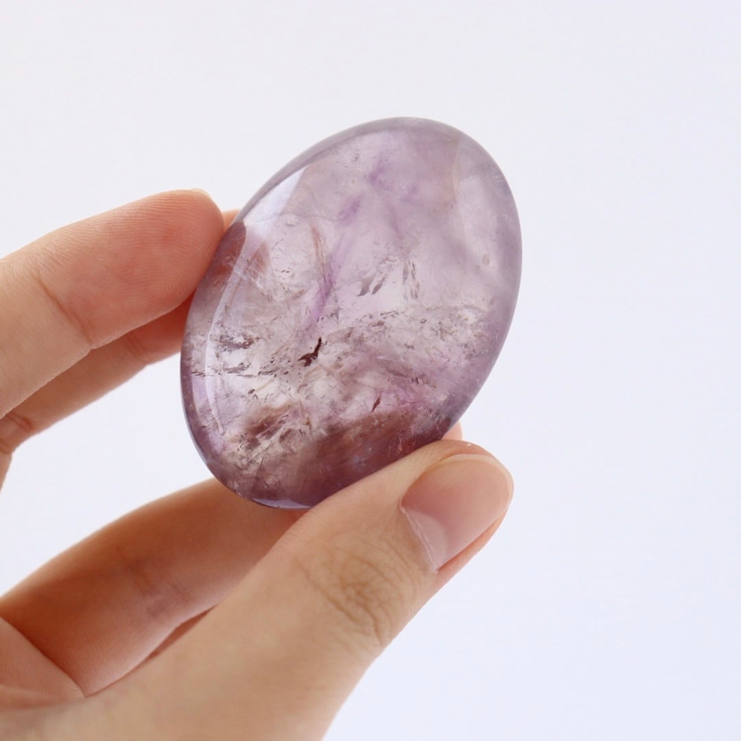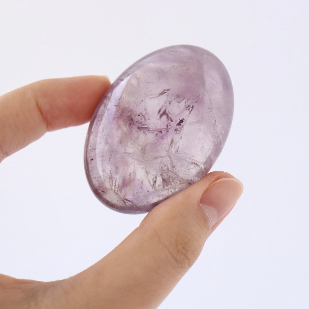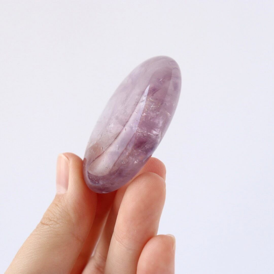 澄んだ結晶の中にじんわりとパープルが広がる、アメジストの握り石。