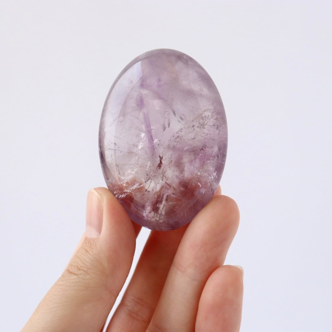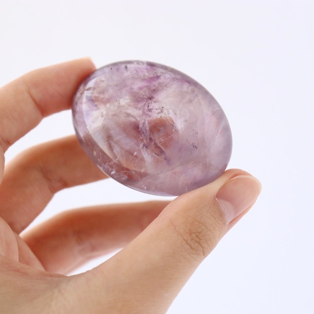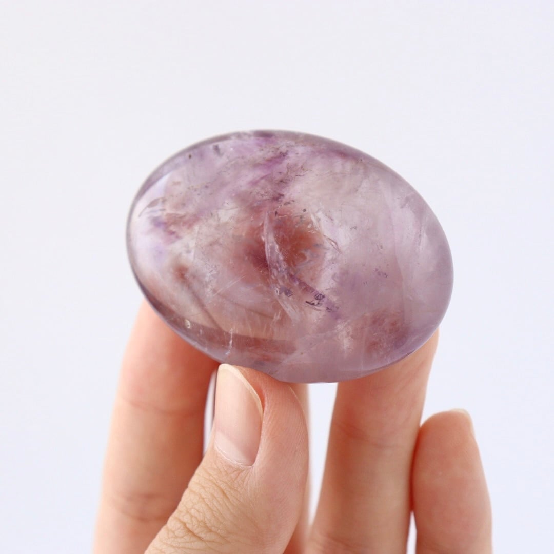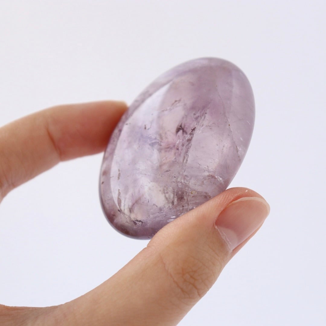 澄んだ結晶の中にじんわりとパープルが広がる、アメジストの握り石。
