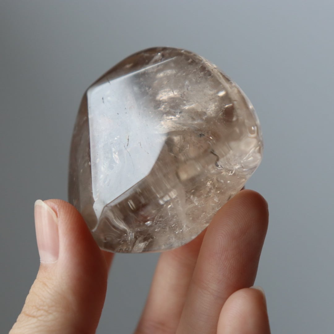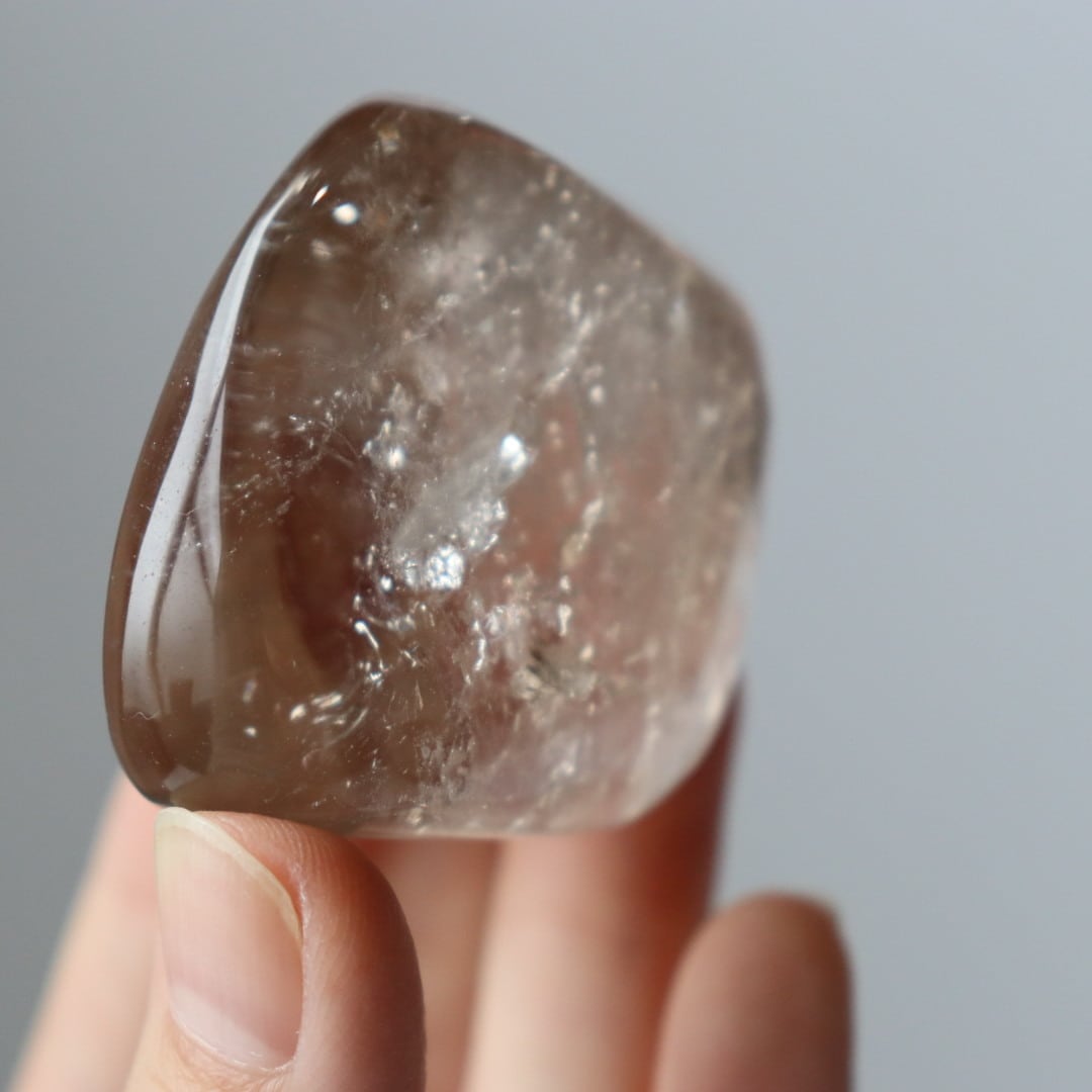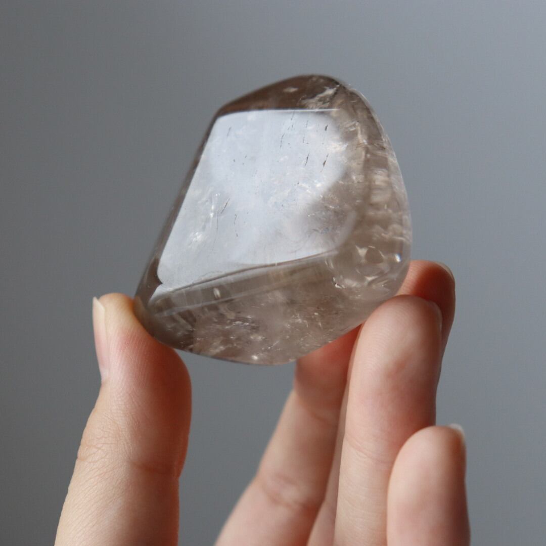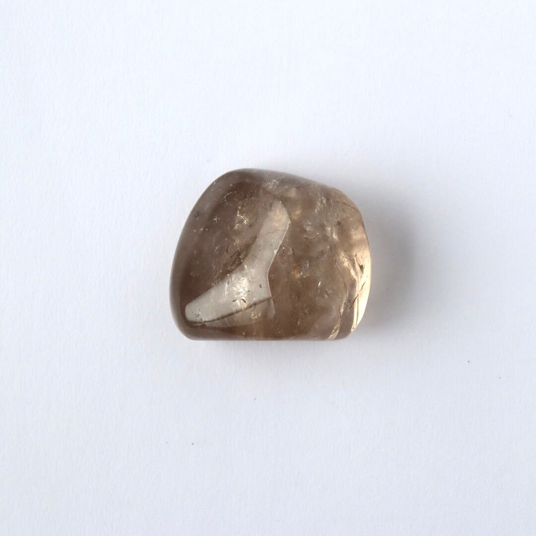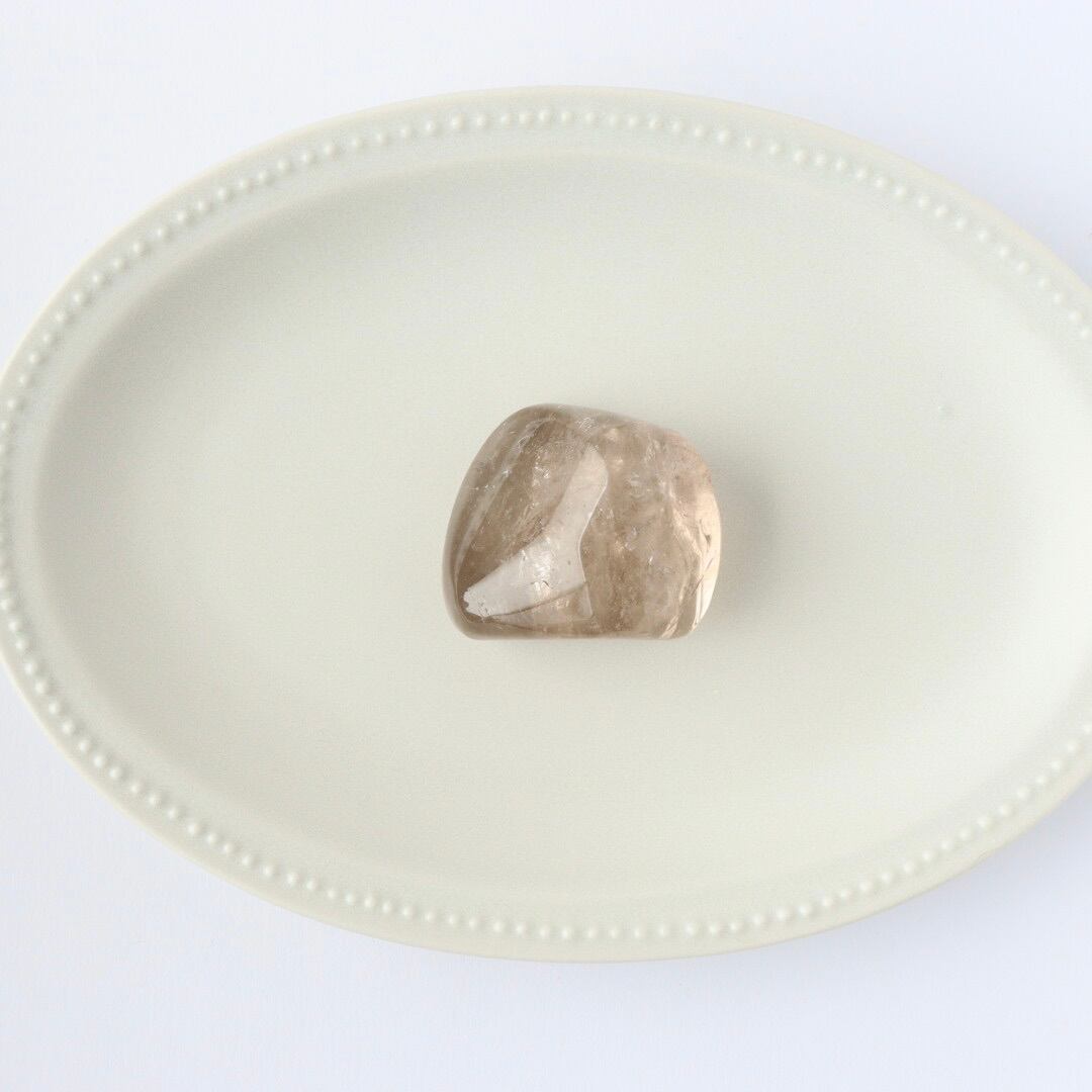 こちらは、とろりと溶けるような透明感と穏やかなブラウンカラーをもつスモーキークォーツ。いくつかのフラットな面を持つフリーフォームに磨かれており、置く角度によって、さまざまな虹やインクルージョンを楽しむことができます。