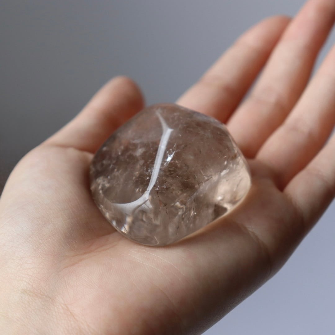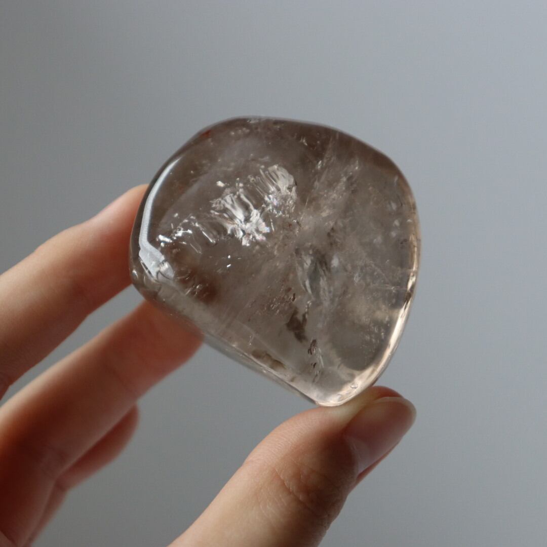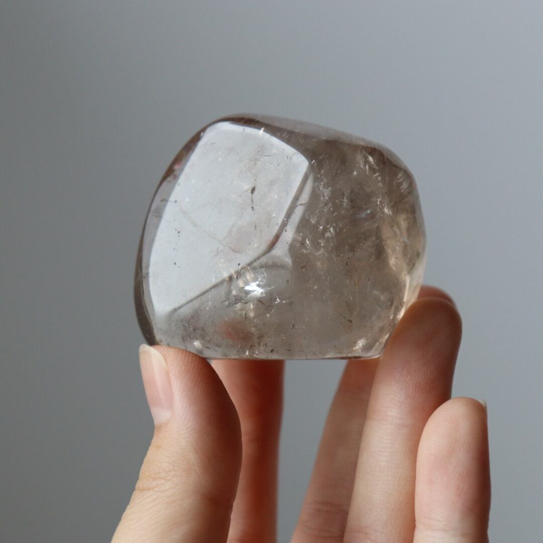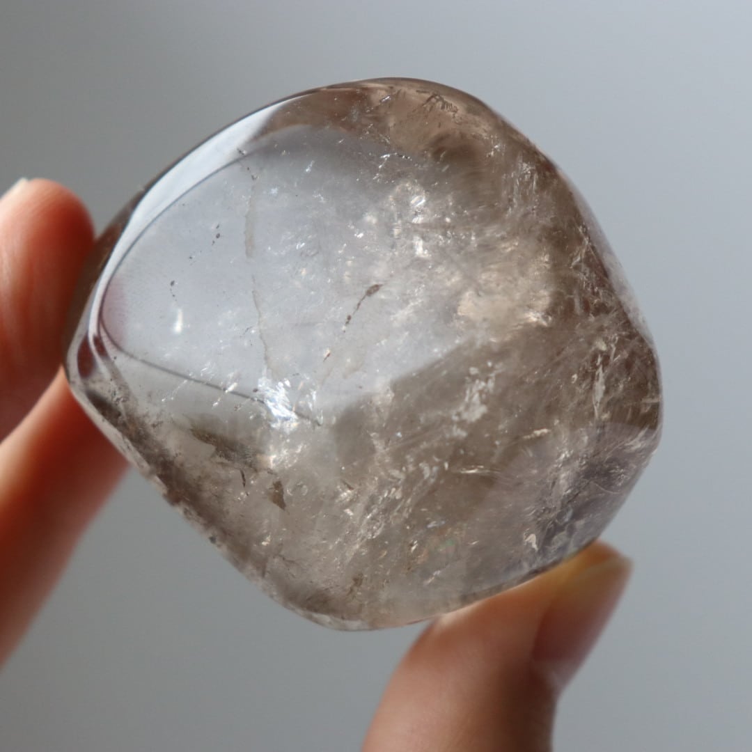 こちらは、とろりと溶けるような透明感と穏やかなブラウンカラーをもつスモーキークォーツ。いくつかのフラットな面を持つフリーフォームに磨かれており、置く角度によって、さまざまな虹やインクルージョンを楽しむことができます。