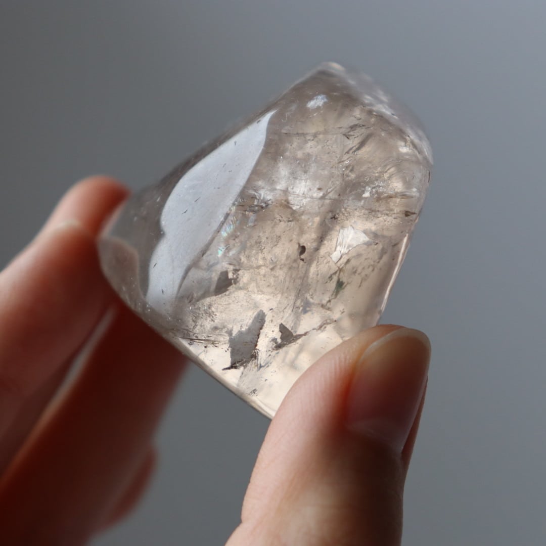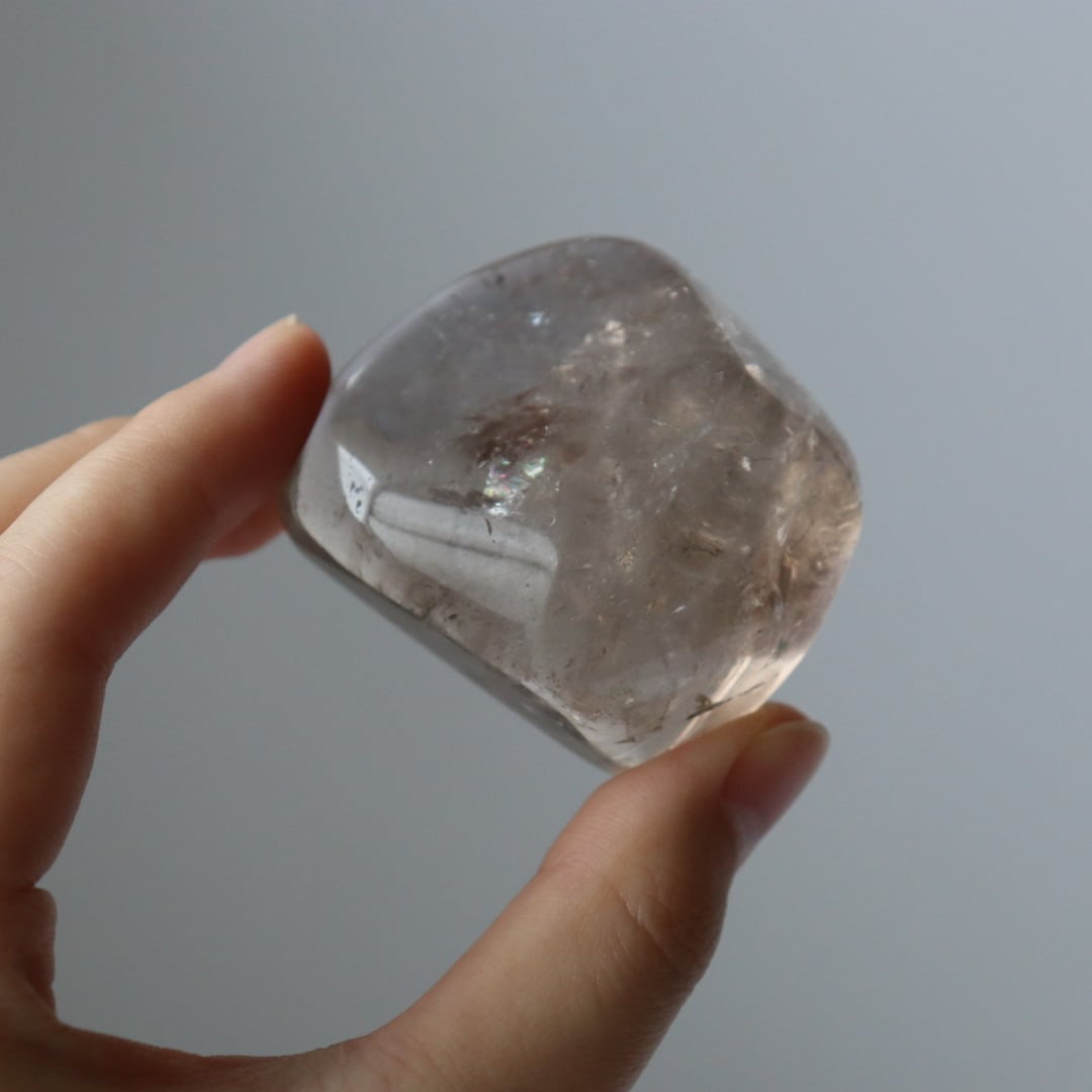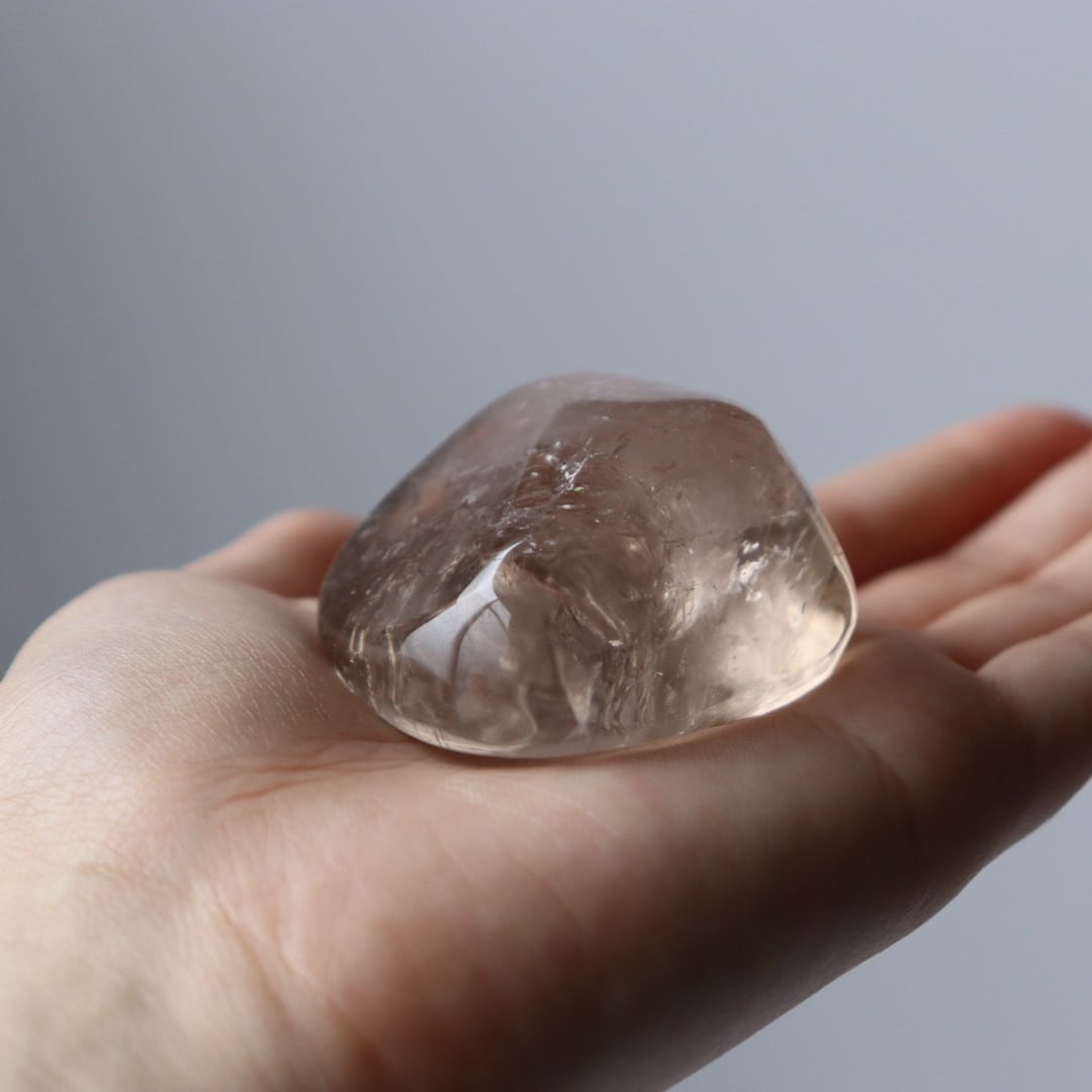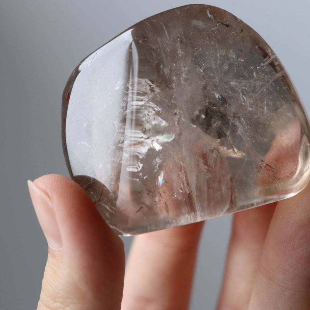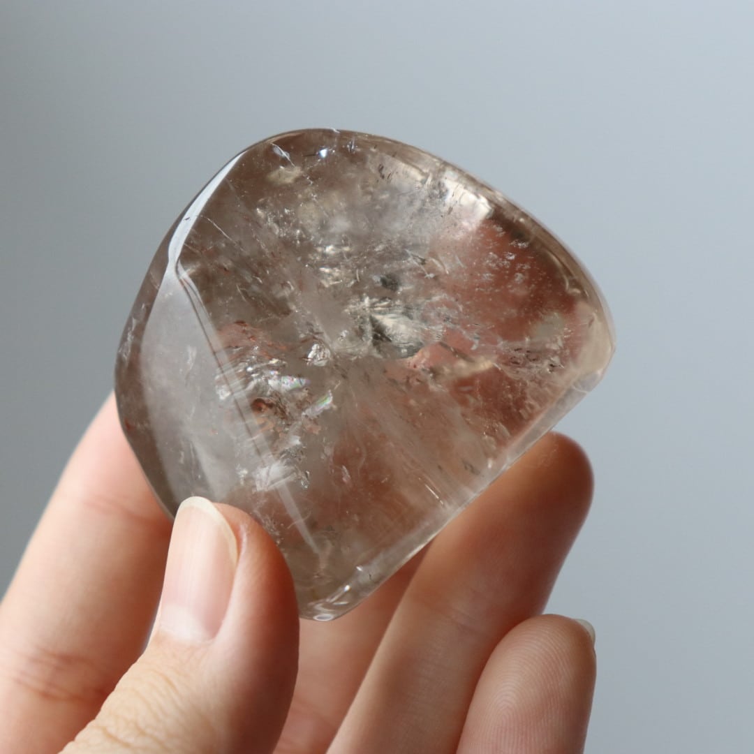 こちらは、とろりと溶けるような透明感と穏やかなブラウンカラーをもつスモーキークォーツ。いくつかのフラットな面を持つフリーフォームに磨かれており、置く角度によって、さまざまな虹やインクルージョンを楽しむことができます。
