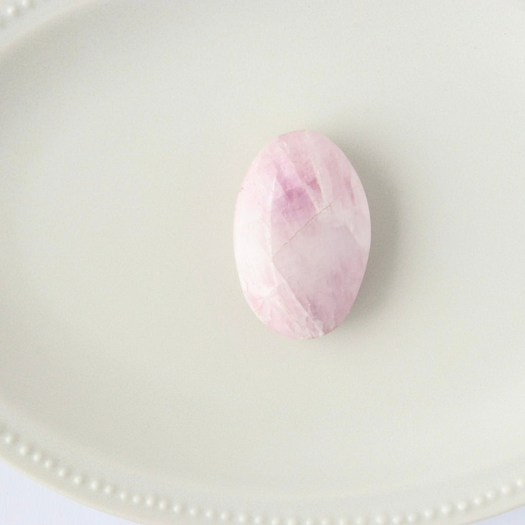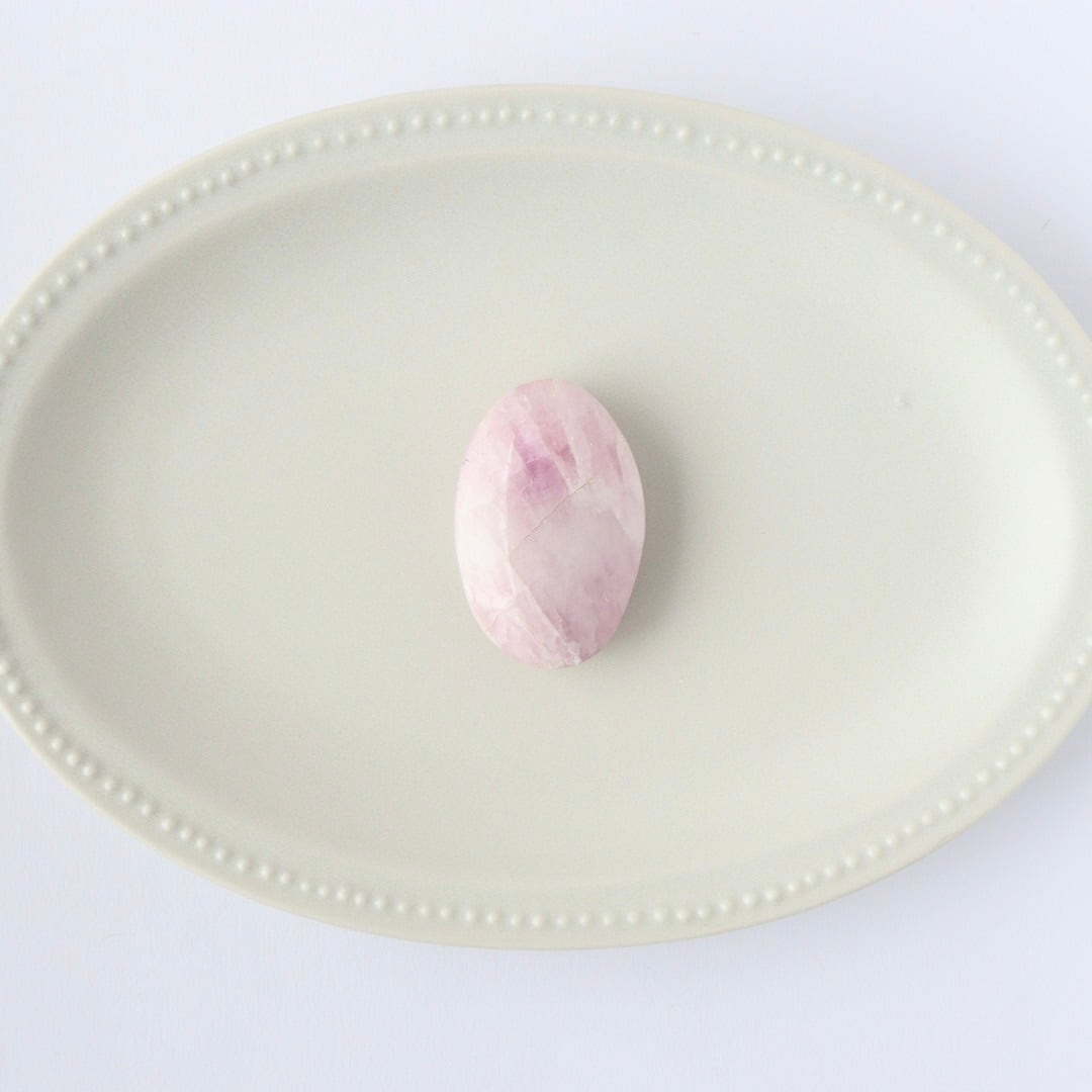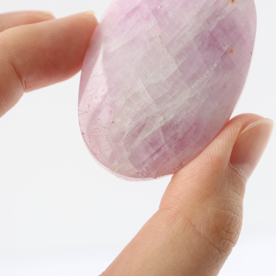 こちらは、柔らかなピンクカラーをベースに、結晶の中に蝶が羽ばたくような美しい繊維が見えるクンツァイトの握り石。