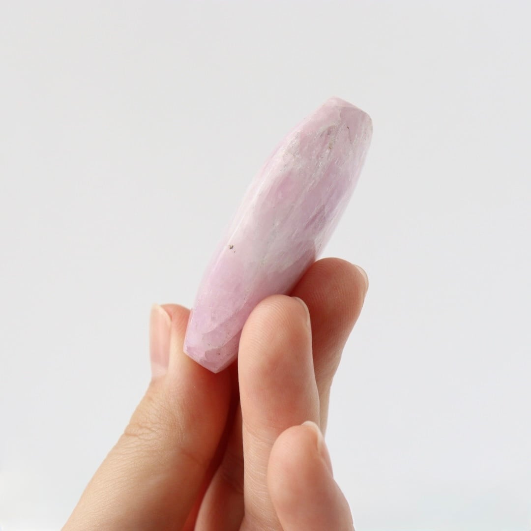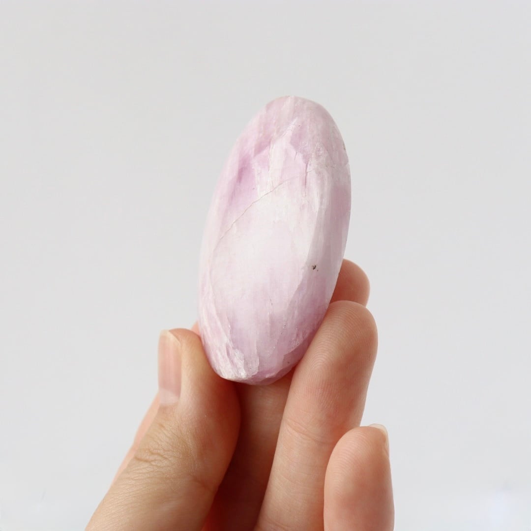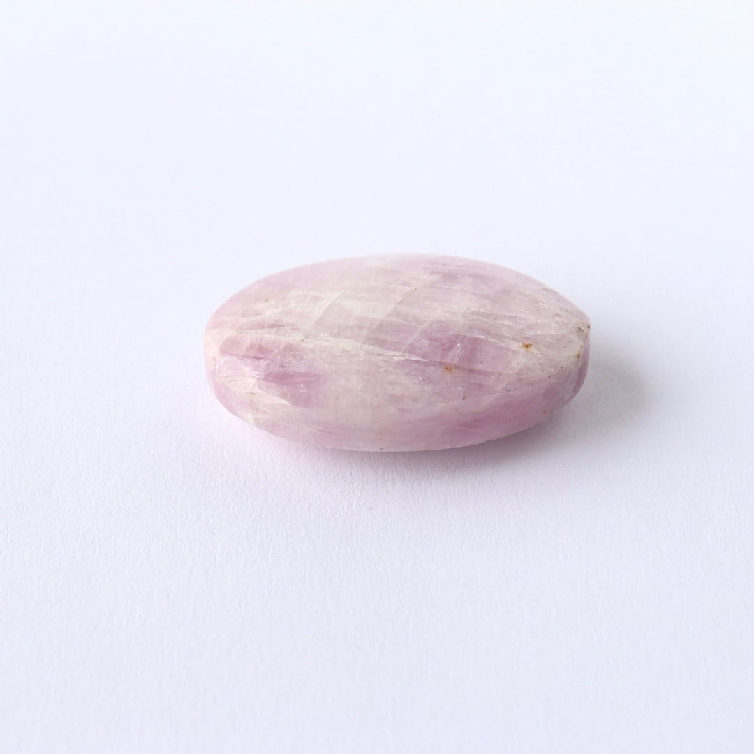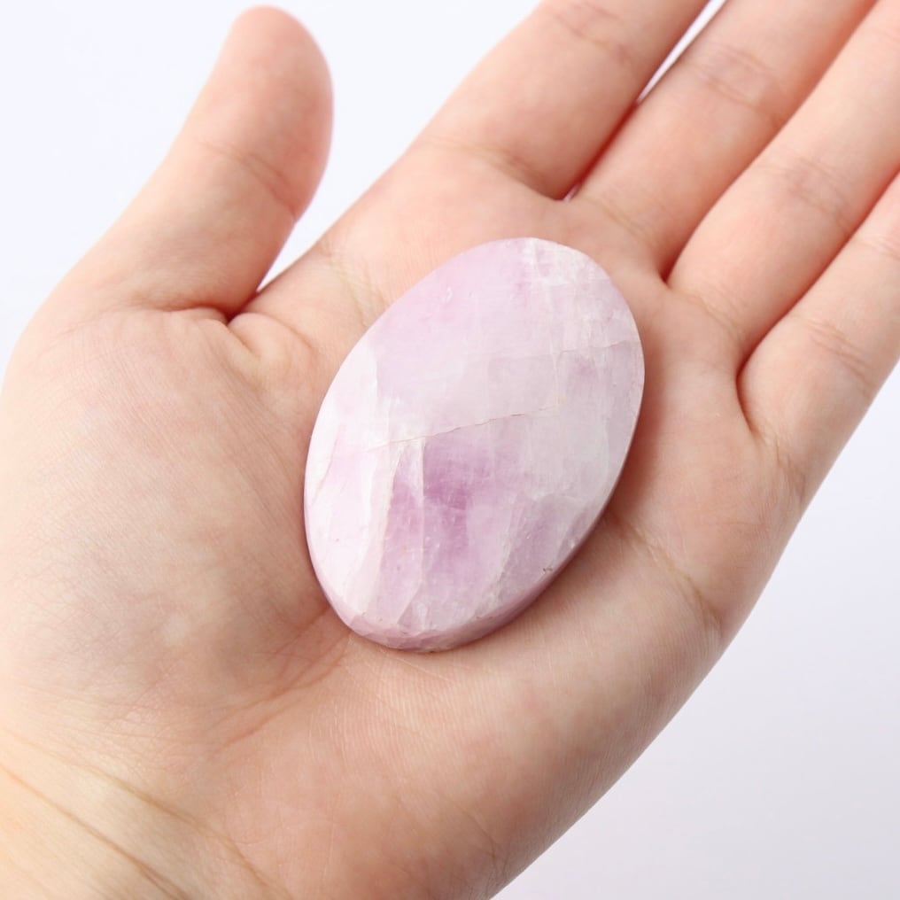 こちらは、柔らかなピンクカラーをベースに、結晶の中に蝶が羽ばたくような美しい繊維が見えるクンツァイトの握り石。