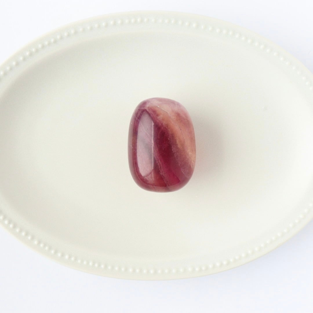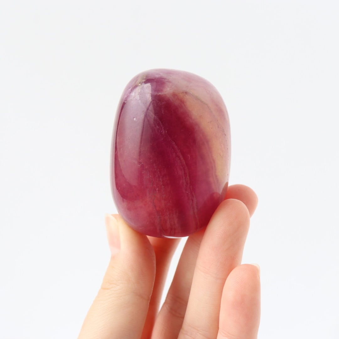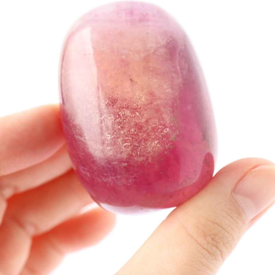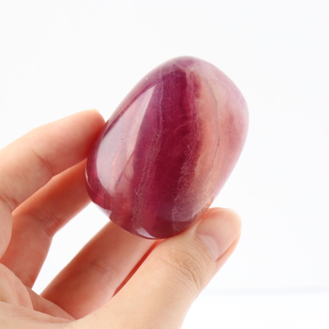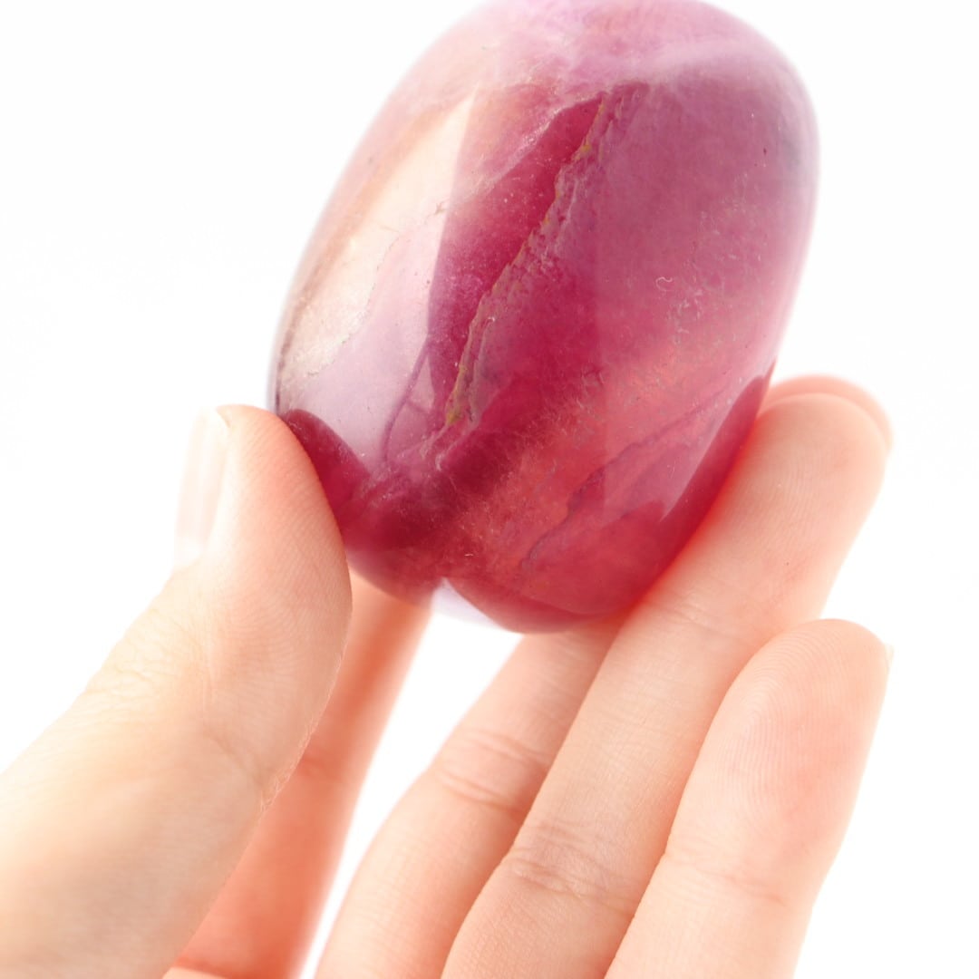 深みのあるピンクパープルが美しい、大きな卵のようなフォルムのフローライトタンブル。