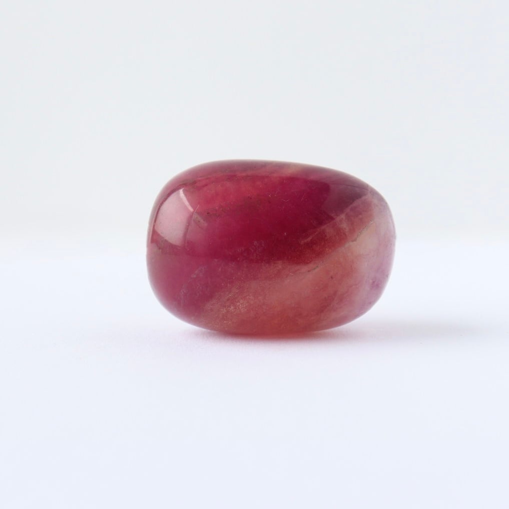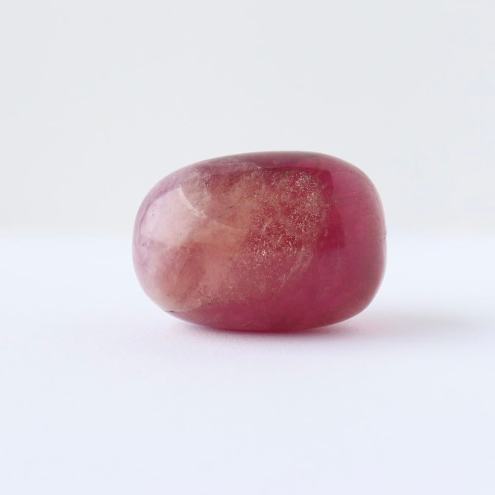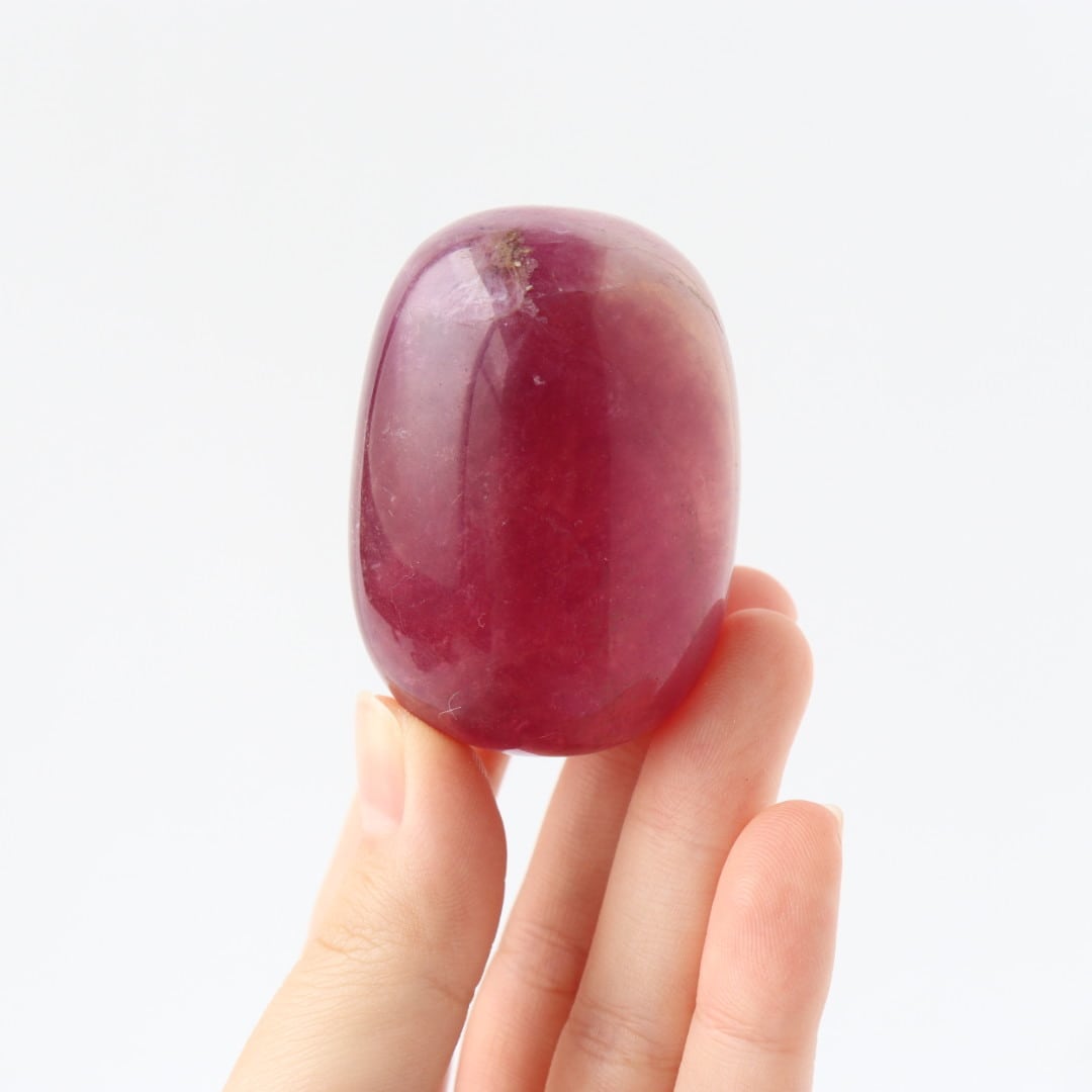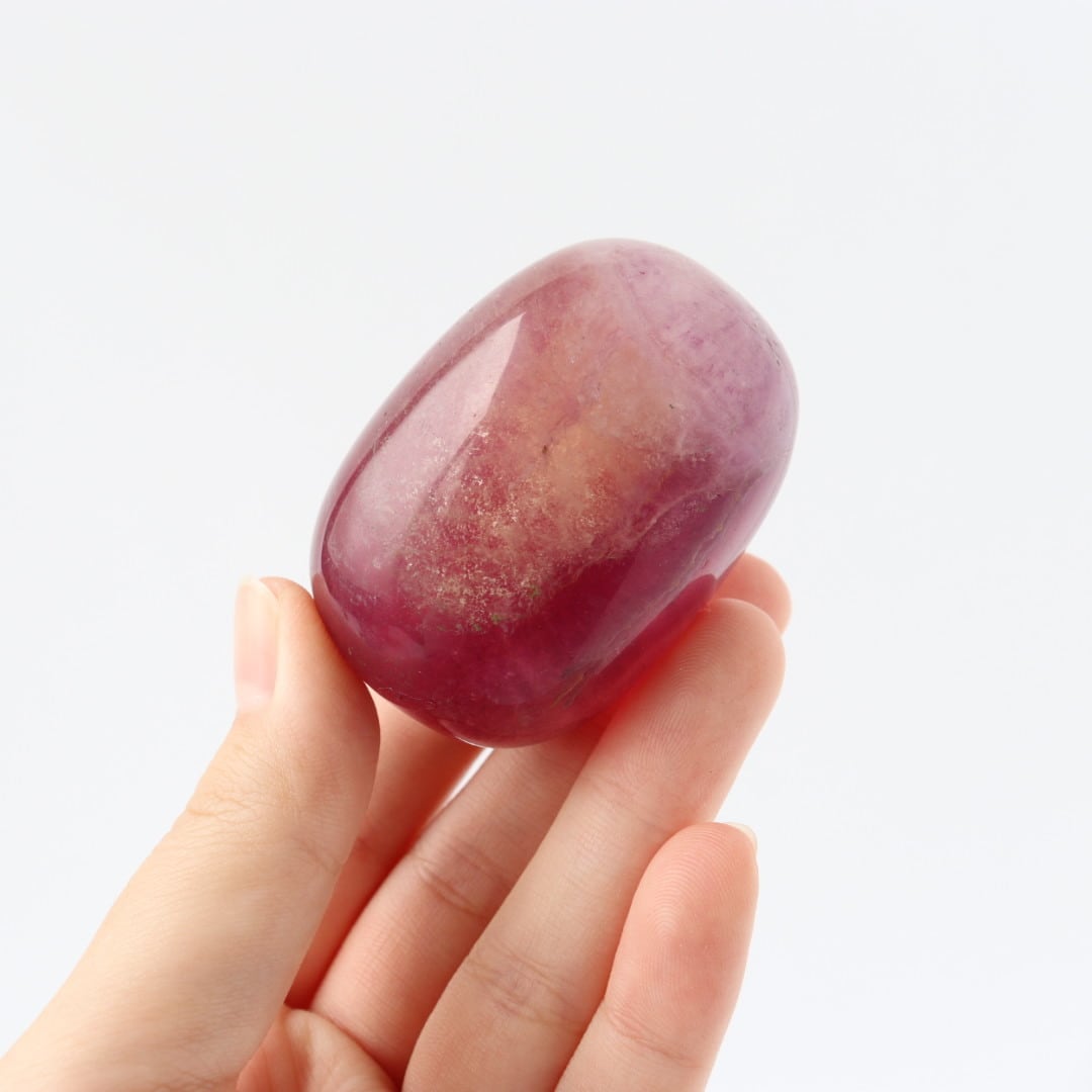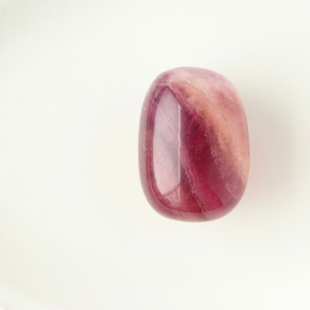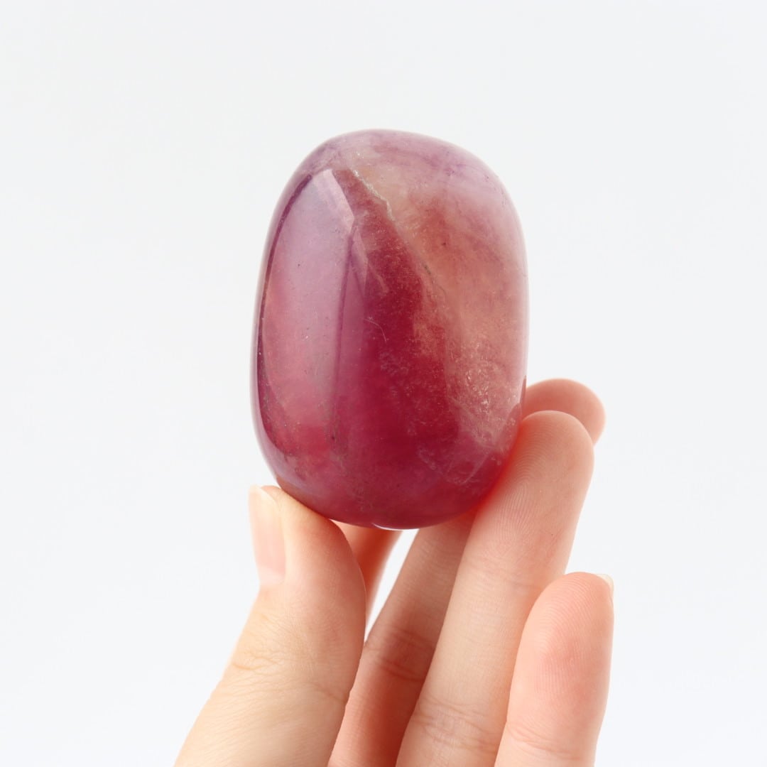 深みのあるピンクパープルが美しい、大きな卵のようなフォルムのフローライトタンブル。