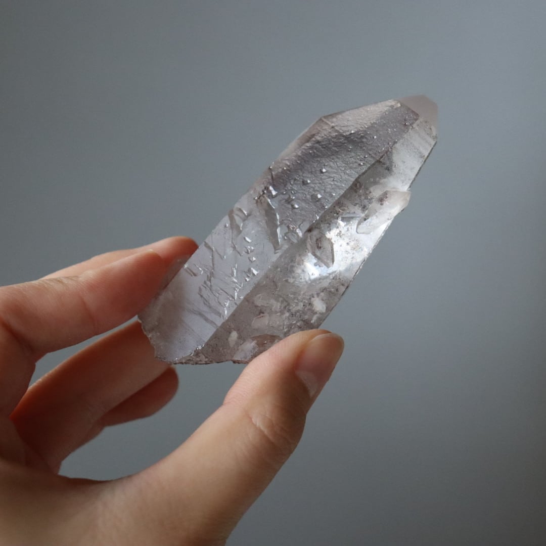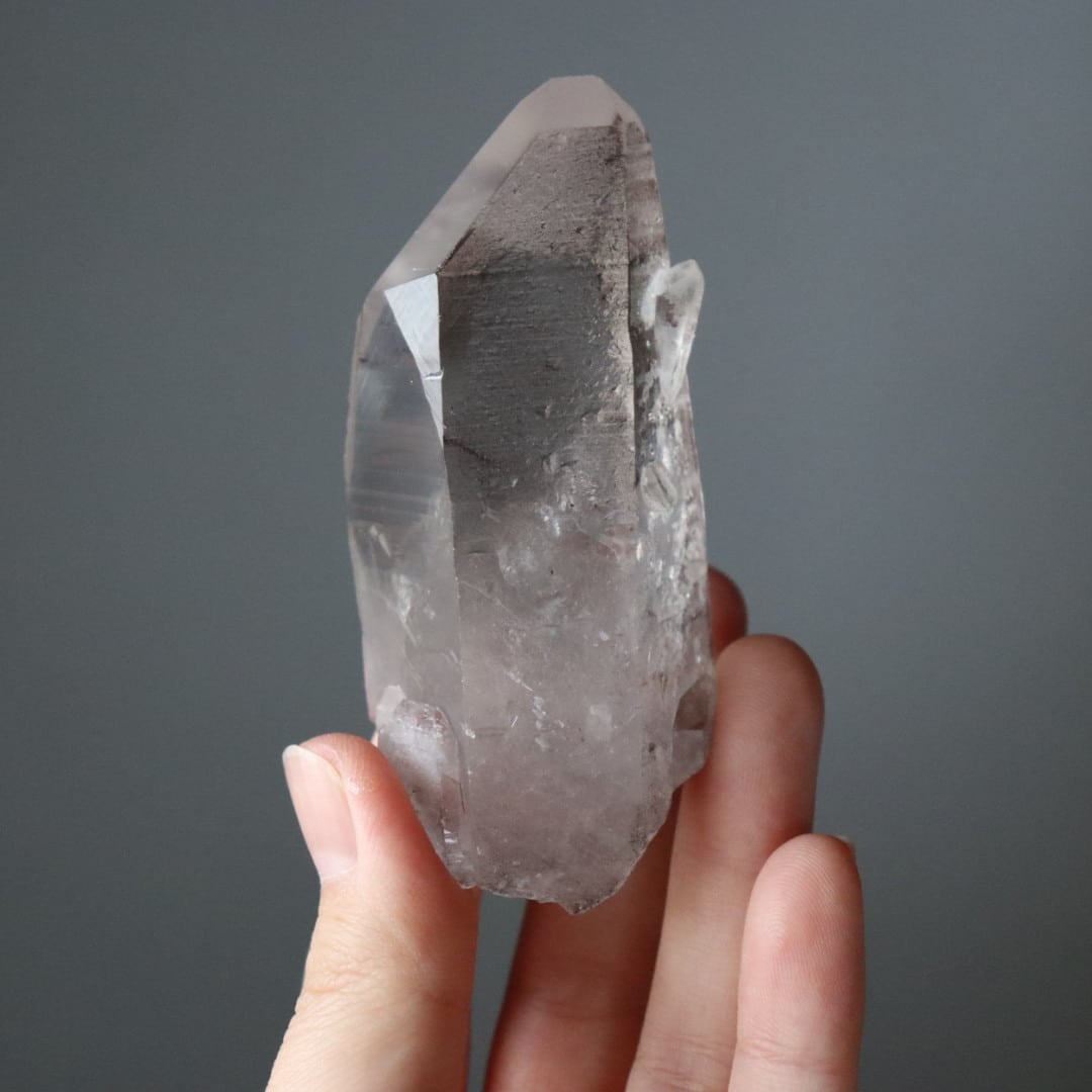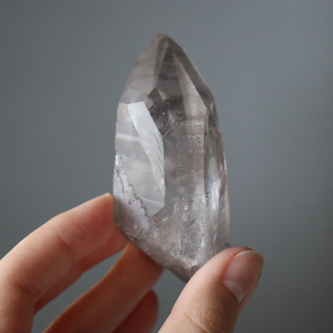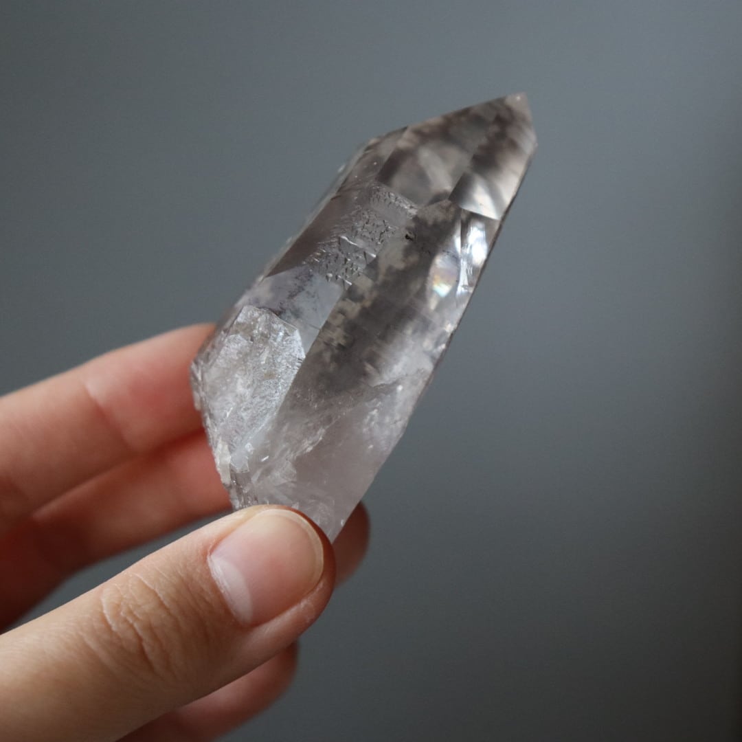 すっと伸びた美しい結晶に、星の名を宿す模様が浮かび上がる、スターブラリークォーツの原石ポイント。