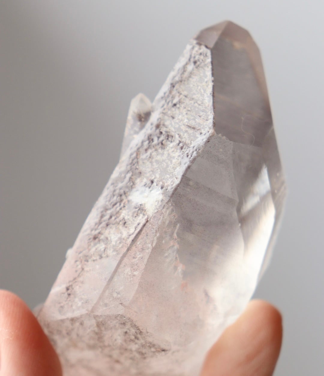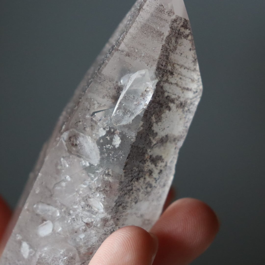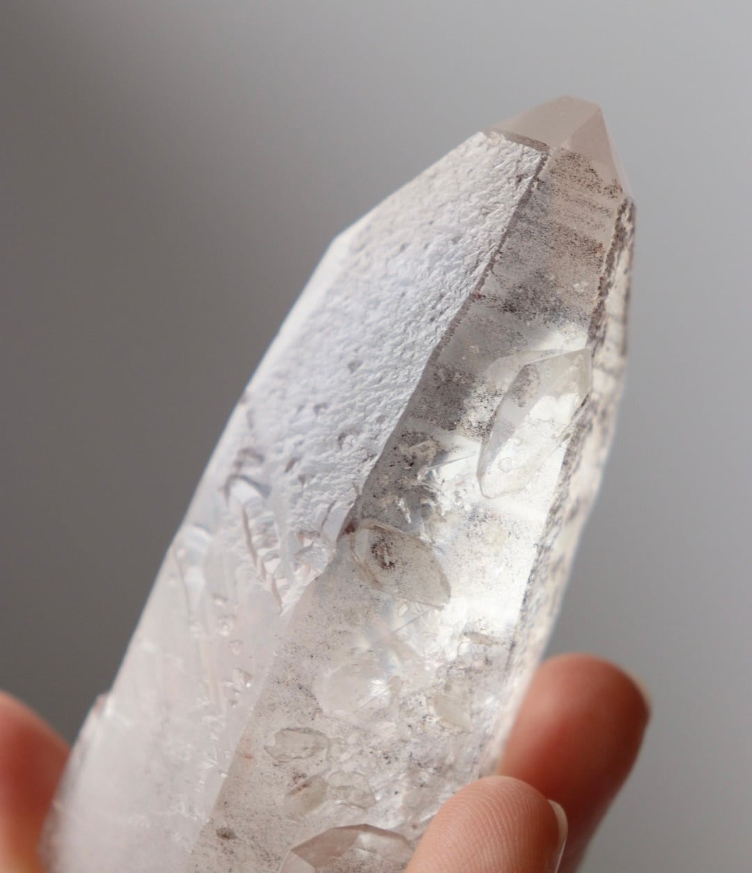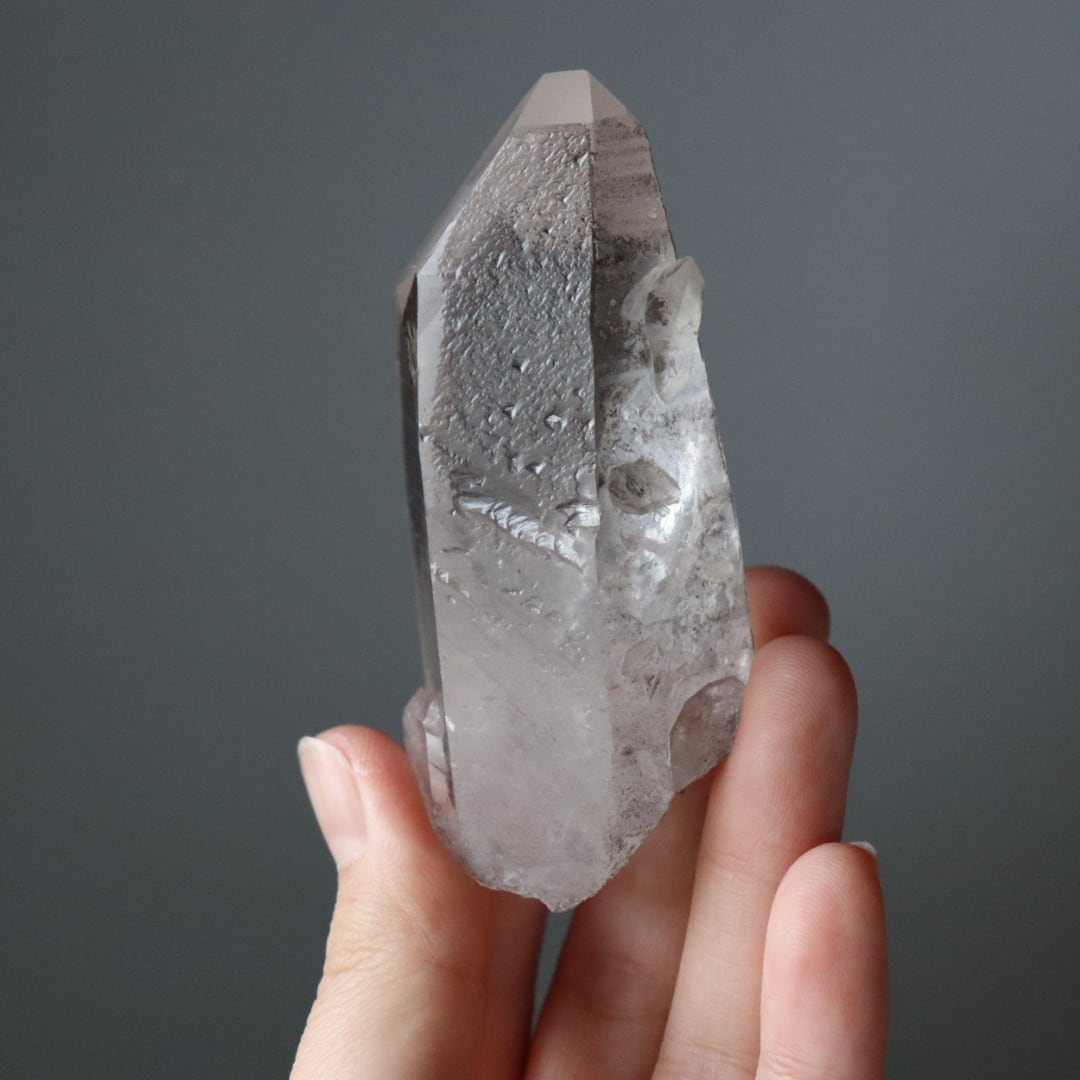 すっと伸びた美しい結晶に、星の名を宿す模様が浮かび上がる、スターブラリークォーツの原石ポイント。