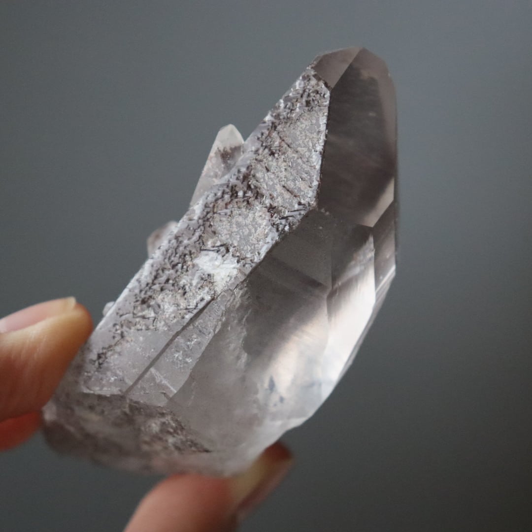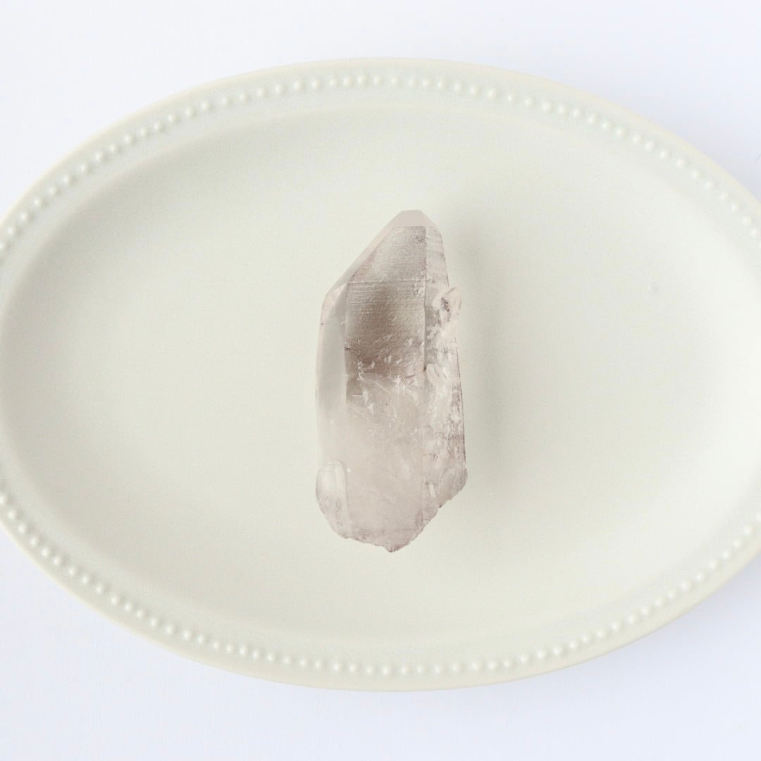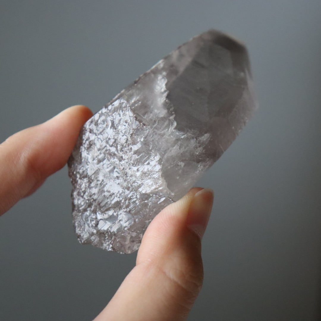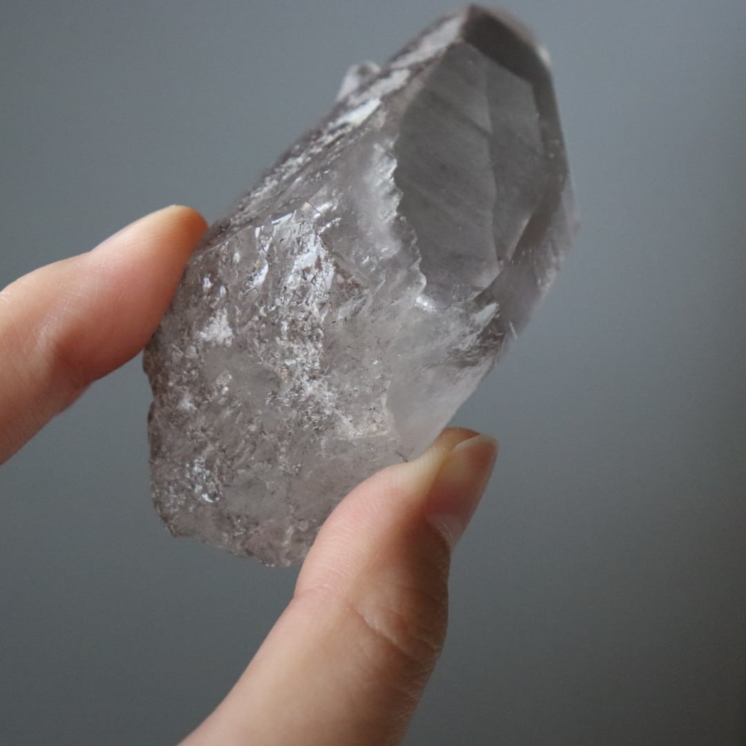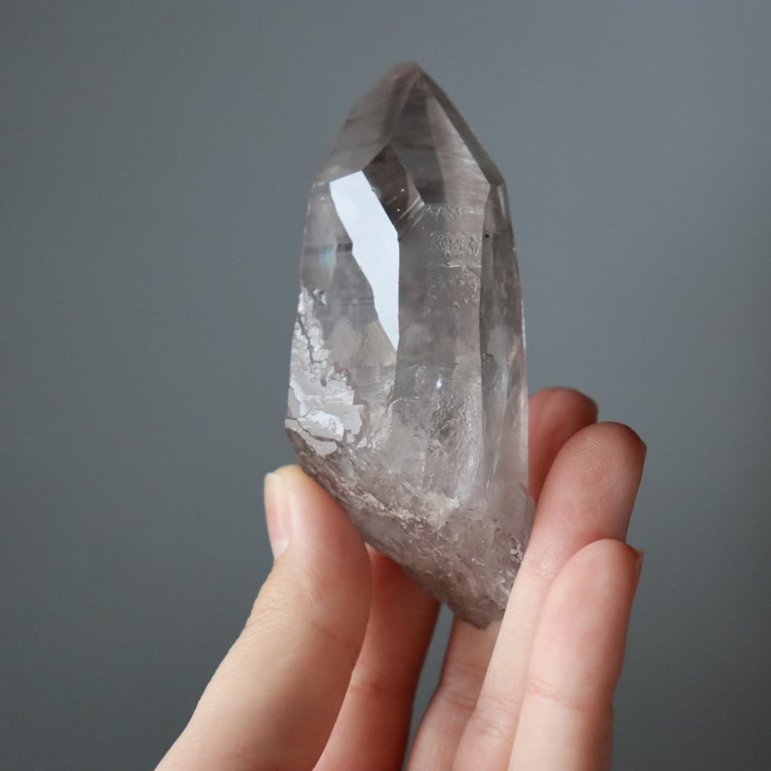 こちらは、圧倒的な透明感とほんのりブラウンの色味が美しいスターブラリークォーツのポイント。ファセットが磨かれたセミポリッシュ仕上げです。