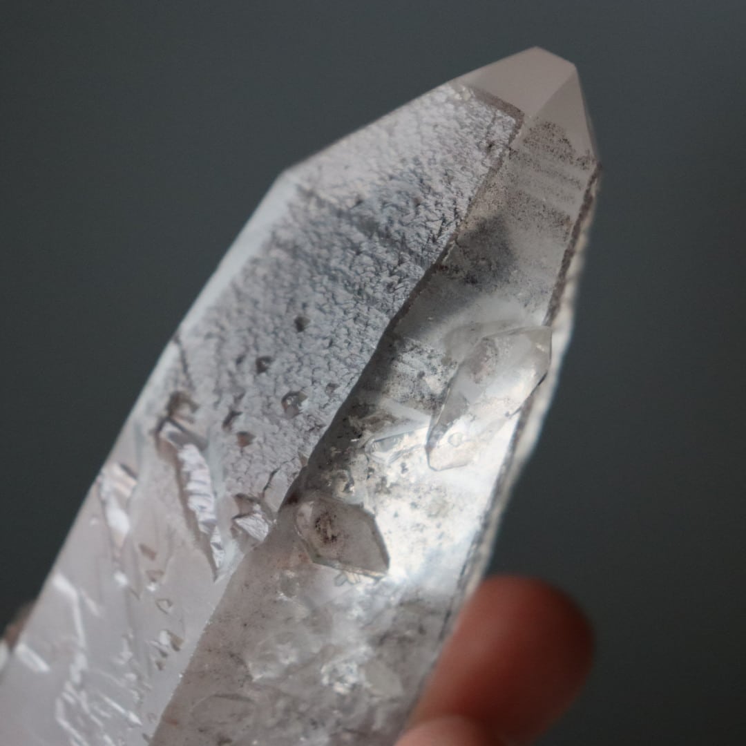 一見すると欠けたように見える底面も、実際には一度破断した後に再結晶して成長した痕跡が残されており、水晶の生命力を感じさせる造形となっています。