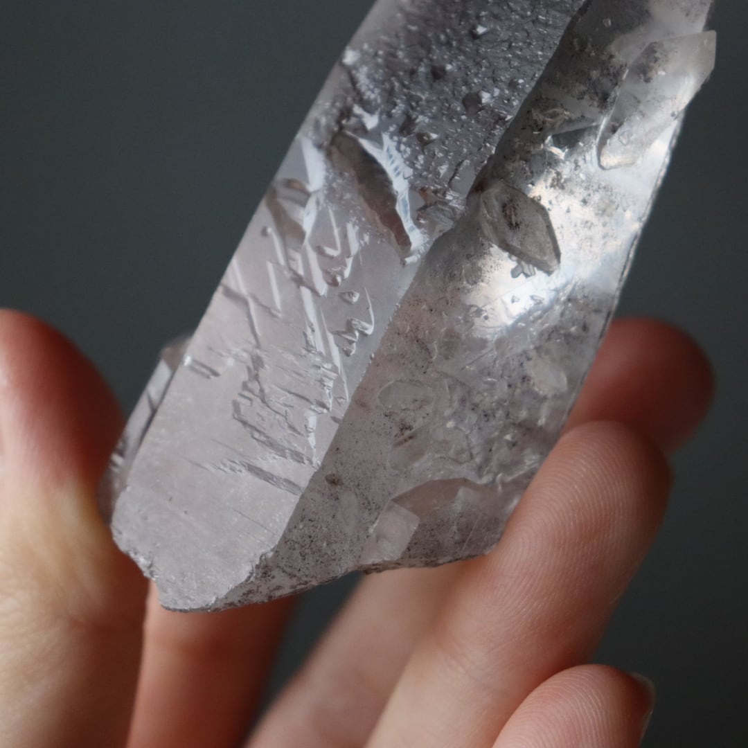 スターブラリークォーツは、結晶成長の過程で特殊な環境条件が重なることで生まれる水晶で、柱面にはエッチド現象と呼ばれる蝕像模様(グリフ)が現れることで有名です。