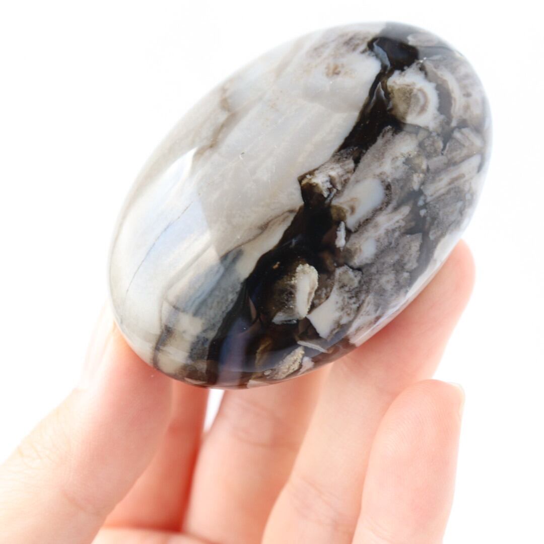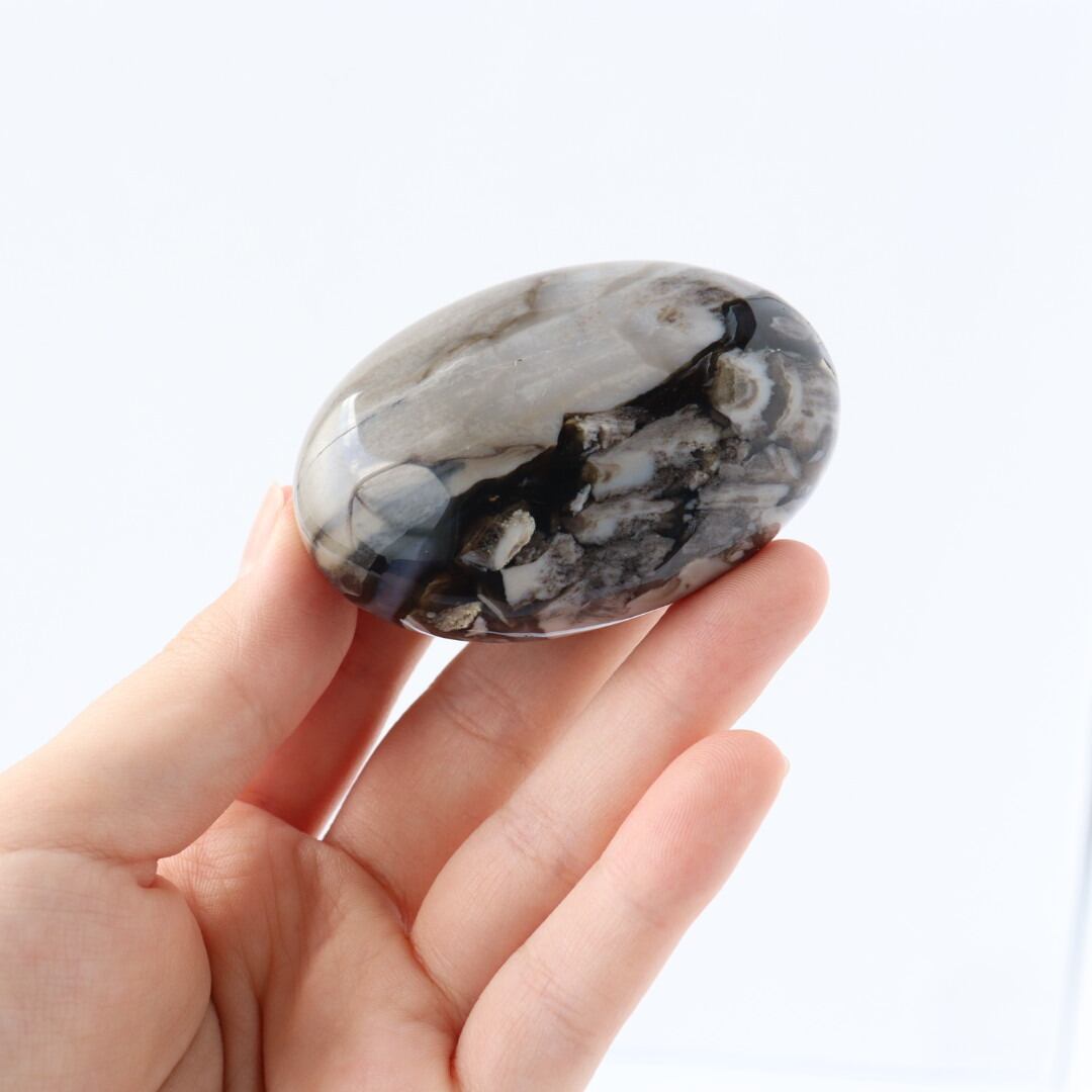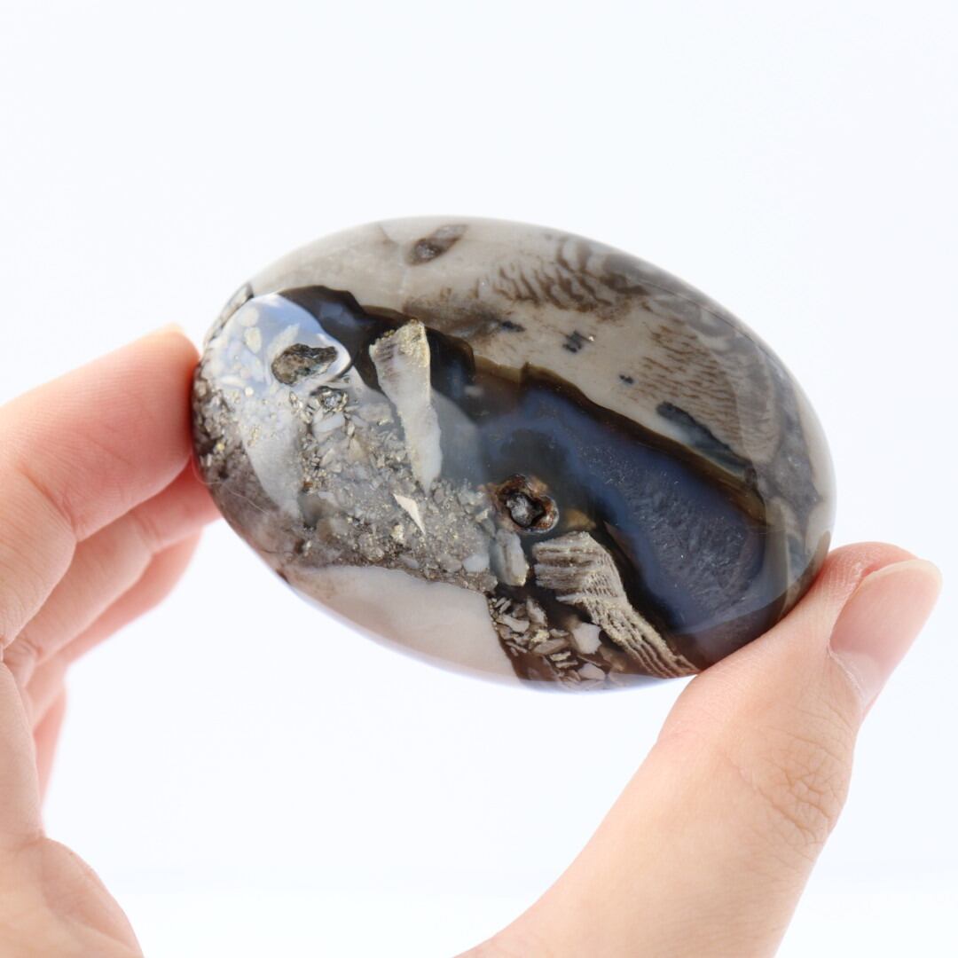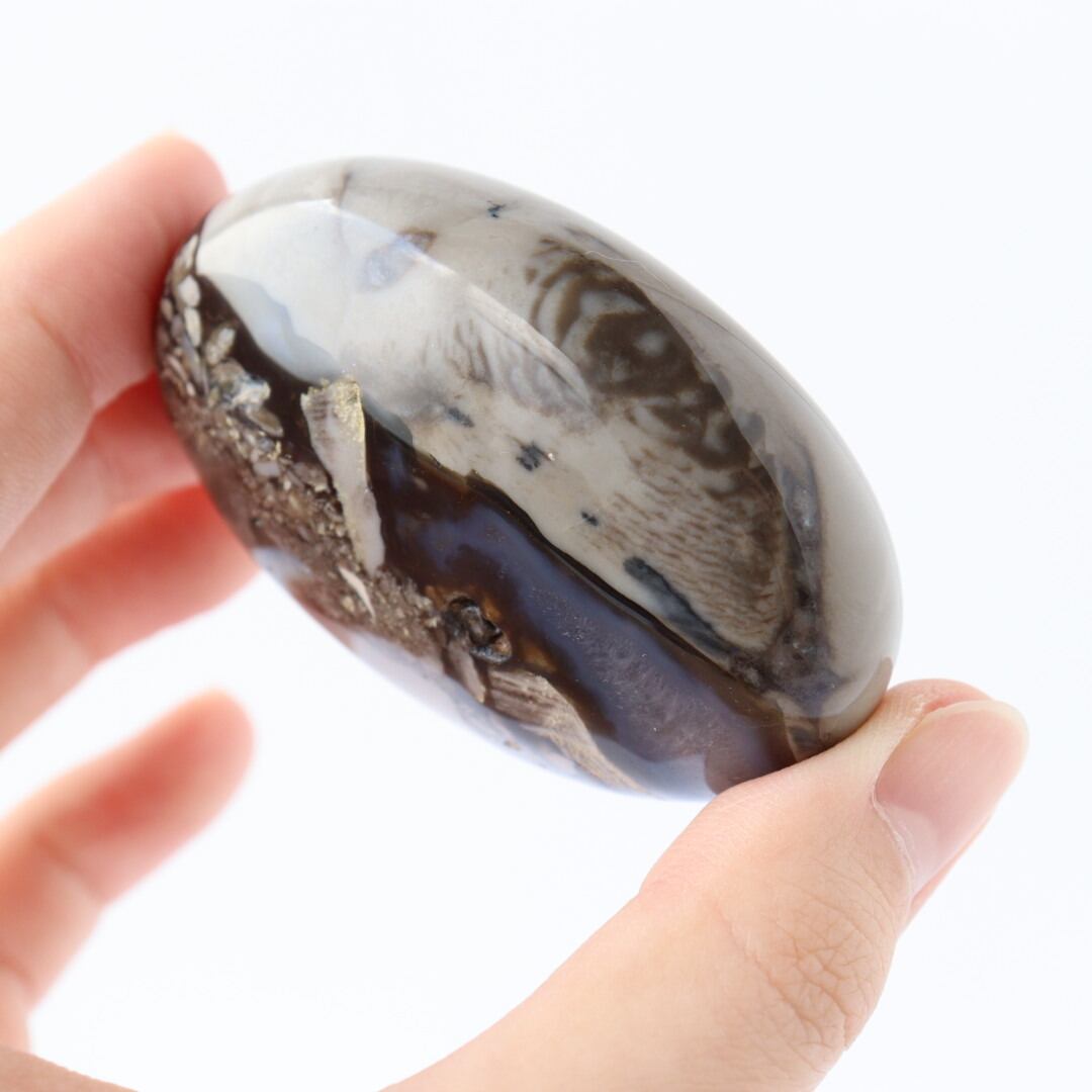 堆積したような模様とブラックのアゲートが美しい、ヴォルケーノアゲートの握り石。