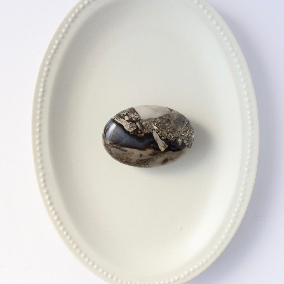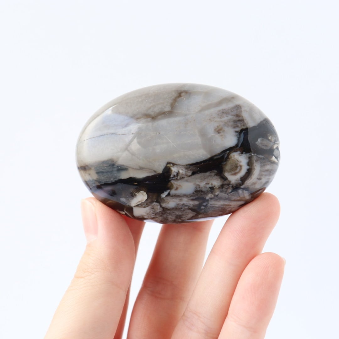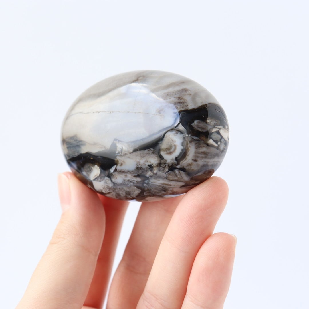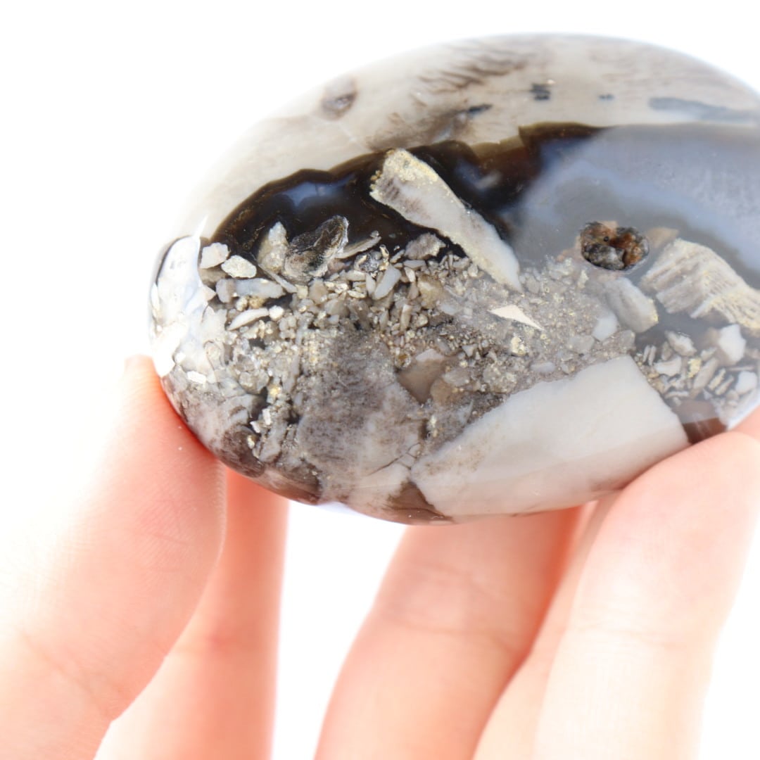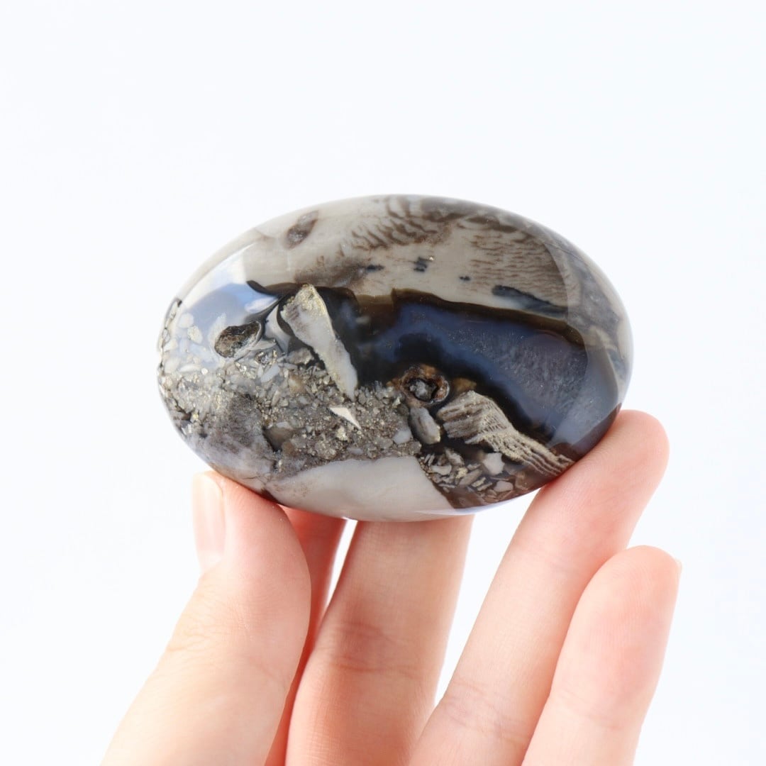 堆積したような模様とブラックのアゲートが美しい、ヴォルケーノアゲートの握り石。