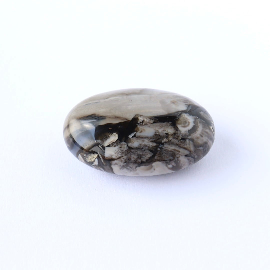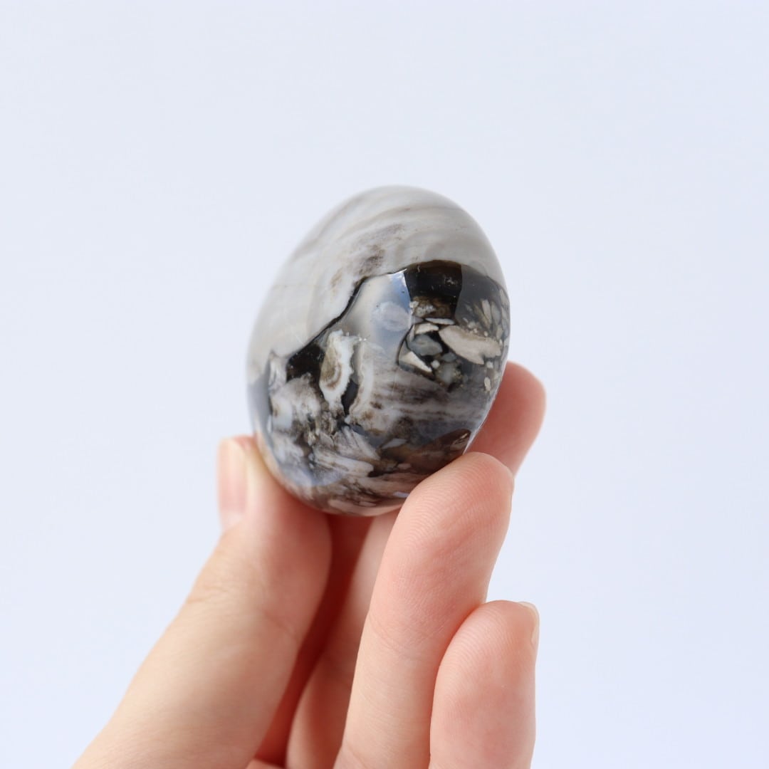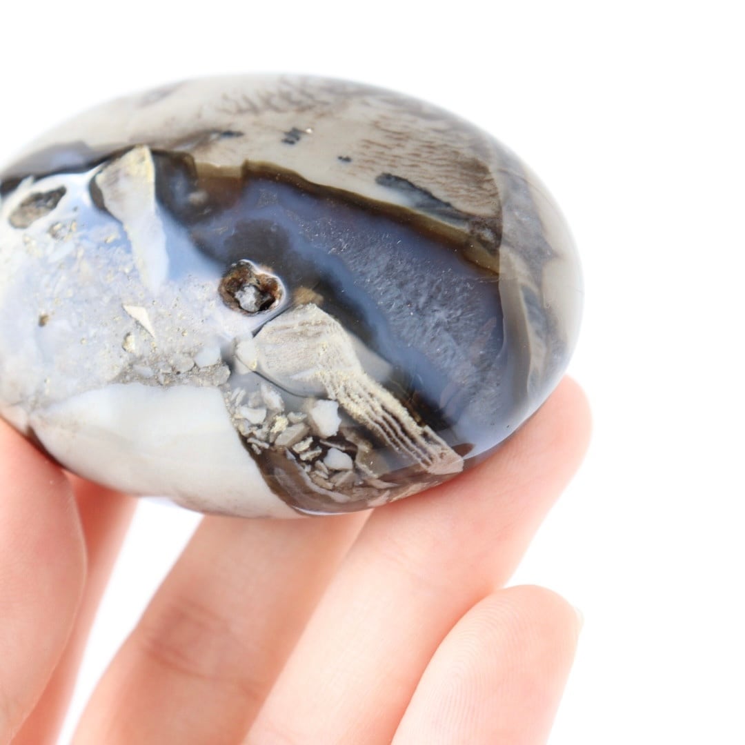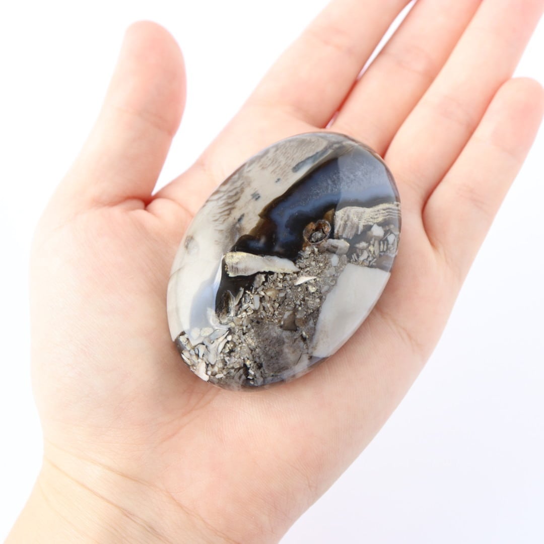 堆積したような模様とブラックのアゲートが美しい、ヴォルケーノアゲートの握り石。
