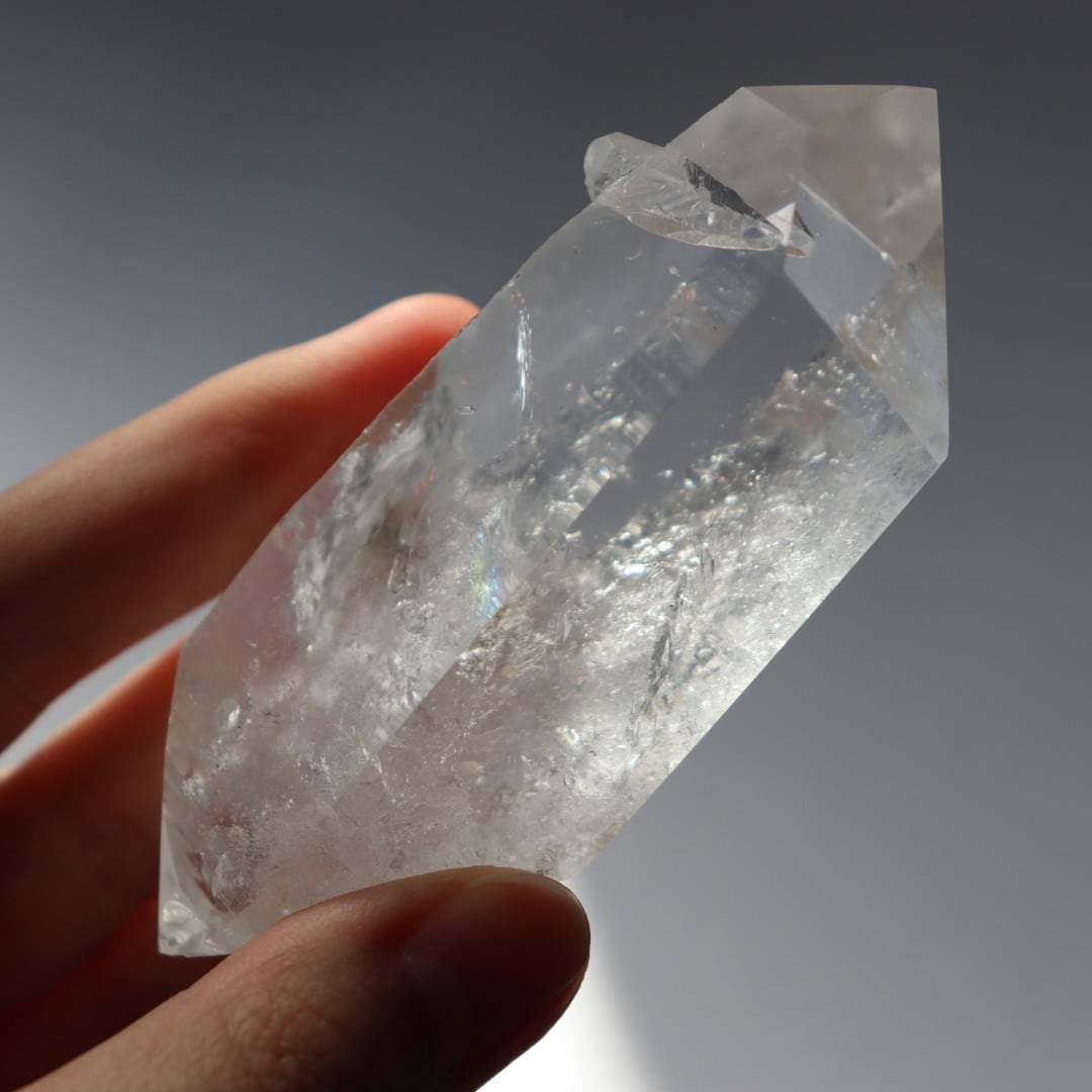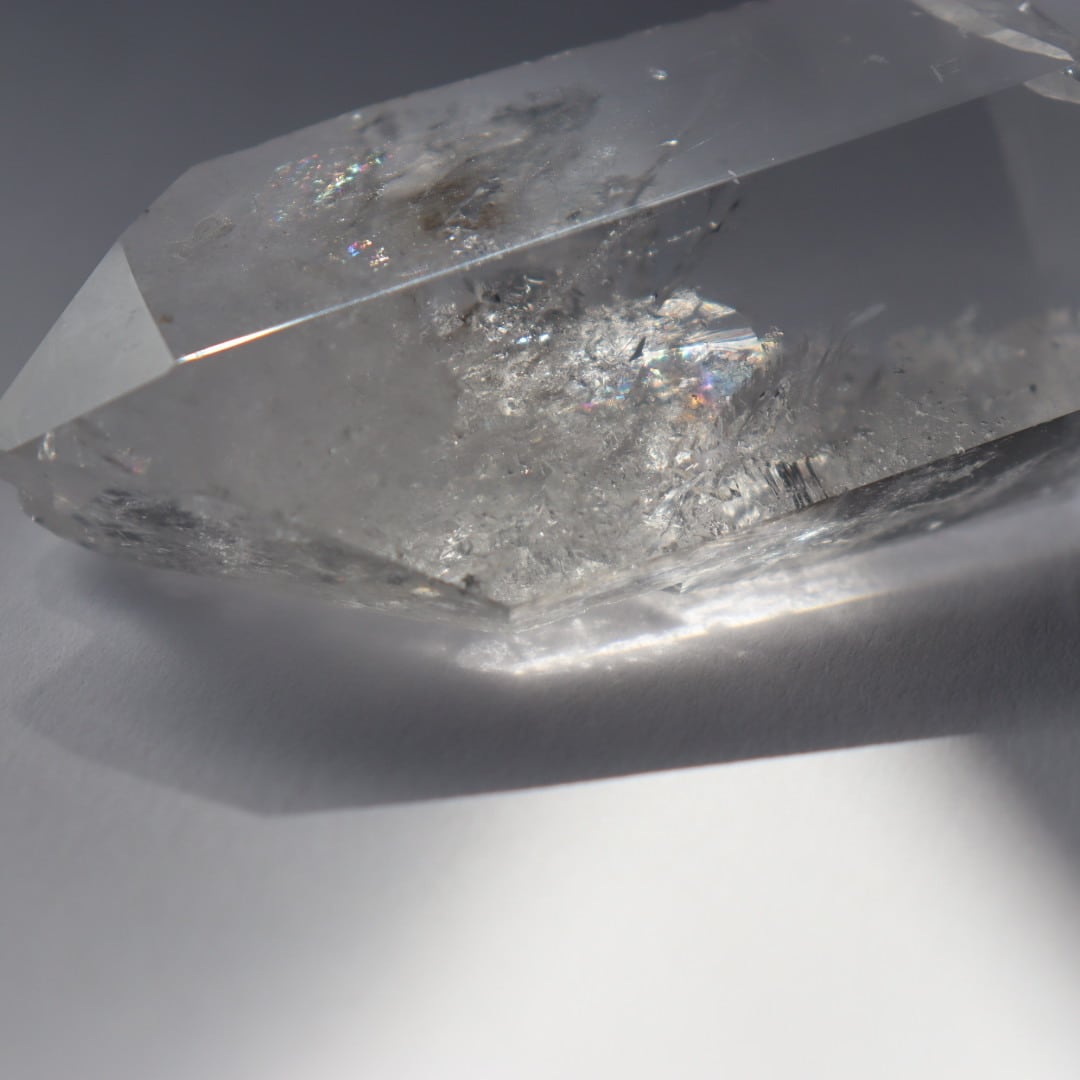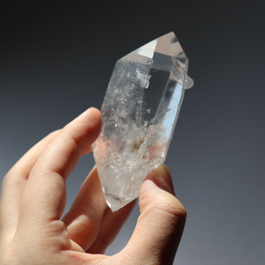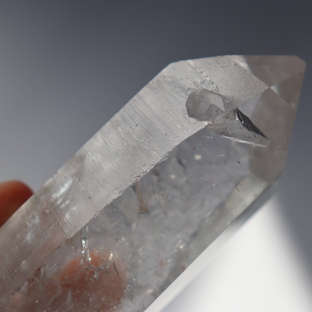 トップ付近には別の小さな水晶が内部に貫入しており、さらに驚くべきことにその貫入した結晶がダブルターミネーテッド(両剣)に成長しています。、