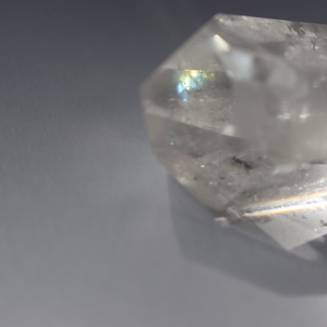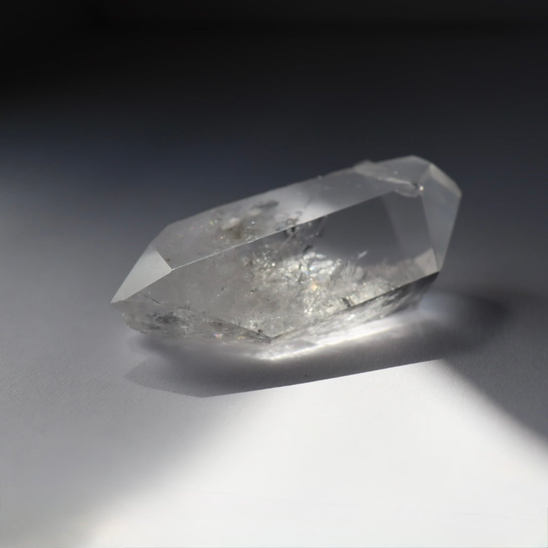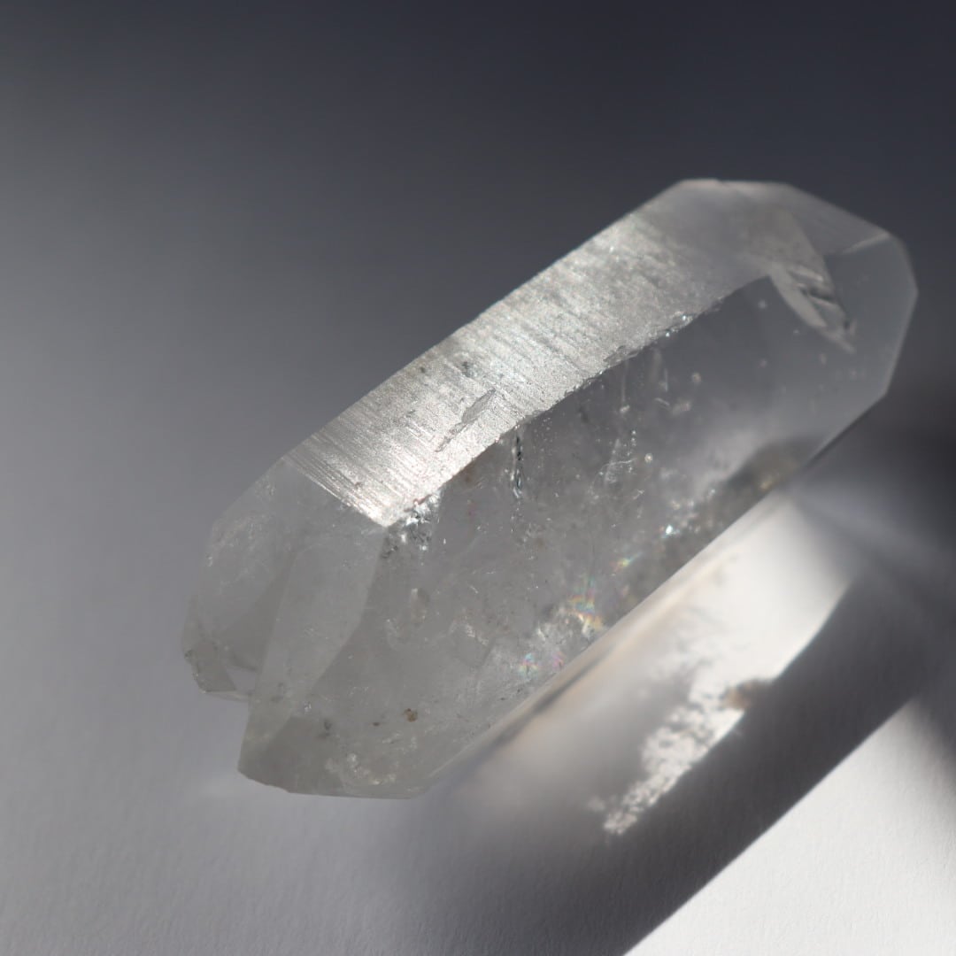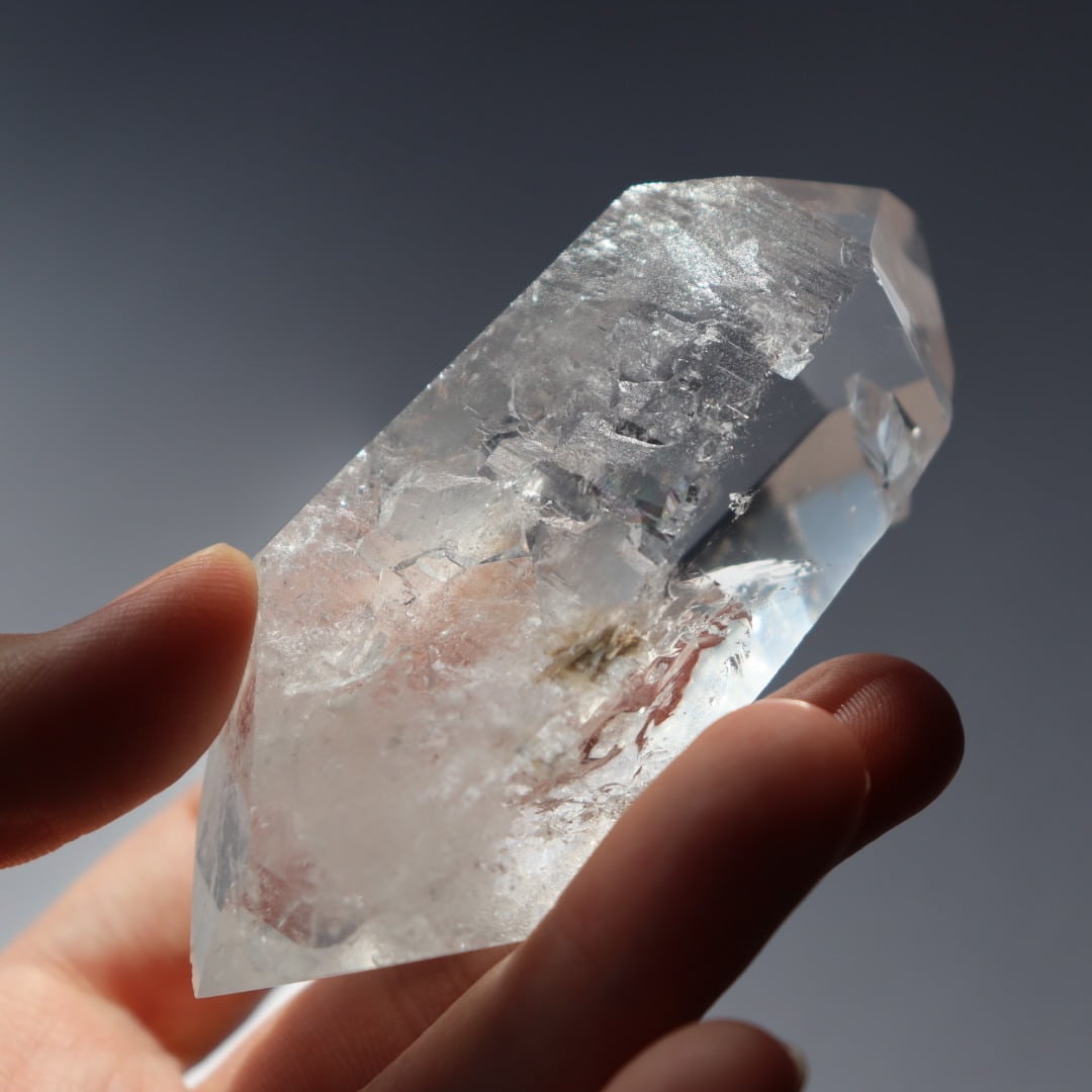 トップ付近には別の小さな水晶が内部に貫入しており、さらに驚くべきことにその貫入した結晶がダブルターミネーテッド(両剣)に成長しています。、