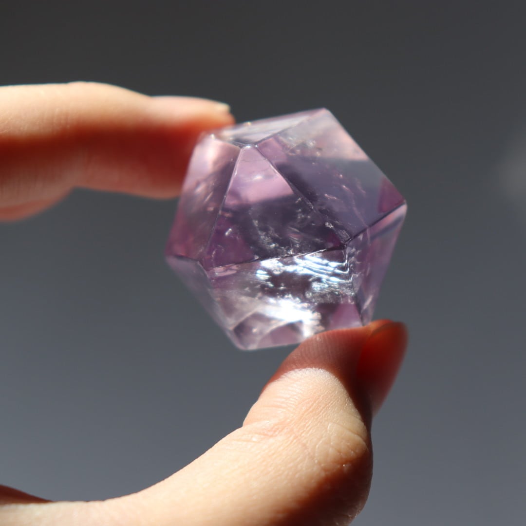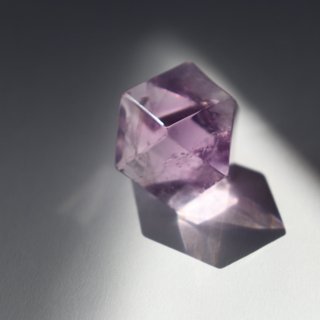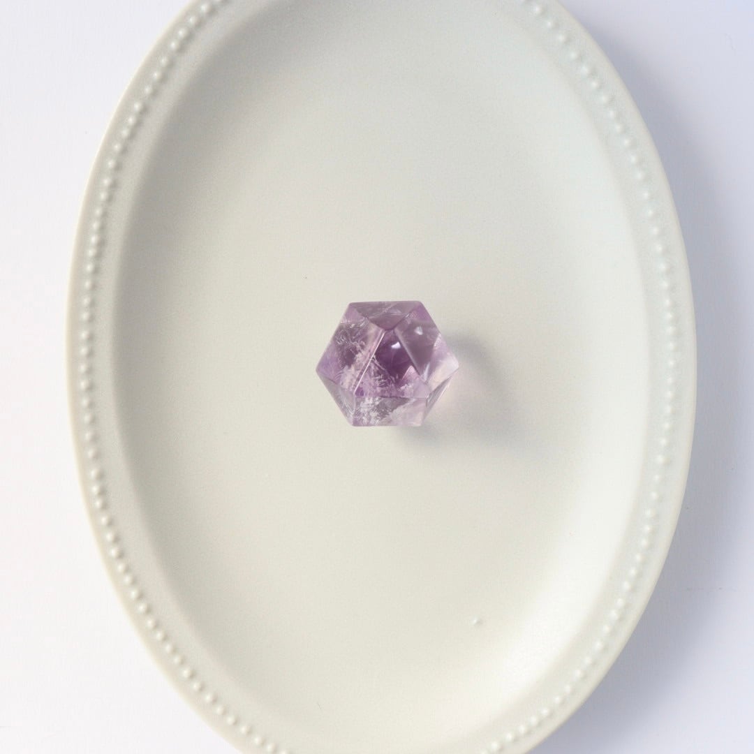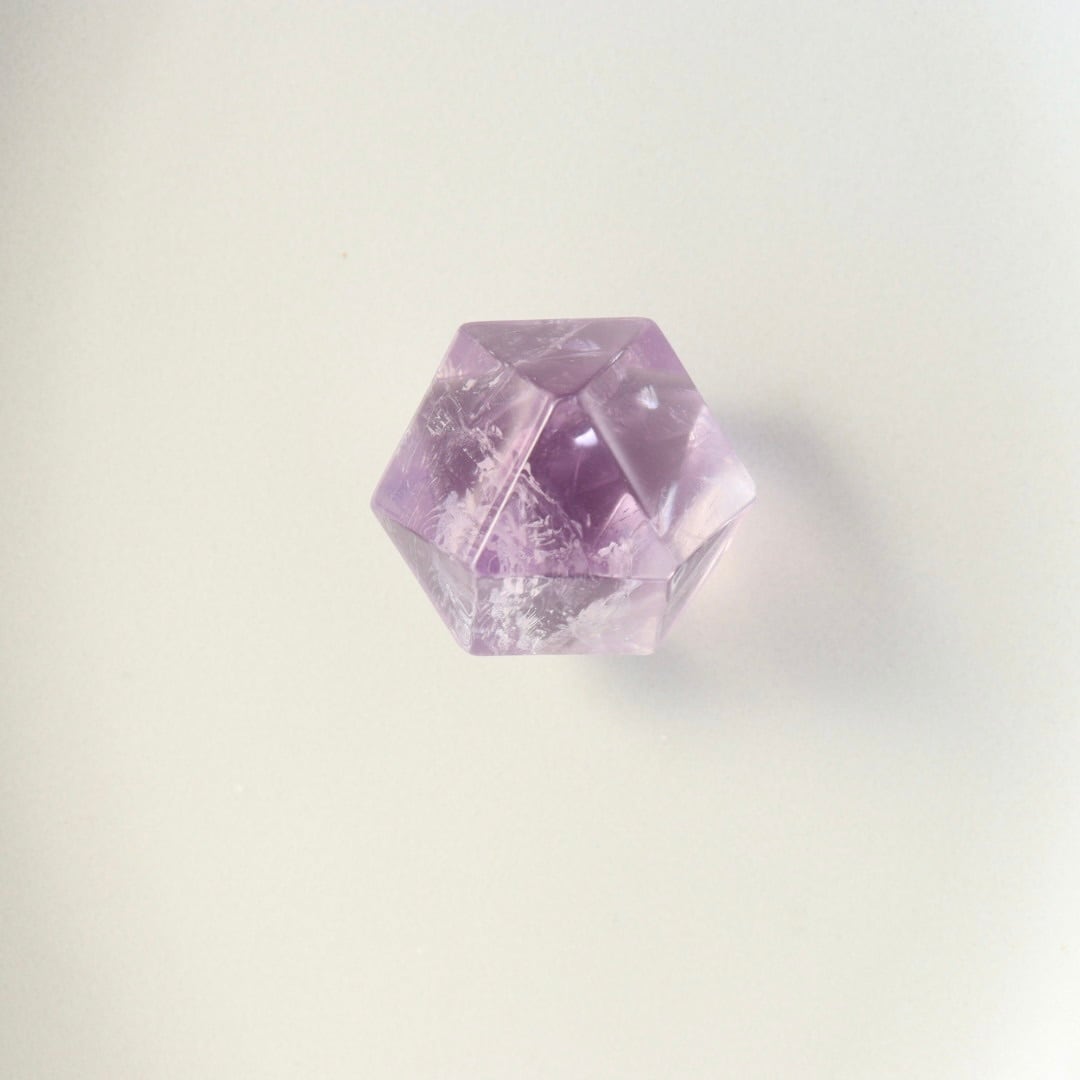 透明度の高いアメジストが幾何学的なフォルムに磨かれた、アメジストの多面体。