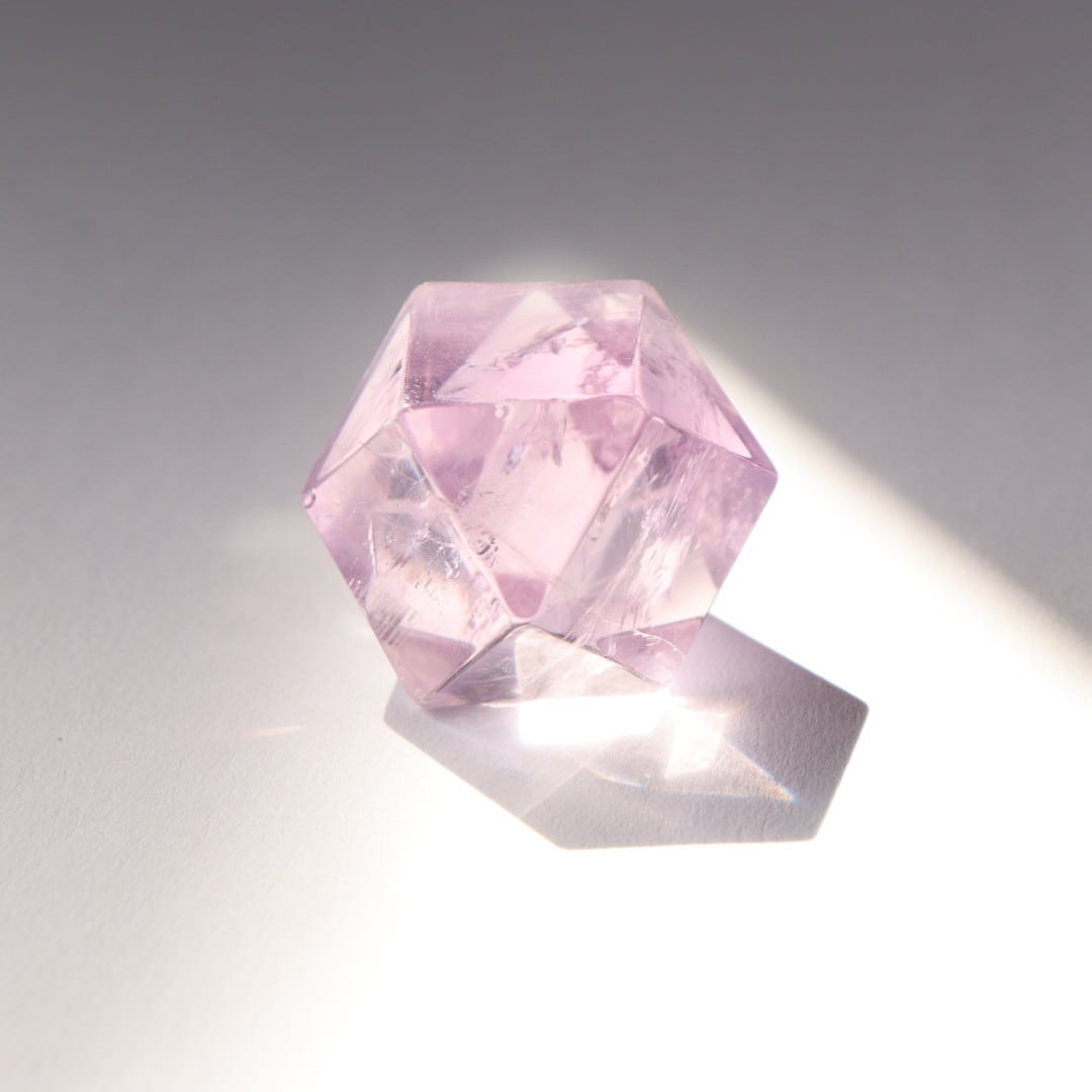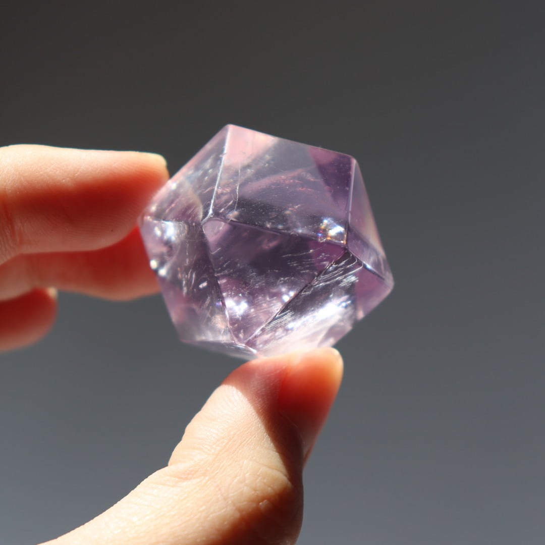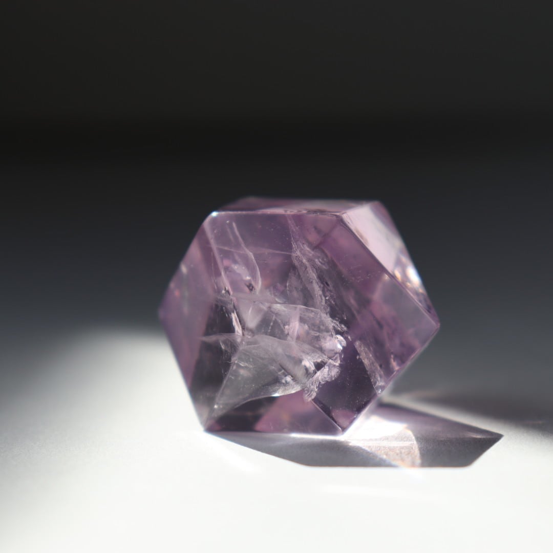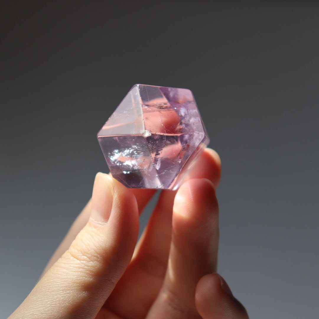 透明度の高いアメジストが幾何学的なフォルムに磨かれた、アメジストの多面体。