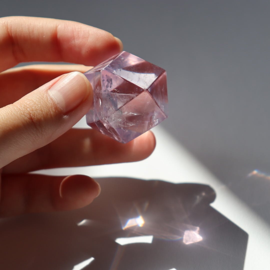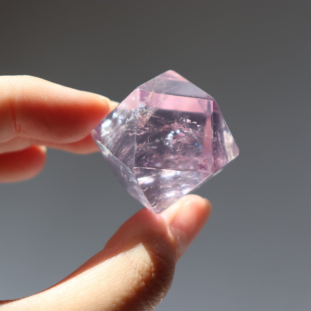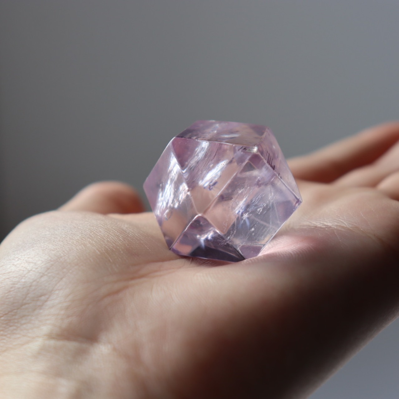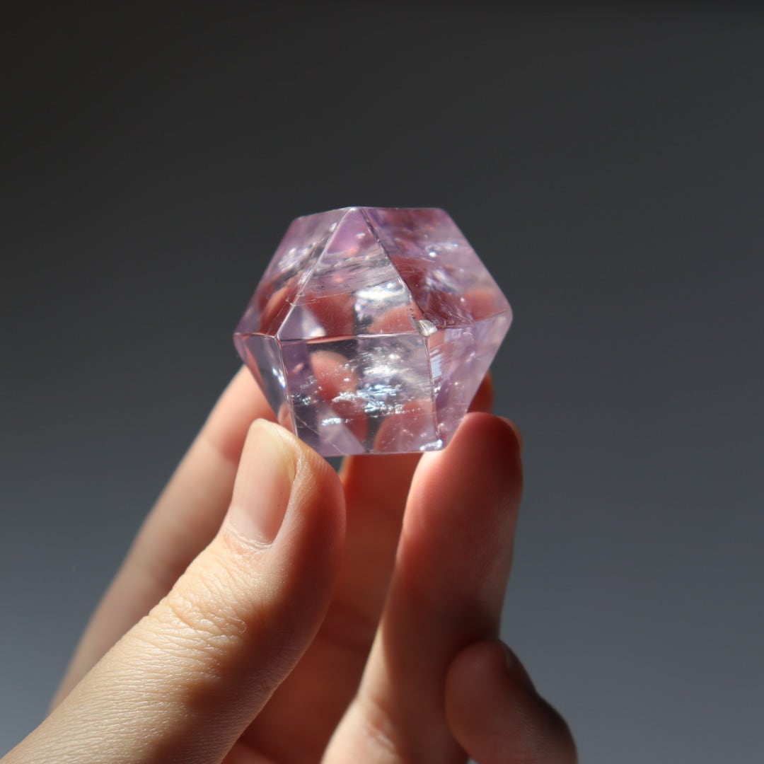 透明度の高いアメジストが幾何学的なフォルムに磨かれた、アメジストの多面体。