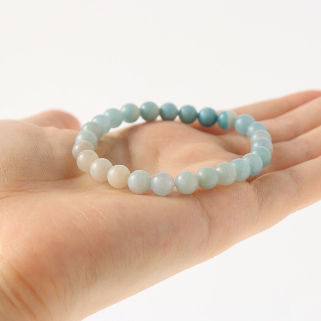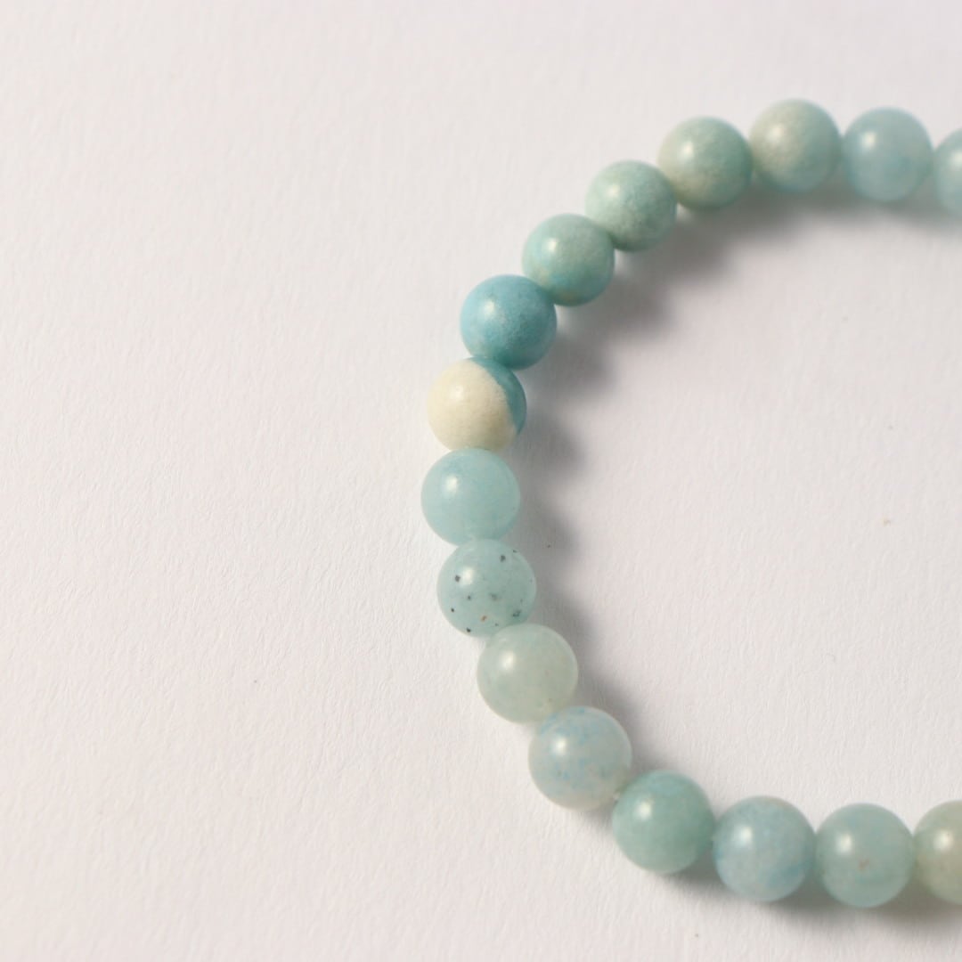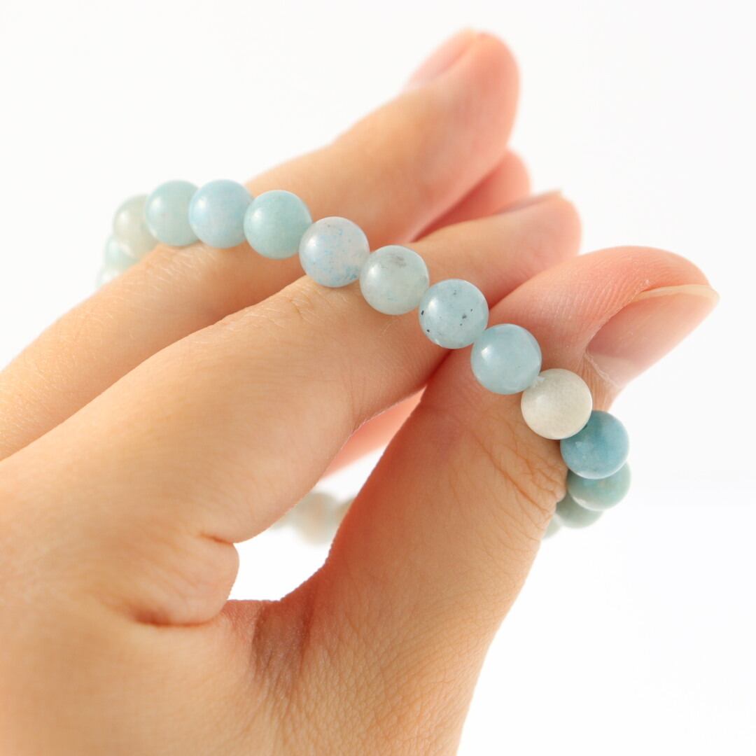 淡いホワイトグレーから鮮やかなスカイブルーへ移ろう、トロレアイトのブレスレット。