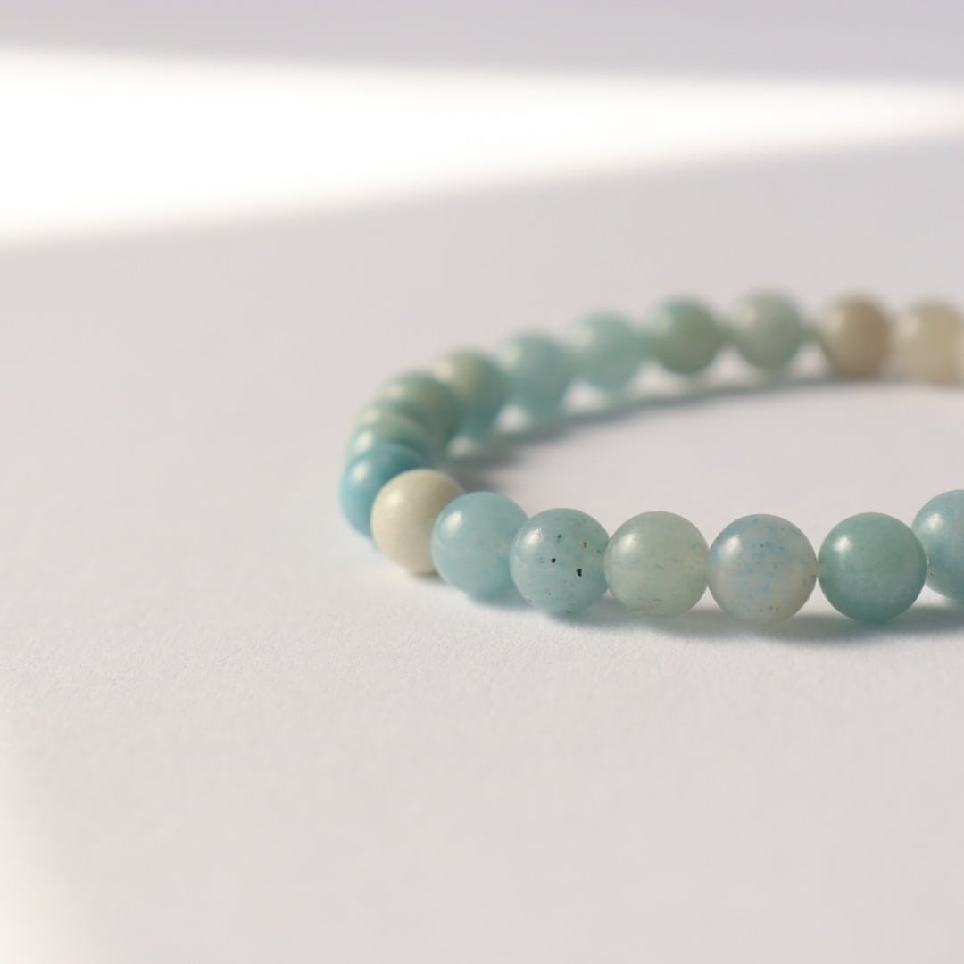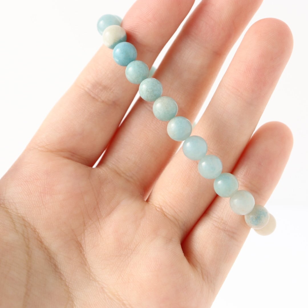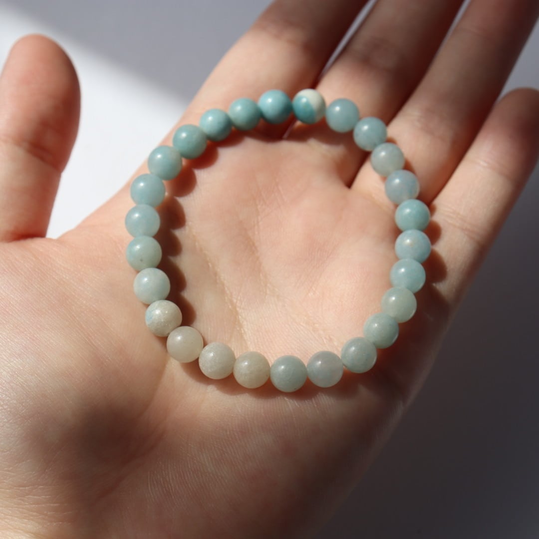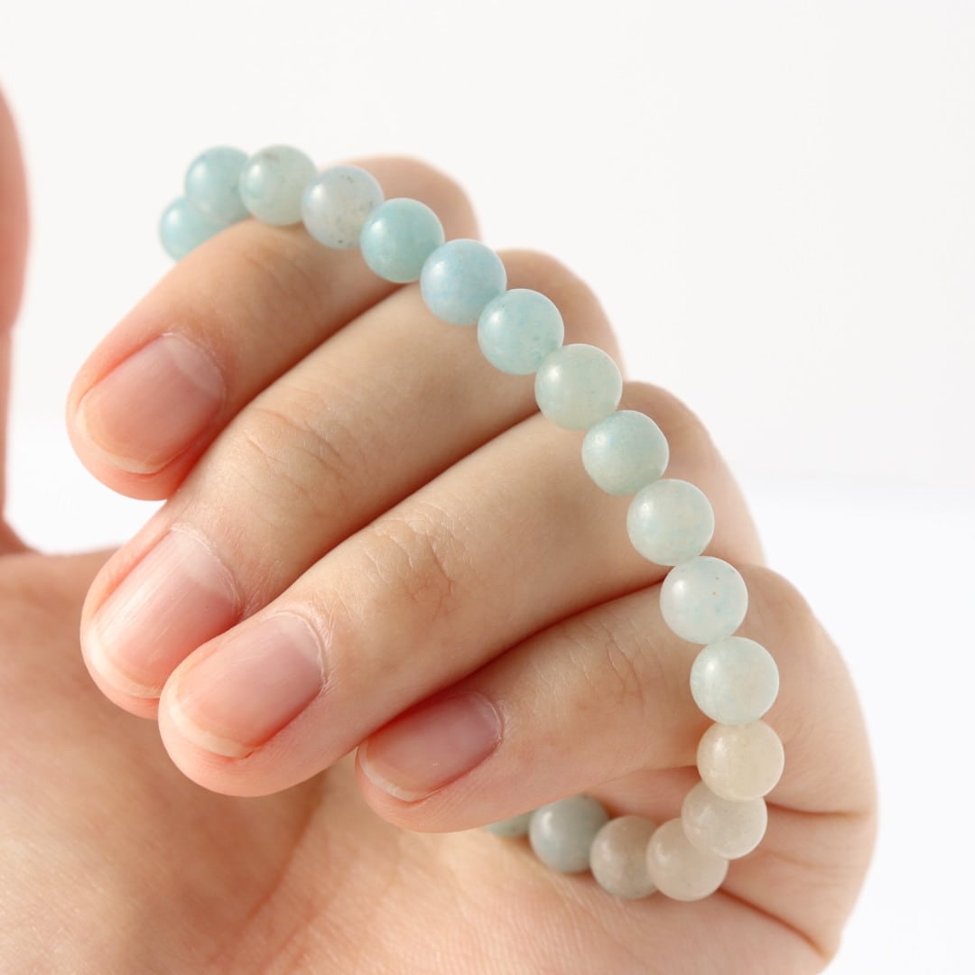 淡いホワイトグレーから鮮やかなスカイブルーへ移ろう、トロレアイトのブレスレット。